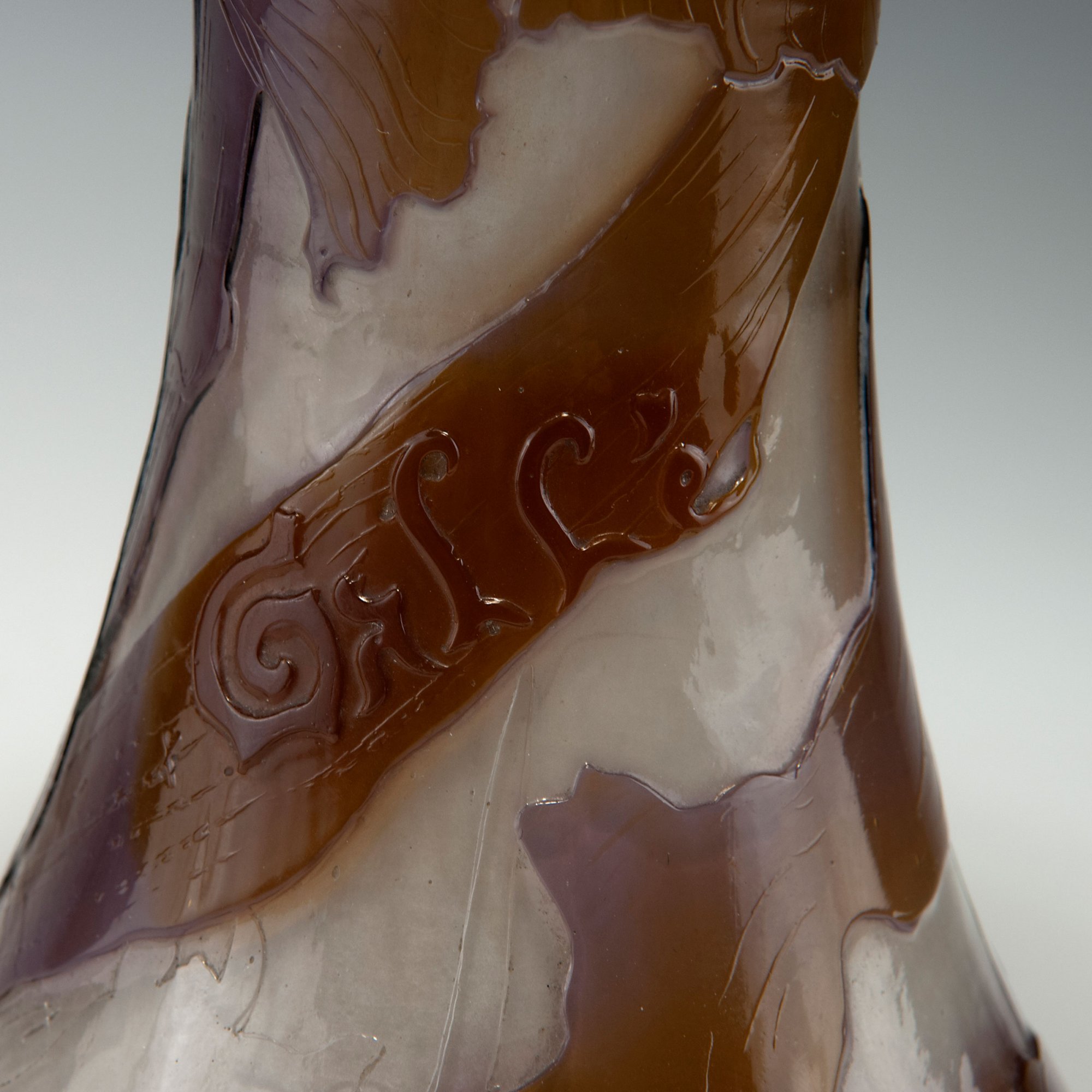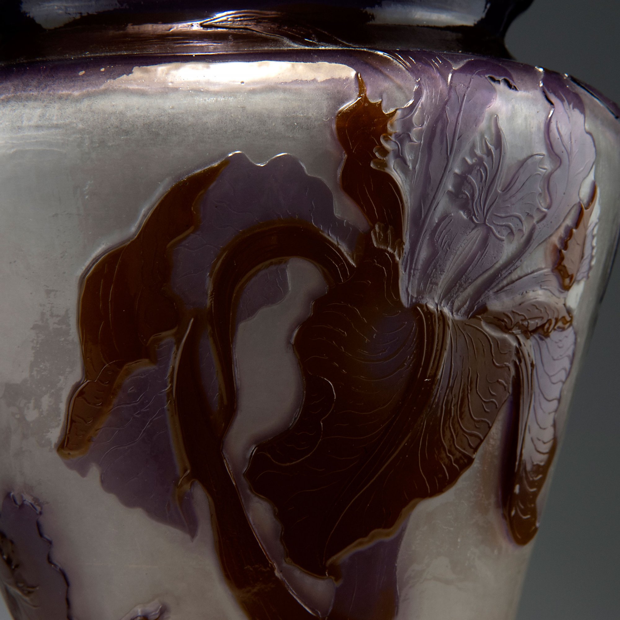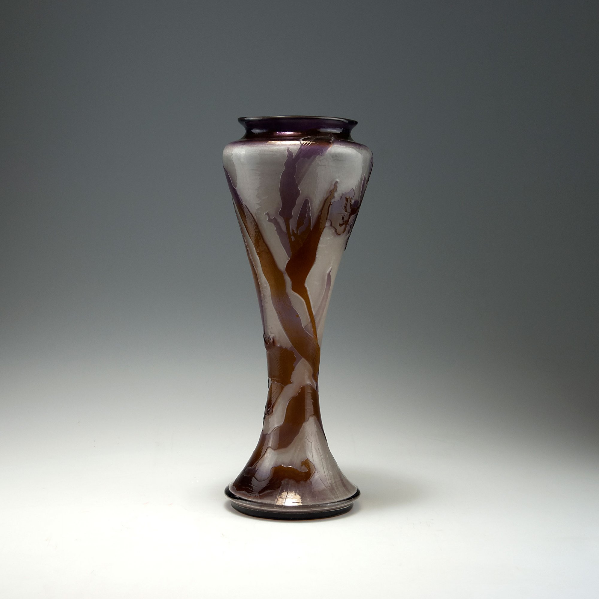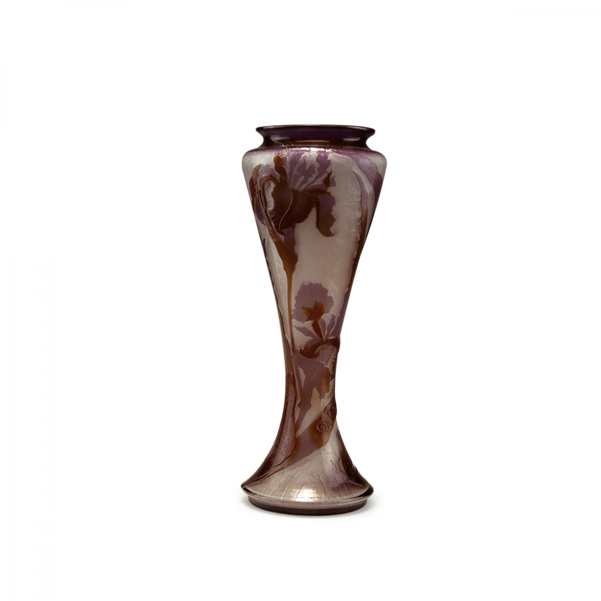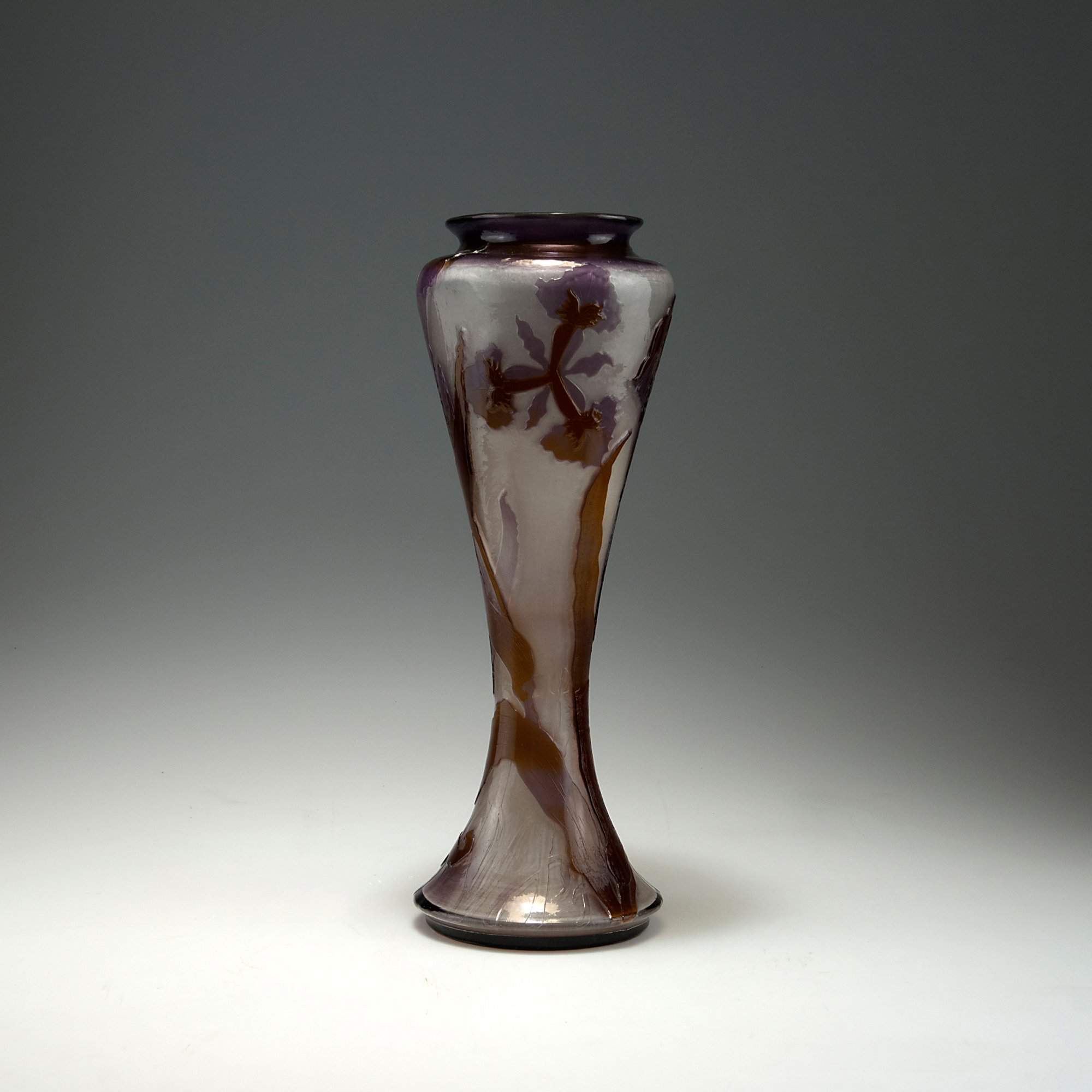 Emile Gallé, Nancy. 'Iris' vase, c1900. H. 40.6 cm. Cased glass, clear, purple and amber. Etched iris pattern, fire-polished. Signed: Gallé, star.
