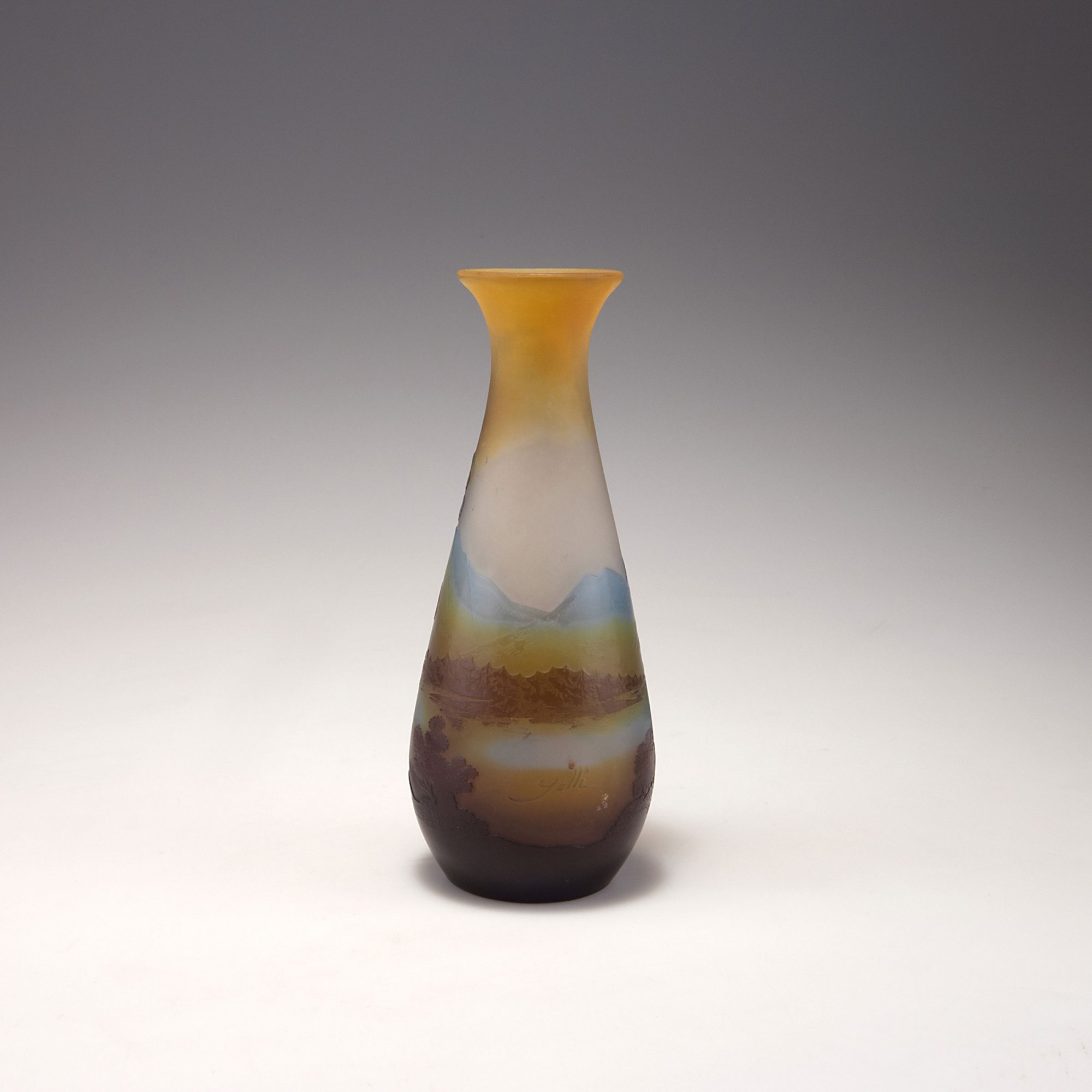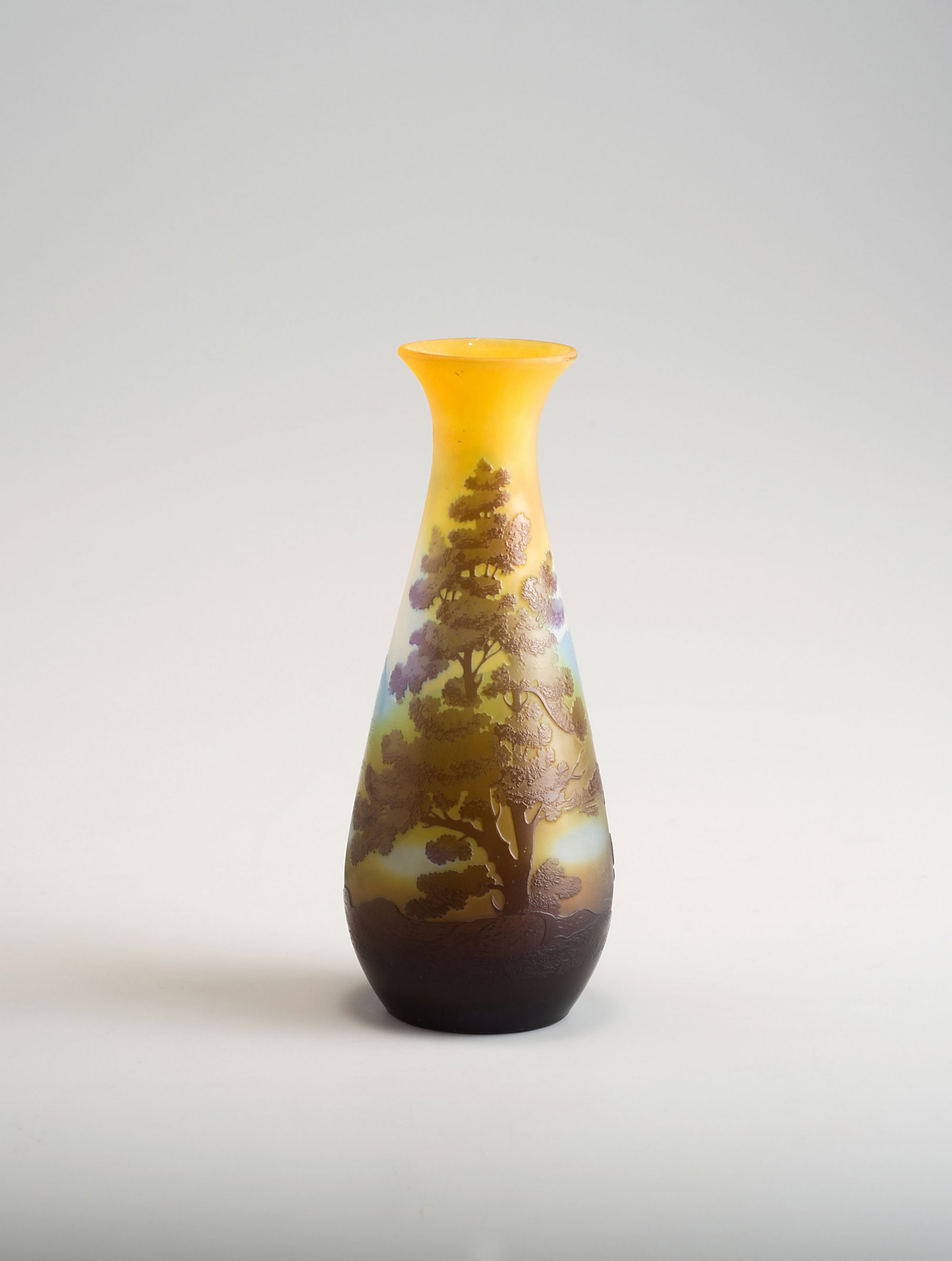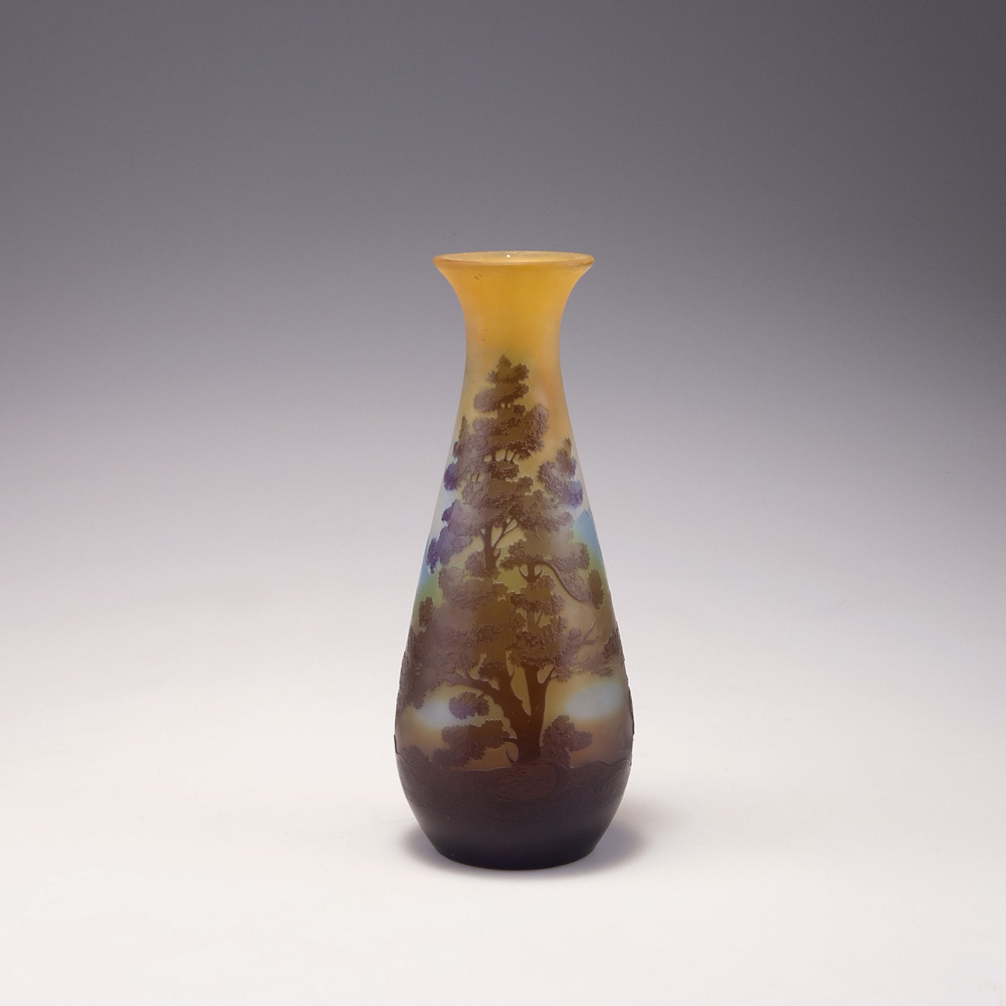 Emile Gallé, Nancy. Vase with Vosges landscape, c1910. H. 19.7 cm. Cased glass, clear, yellow, blue and brown. Multiply etched pattern with pines and a lake. Signed: Gallé.