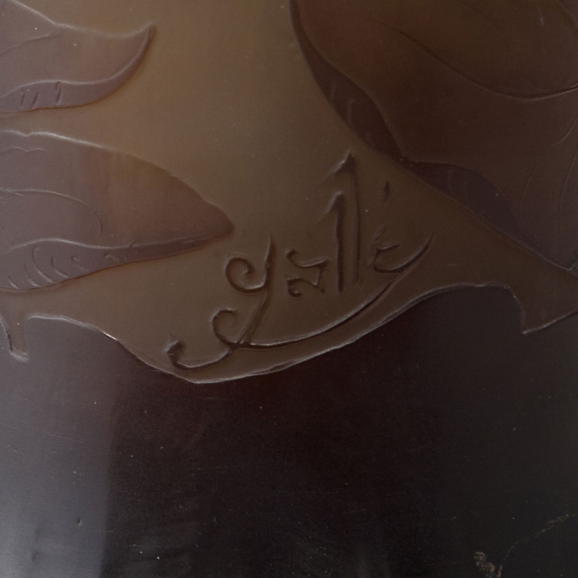 Emile Gallé, Nancy. Large 'Nénuphars et Iris' vase, c1910. H. 59 cm. Cased glass, clear, amber, purple and brown. Etched pattern with lily pond and different kinds of grass, umbels and iris. Signed: Gallé.