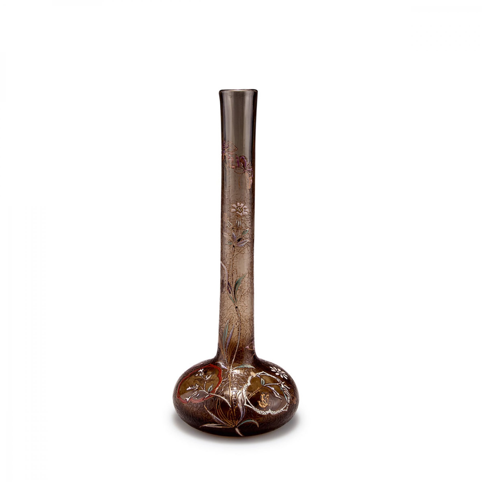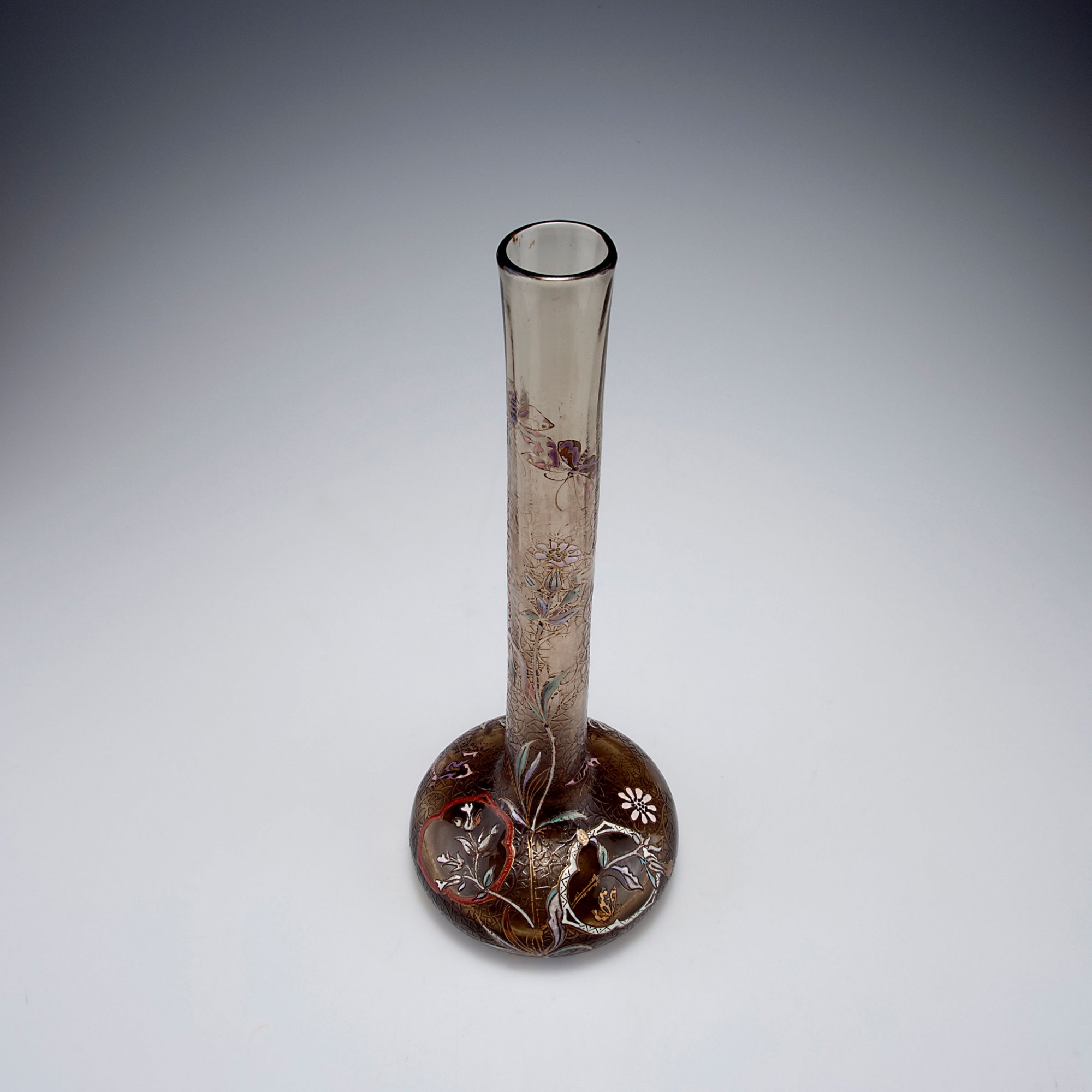 Emile Gallé, Nancy. Vase with cornflowers, c1892. H. 32.6 cm. Smoke coloured glass, ribbed, etched pattern, cornflowers and insects, polychromatic enamel, gold hue. Signed: Emile Gallé.
