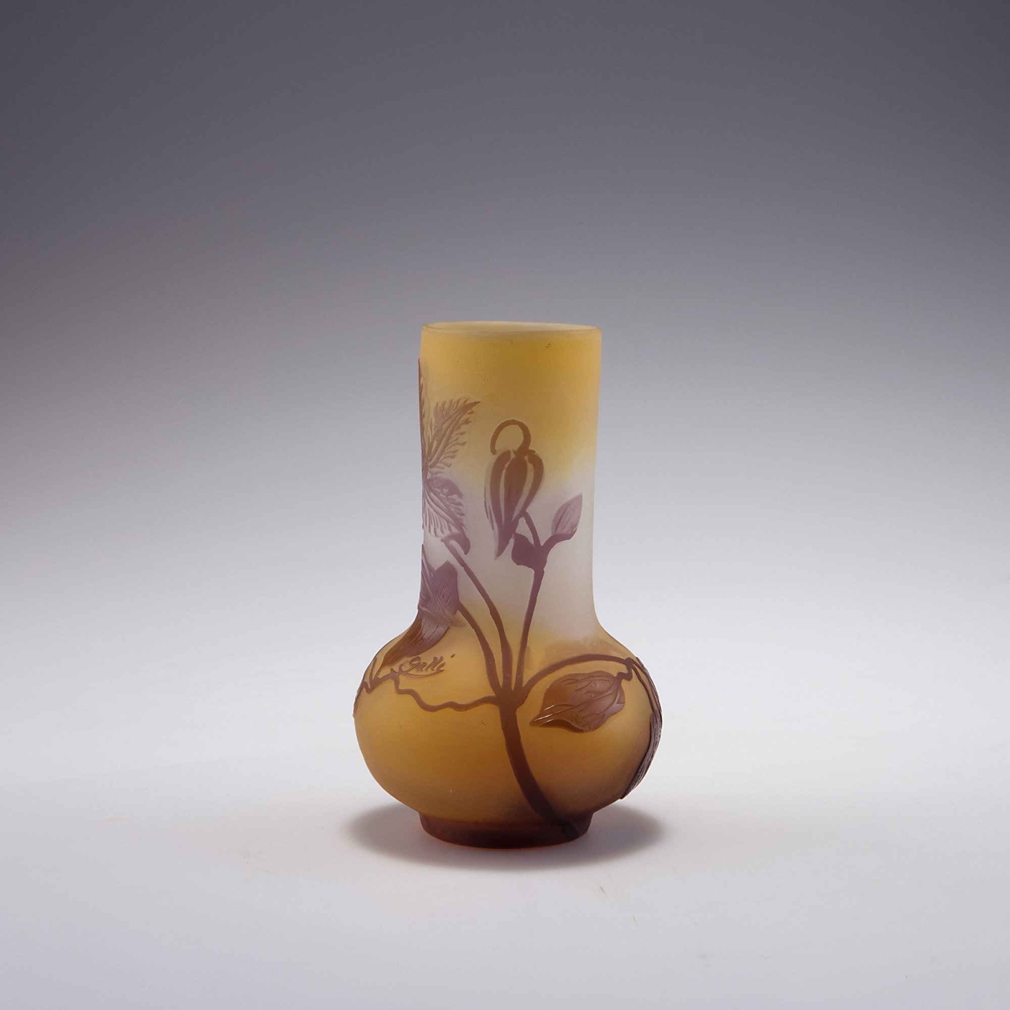 Emile Gallé, Nancy. 'Clématites' vase, 1906-14. H. 15.3 cm. Overlaid glass, clear, yellow and purple. Etched pattern. Marked: Gallé.