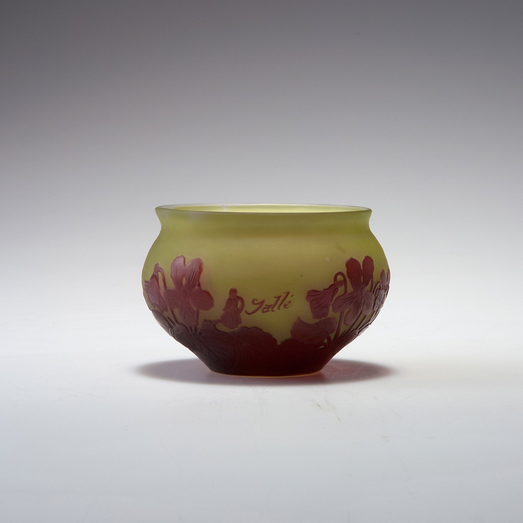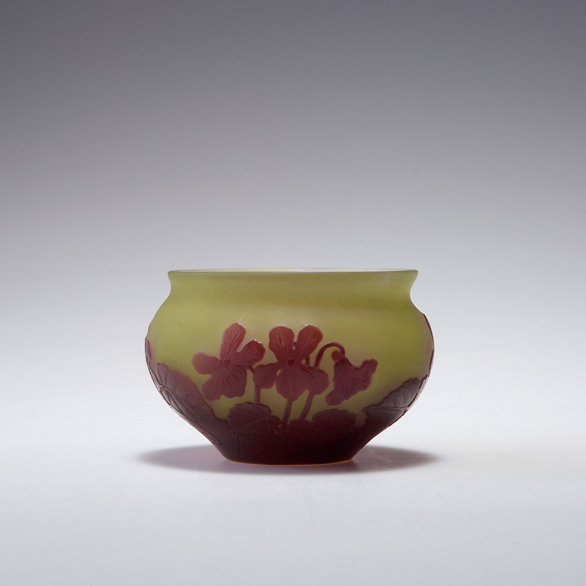 Emile Gallé, Nancy. 'Violettes' vase, c1910. H. 7 cm. Cased glass, clear, green and red. Etched pattern. Violets. Signed: Gallé.