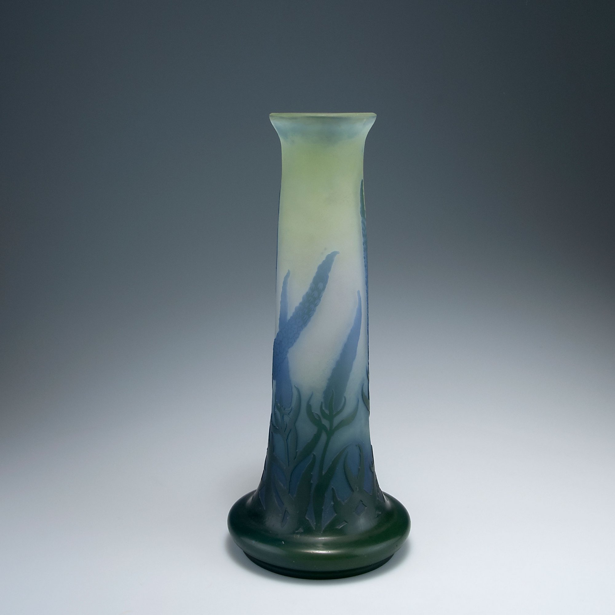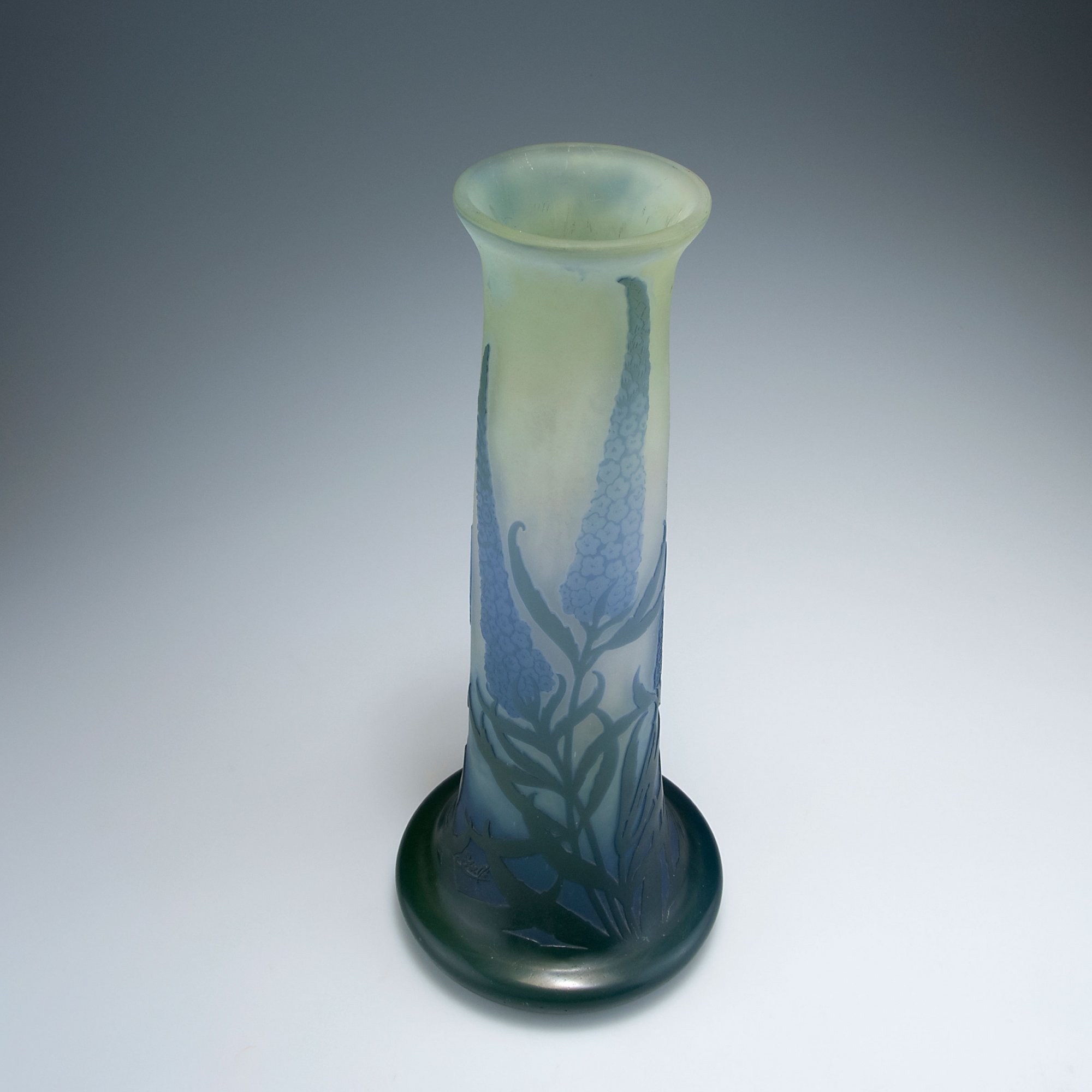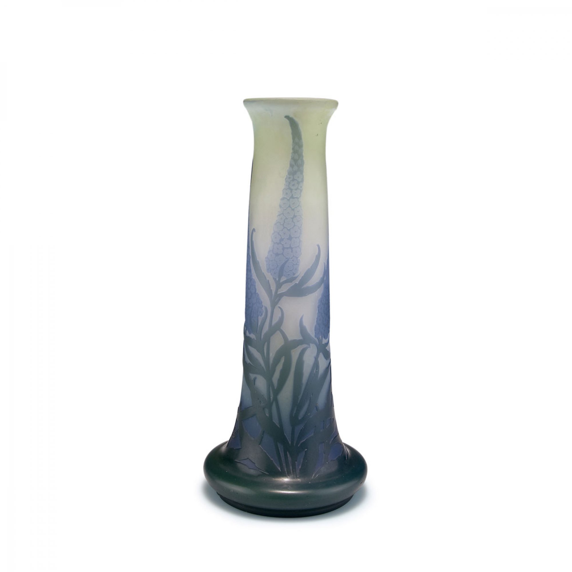 Emile Gallé, Nancy. 'Buddleia' vase, c1910. H. 35.3 cm. Cased glass, clear, green and purple. Multiply etched pattern with buddleia. Signed: Gallé.