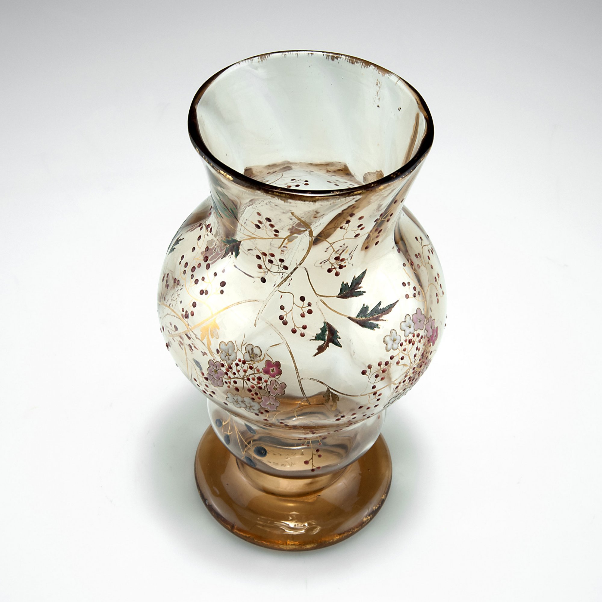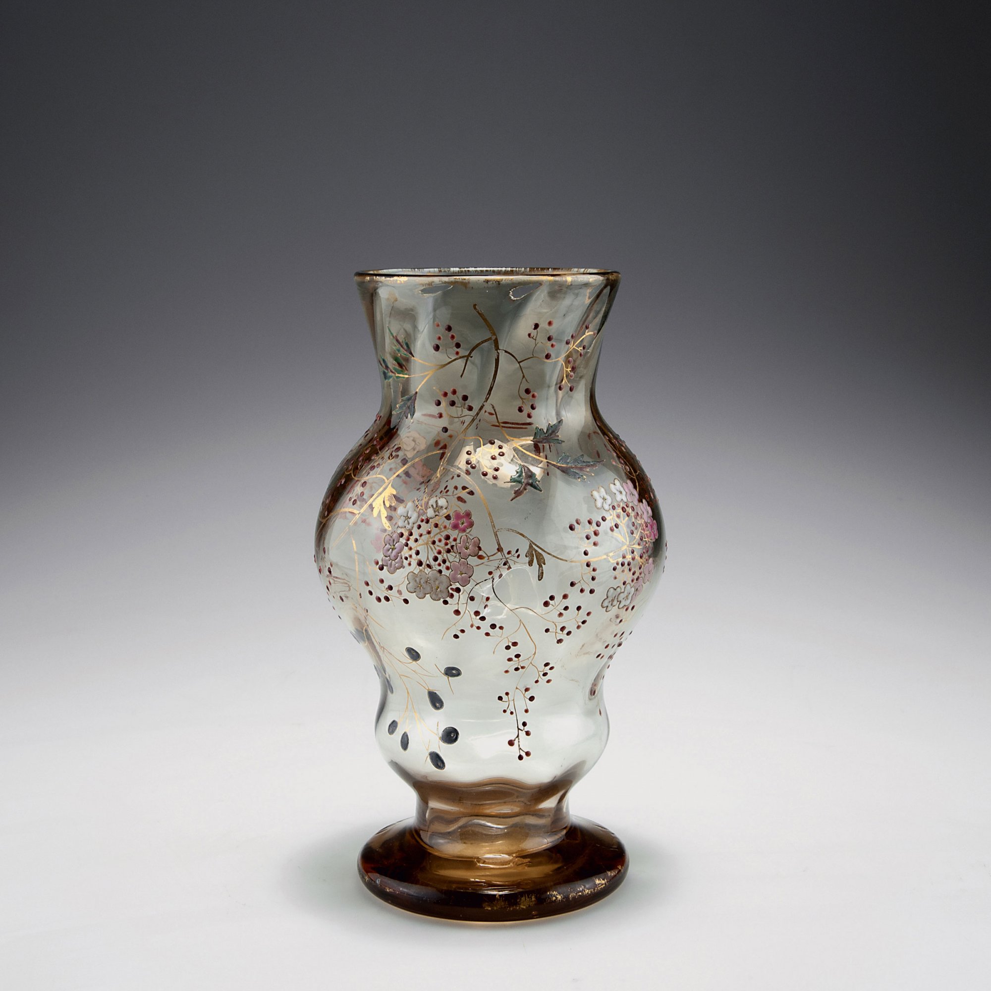Emile Gallé, Nancy. 'Sureau' vase, c1885. H. 23.1 cm. Amber glass, optically blown, enamel, gold hue. Elder pattern. Rim and foot gilded. Signed: E. Gallé à Nancy.
