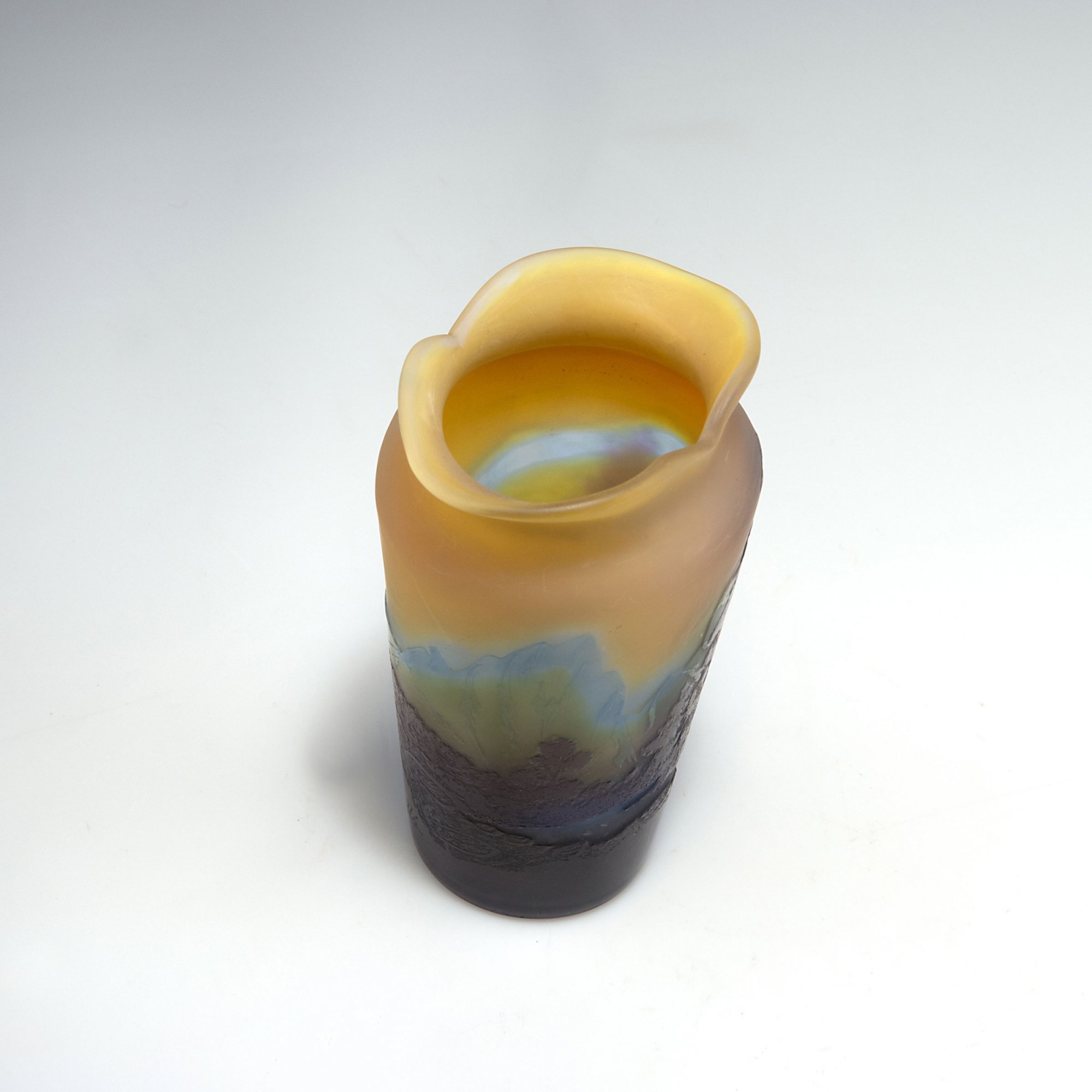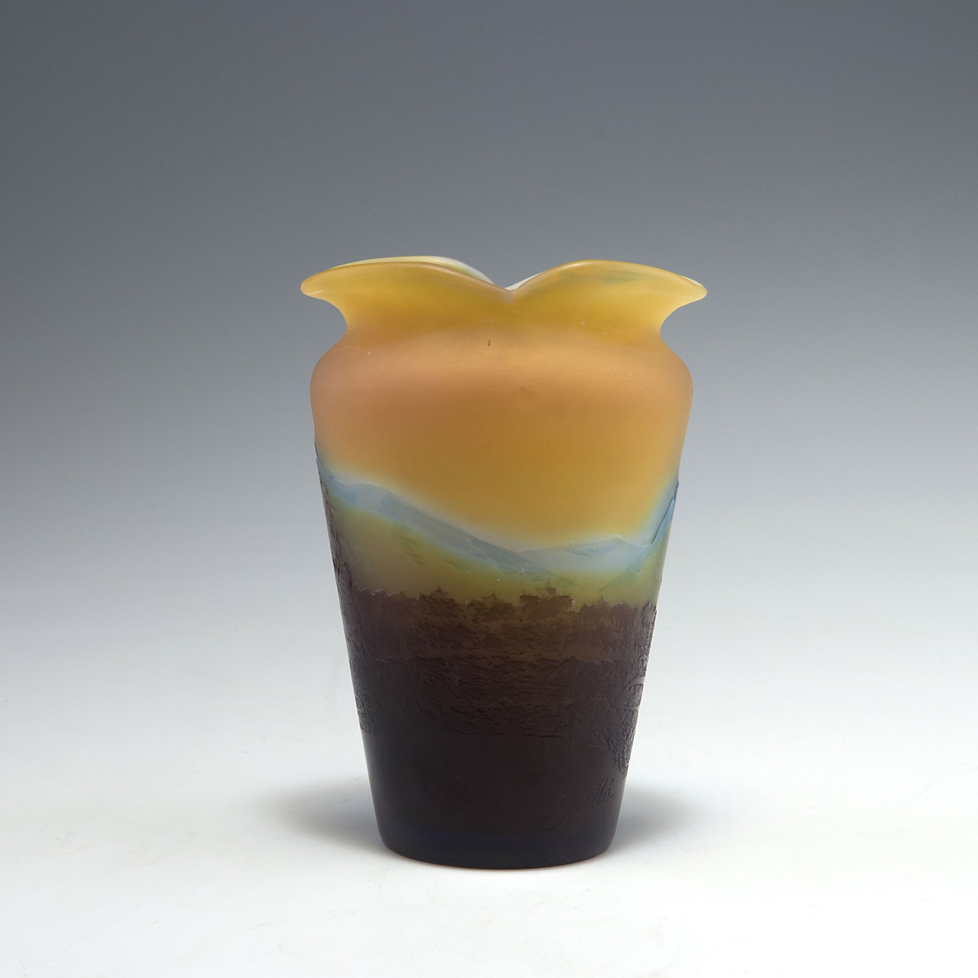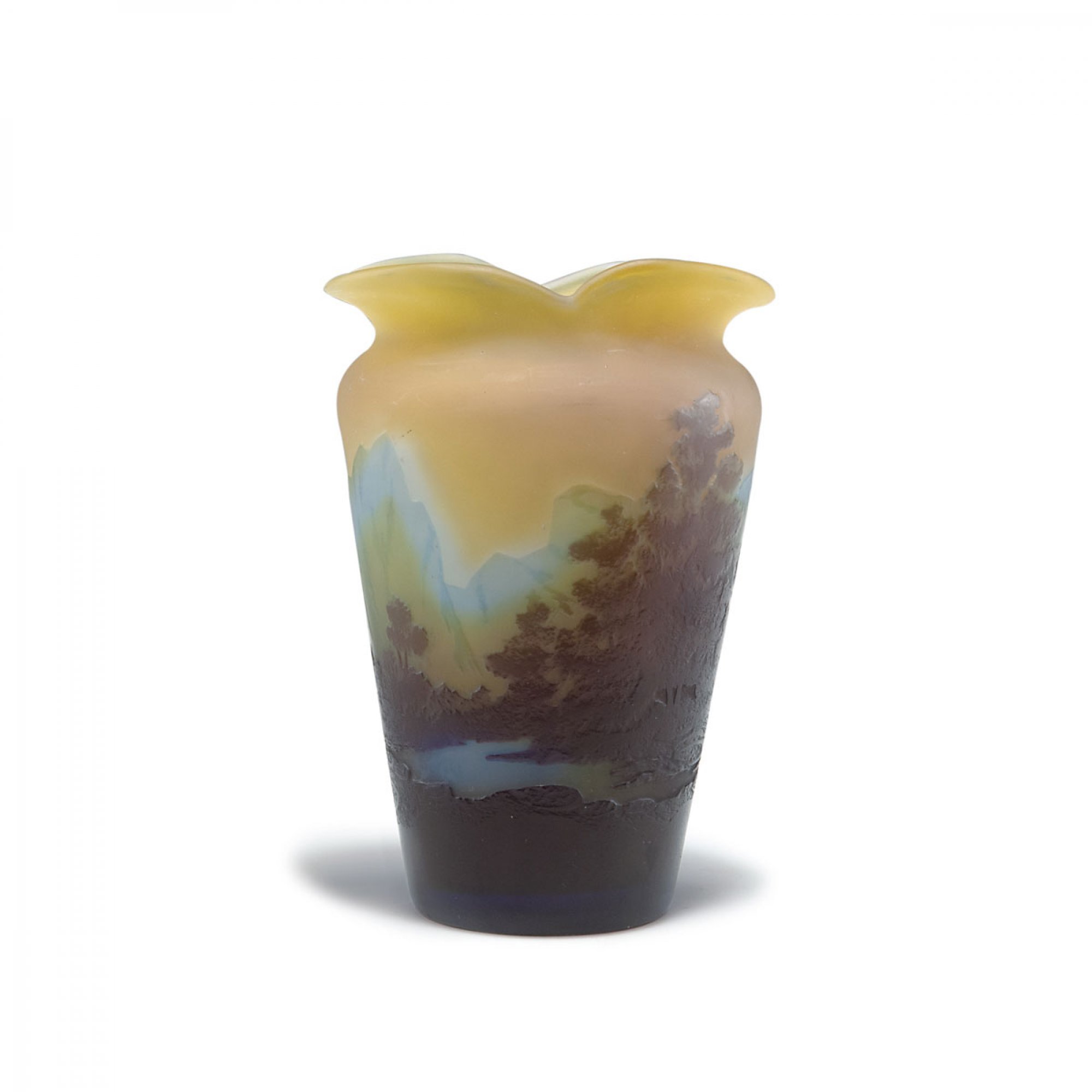 Emile Gallé, Nancy. 'Paysage' vase, c1910. H. 13.6 cm. Cased glass, clear, yellow, blue and purple. Multiply etched pattern with mountain landscape, lake and trees. Signed: Gallé.