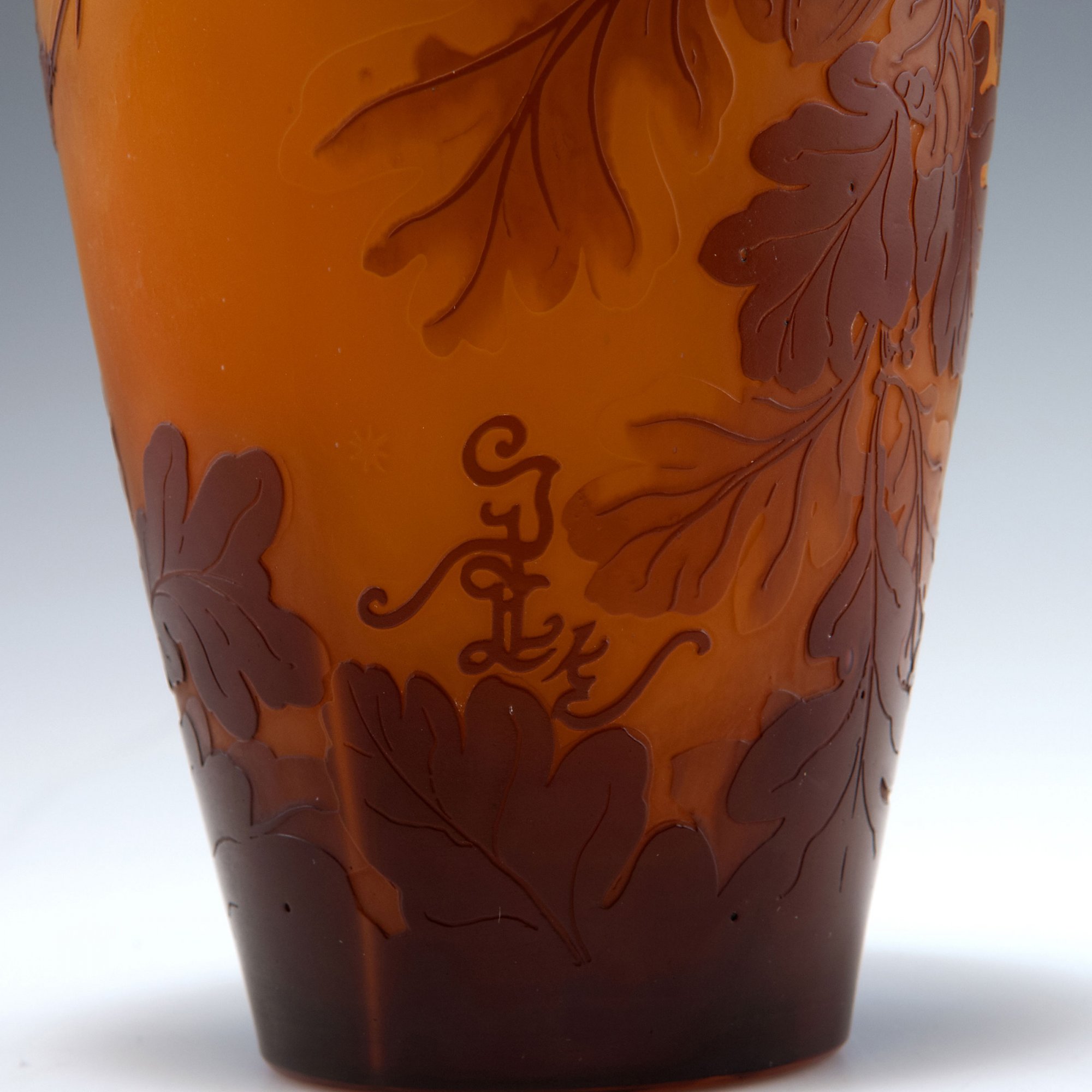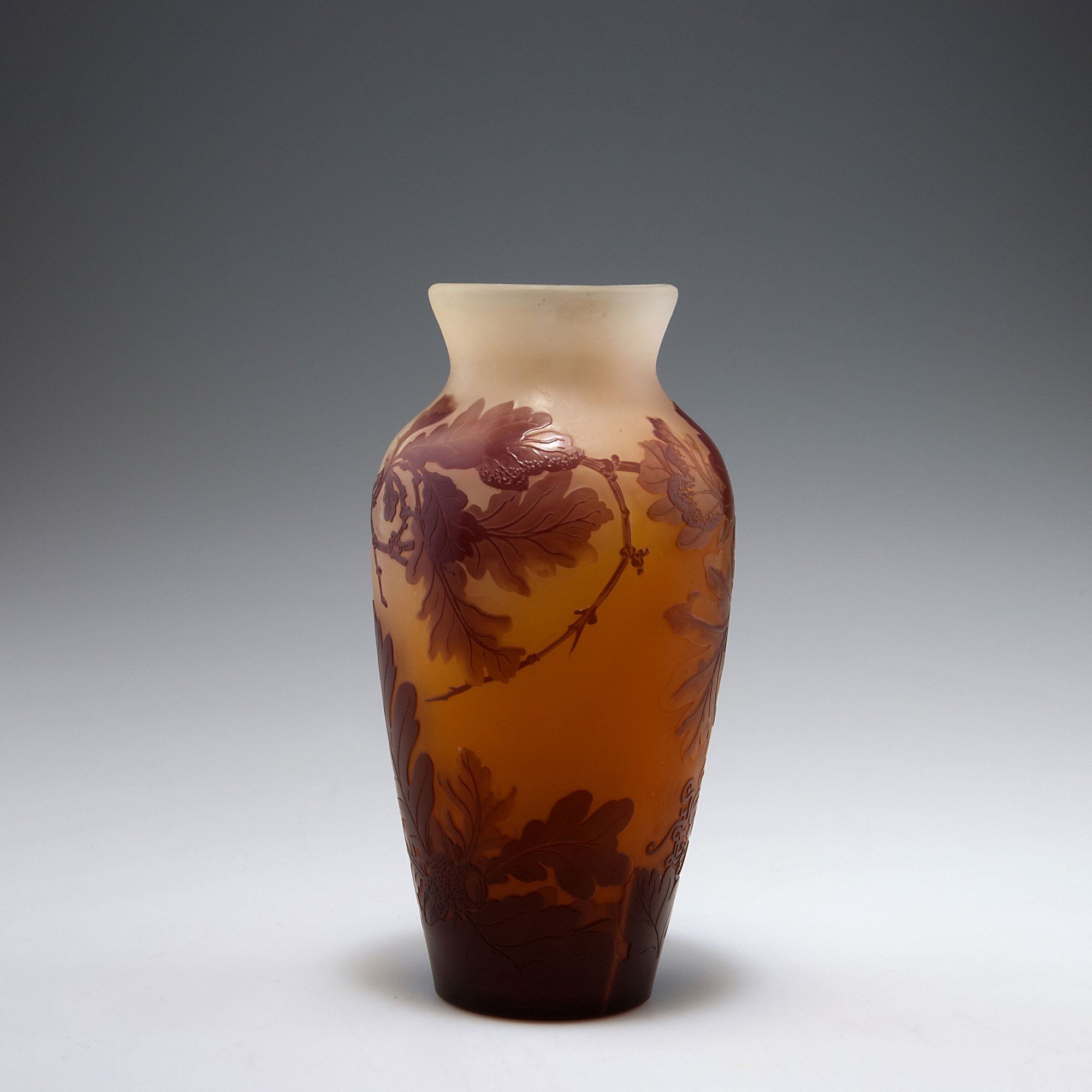 Emile Gallé, Nancy. 'Chêne' vase, 1903/04. H. 20.6 cm. Cased glass, clear, pale yellow, orange and purple. Etched pattern, oak branches. Signed: Gallé.