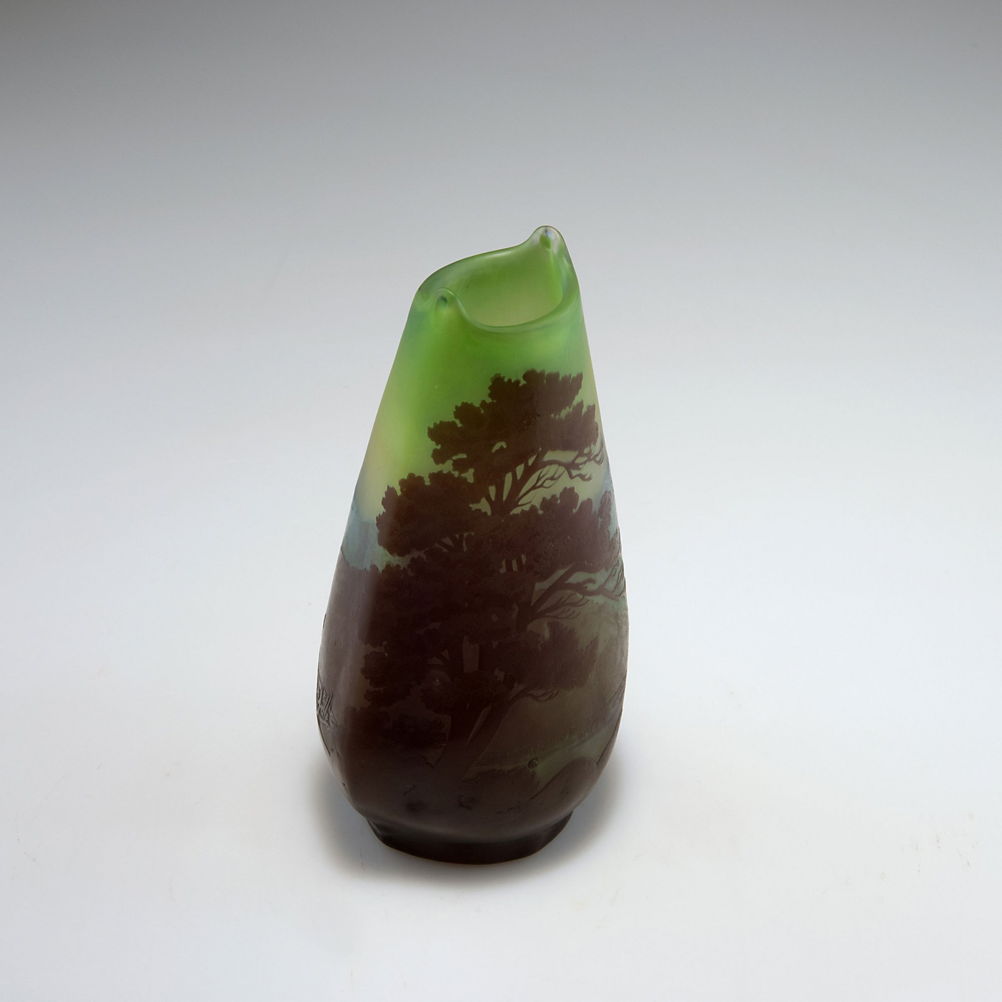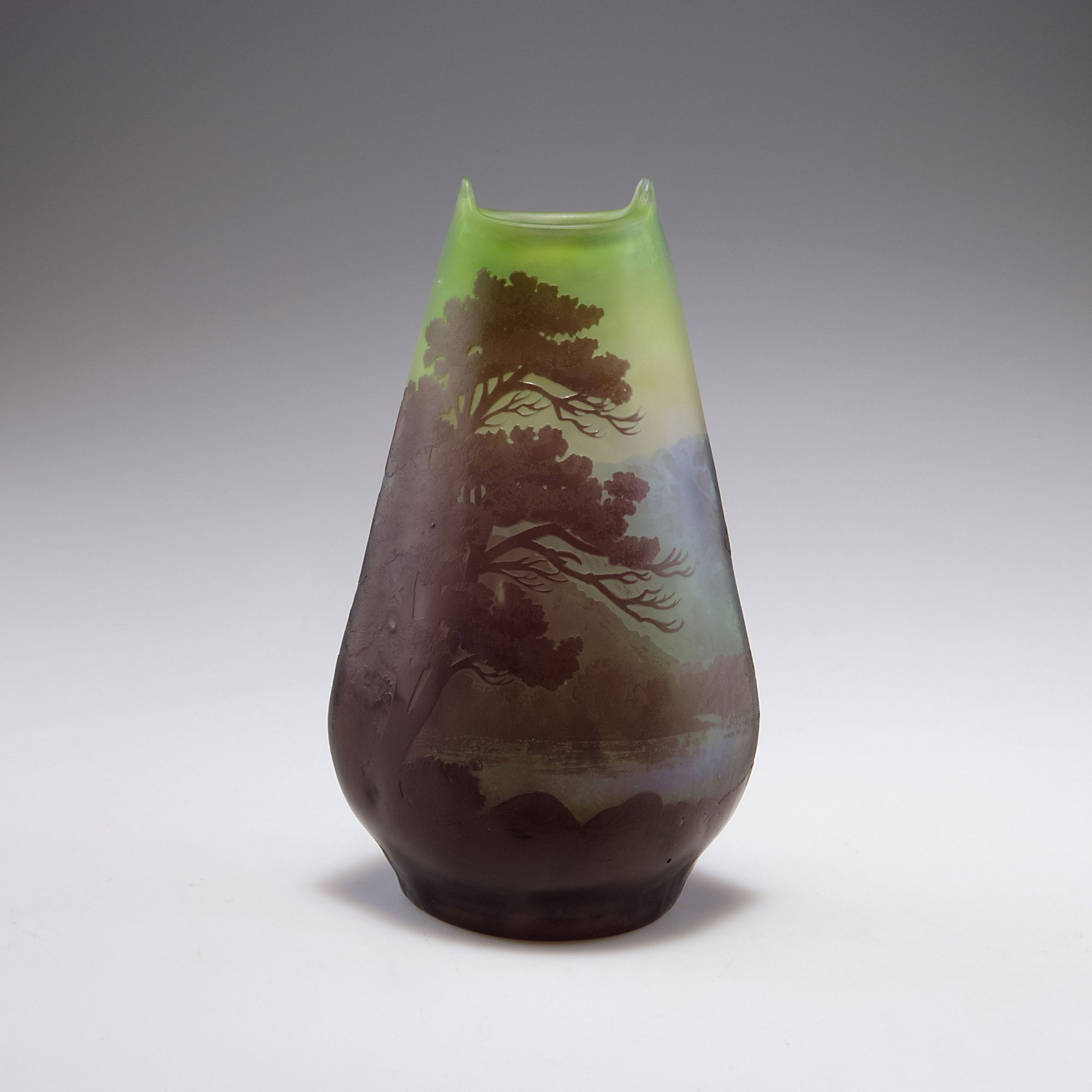 Emile Gallé, Nancy. 'Paysage' vase, c1910. H. 20.5 cm. Cased glass, clear, green and purple. Landscape with trees and lake. Signed: Gallé.