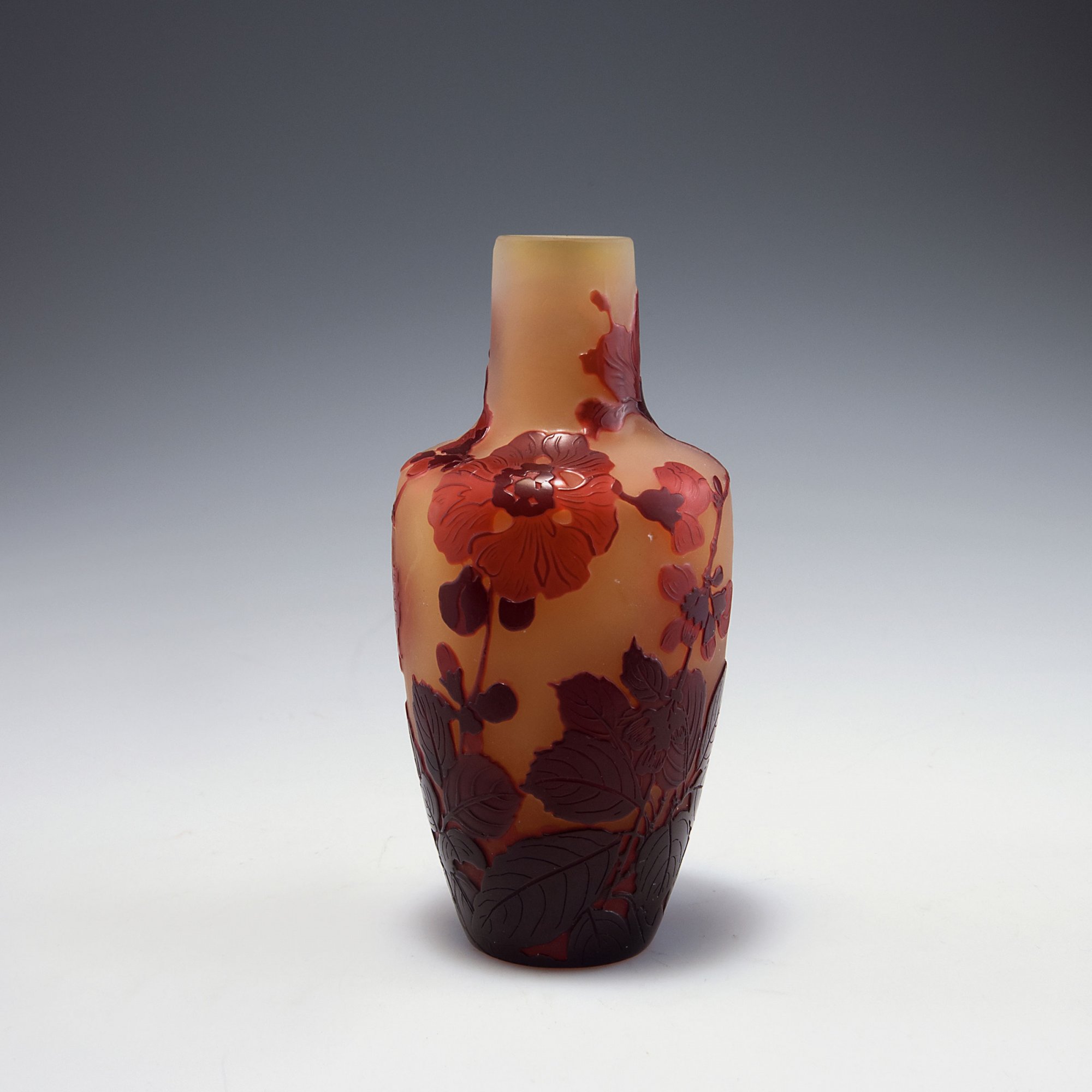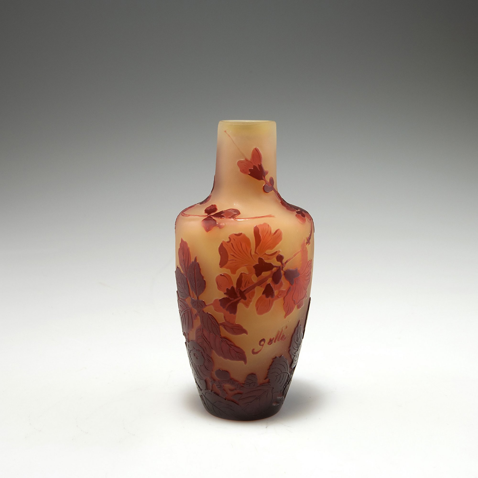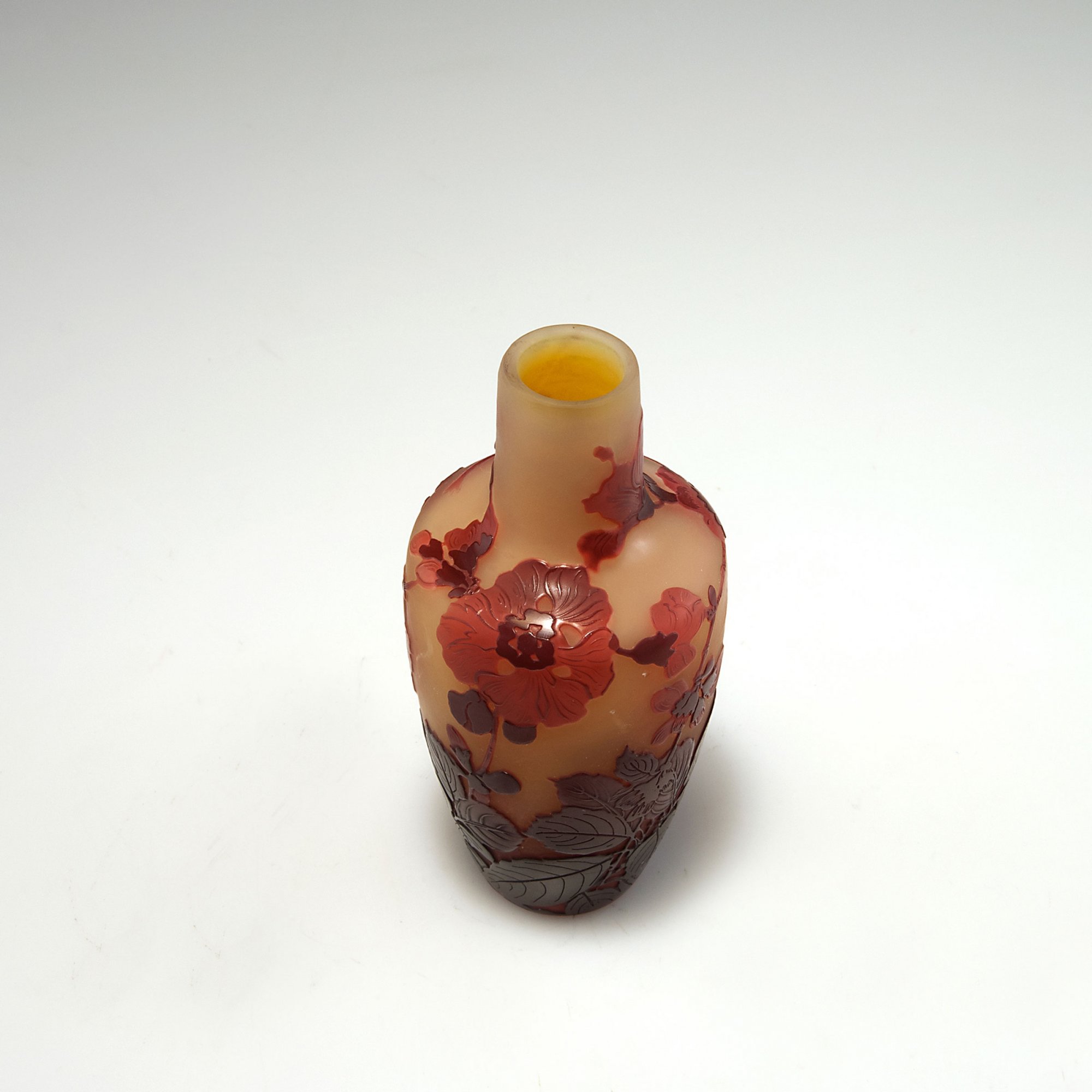 Emile Gallé, Nancy. 'Cognassier du Japon' vase, 1919-24. H. 15.2 cm. Cased glass, pale amber, clear and claret red. Multiply etched pattern with Japanese quince (chaenomeles). Signed: Gallé.