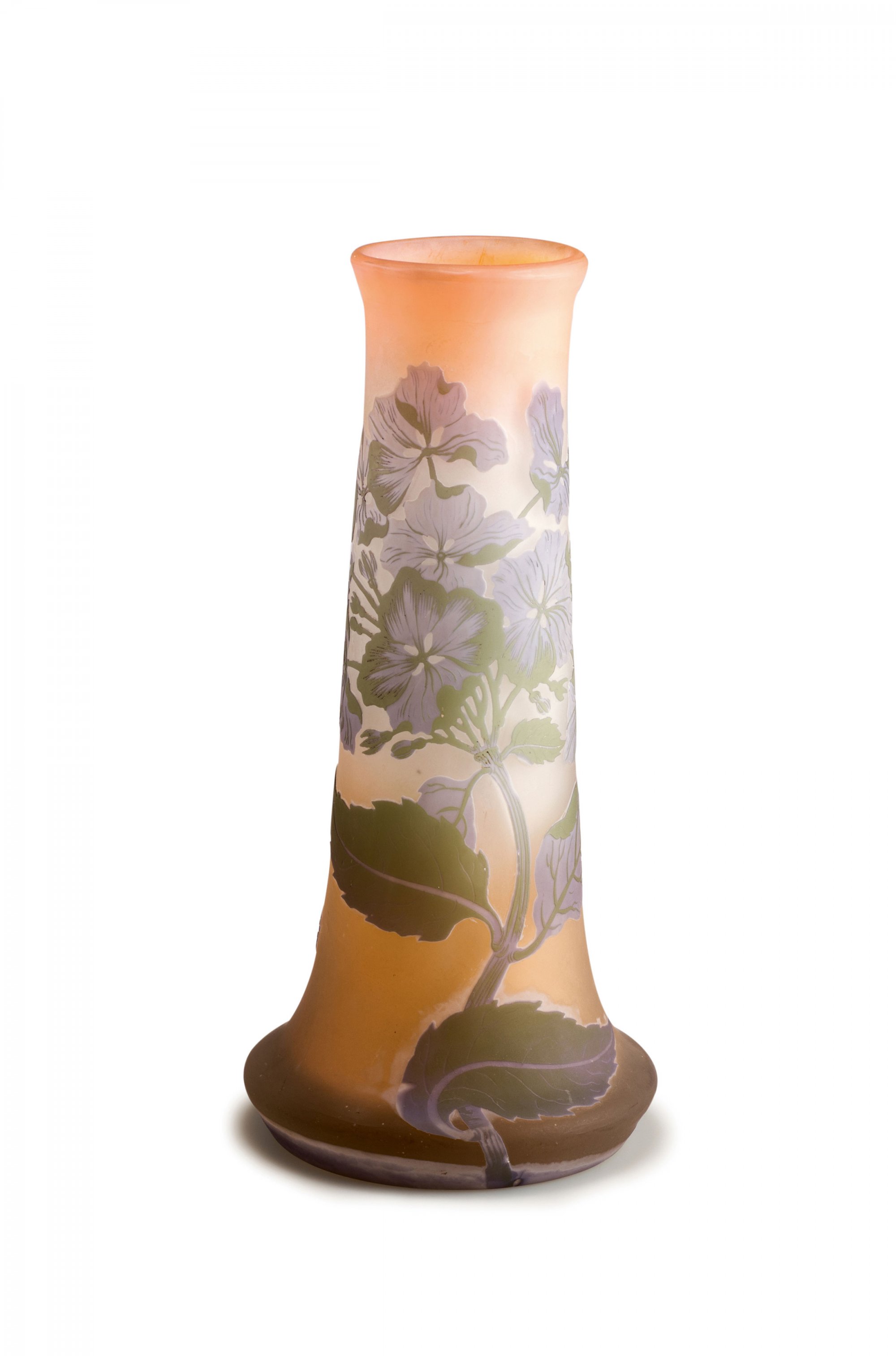 Emile Gallé, Nancy. Vase with hydrangeas, 1904-05. H. 45 cm. Glass, clear, part milky salmon pink, milky white, violet and grey green. Etched décor. Signed: Gallé with asterisk.