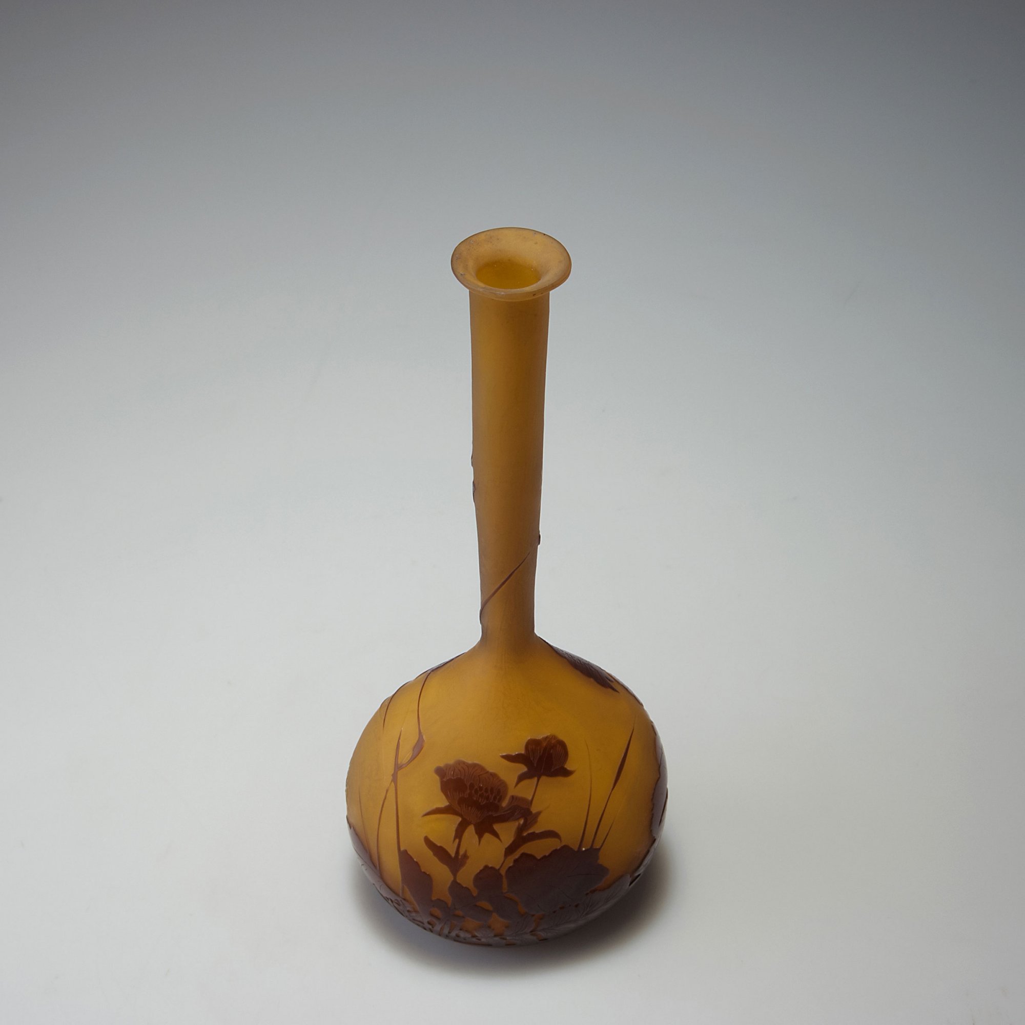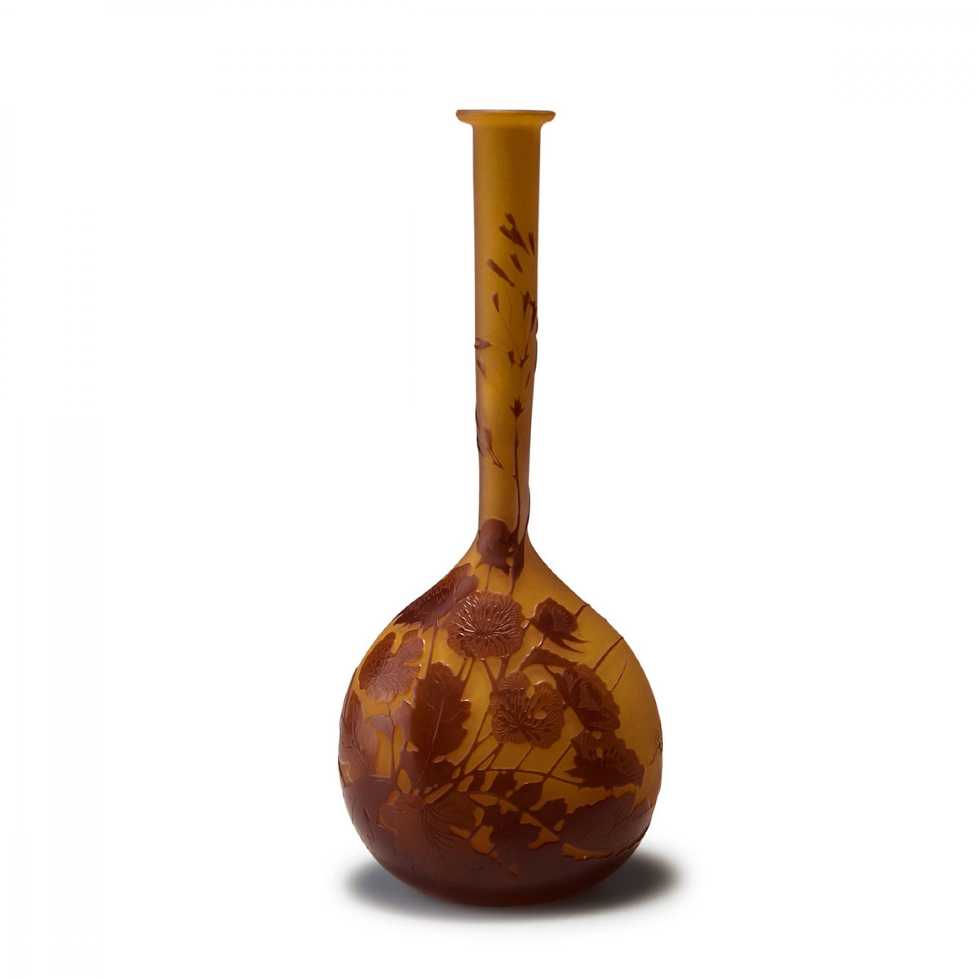 Emile Gallé, Nancy. 'Bouton d'or' vase, 1902-03. H. 26.7 cm. Cased glass, orange, clear and dark red. Multiply etched pattern with cockscrow at dusk. Signed: Gallé.
