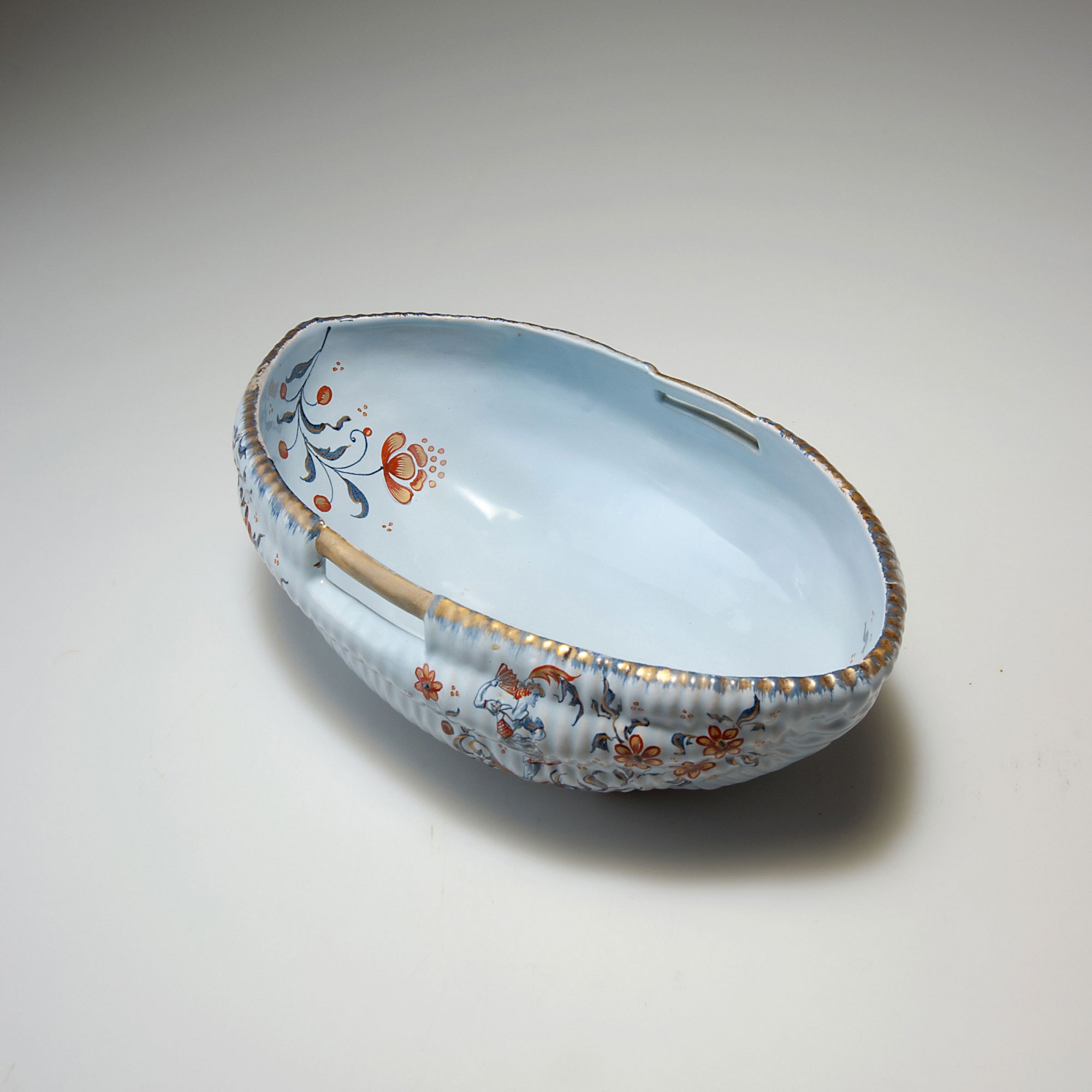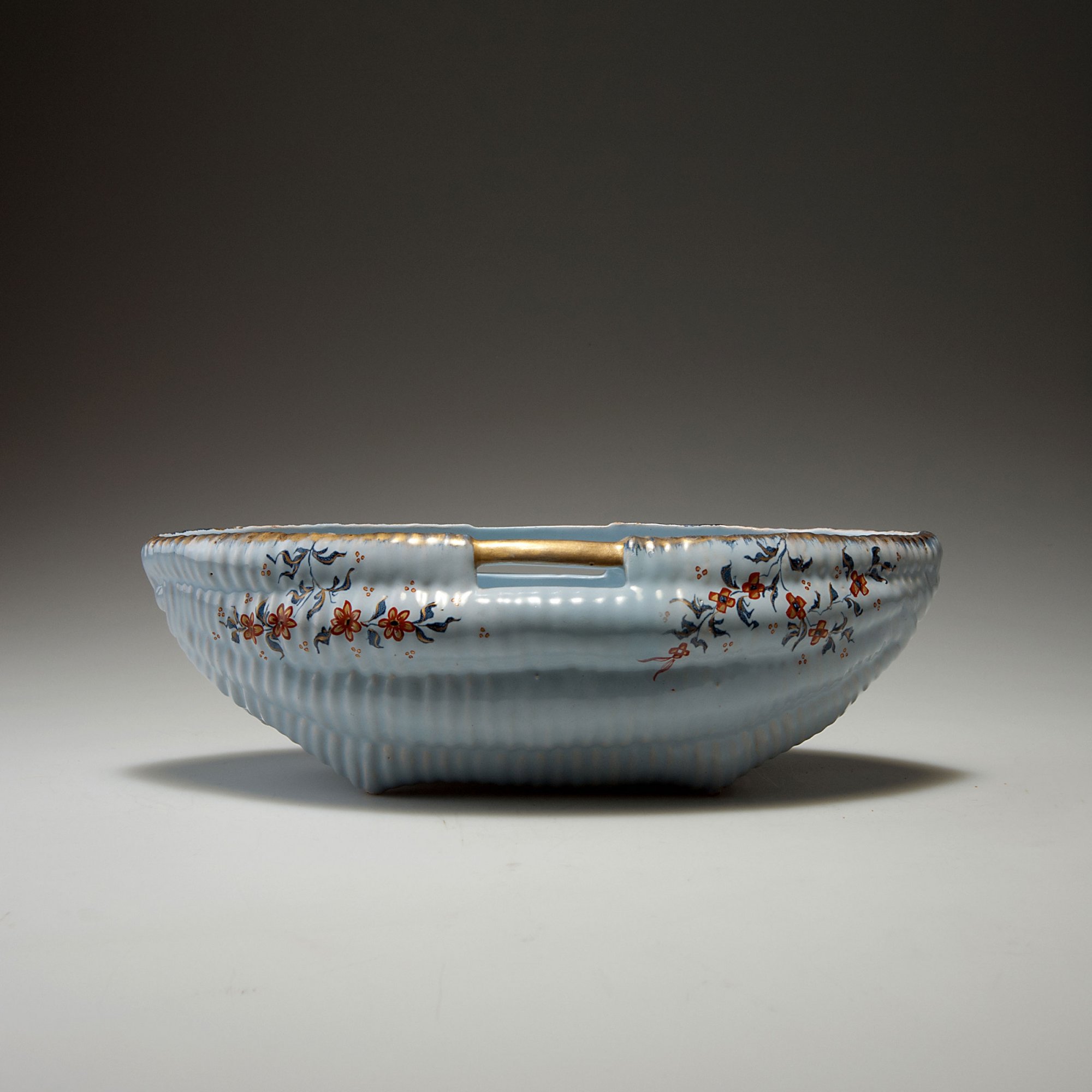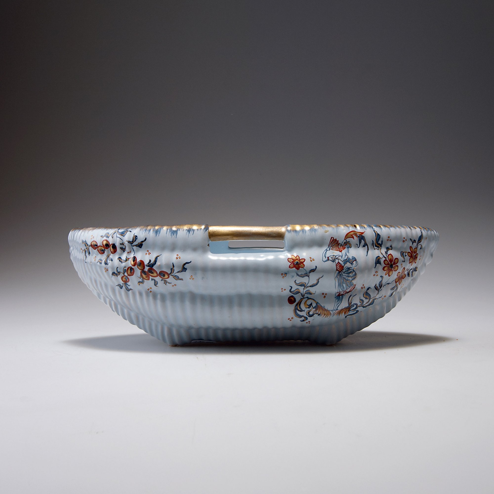 Emile Gallé, Nancy. Bread basket, c1880. H. 8.8 cm; 27.6 x 17.1 cm. Faience, so-called 'terre de Lorraine', blue tin glaze. Flowers, figurine of a lady with hat and fan. Gold-hue. Signed: E. Gallé Nancy.