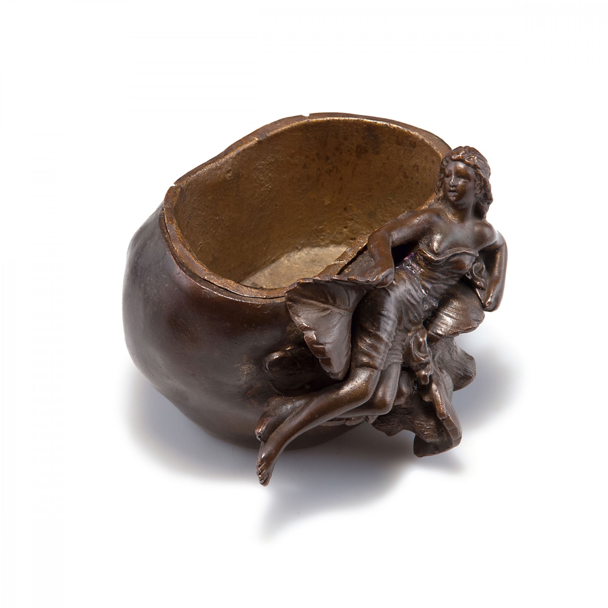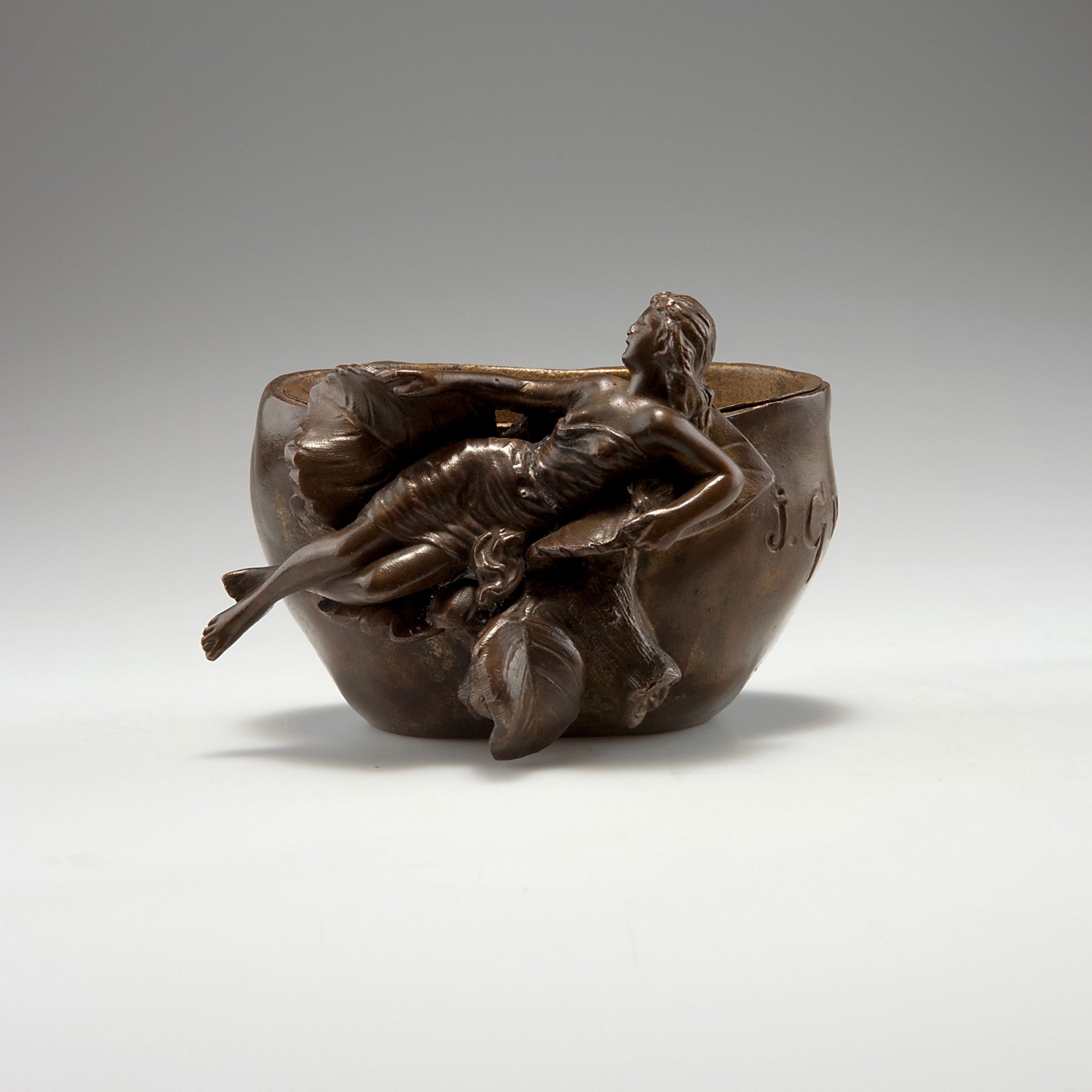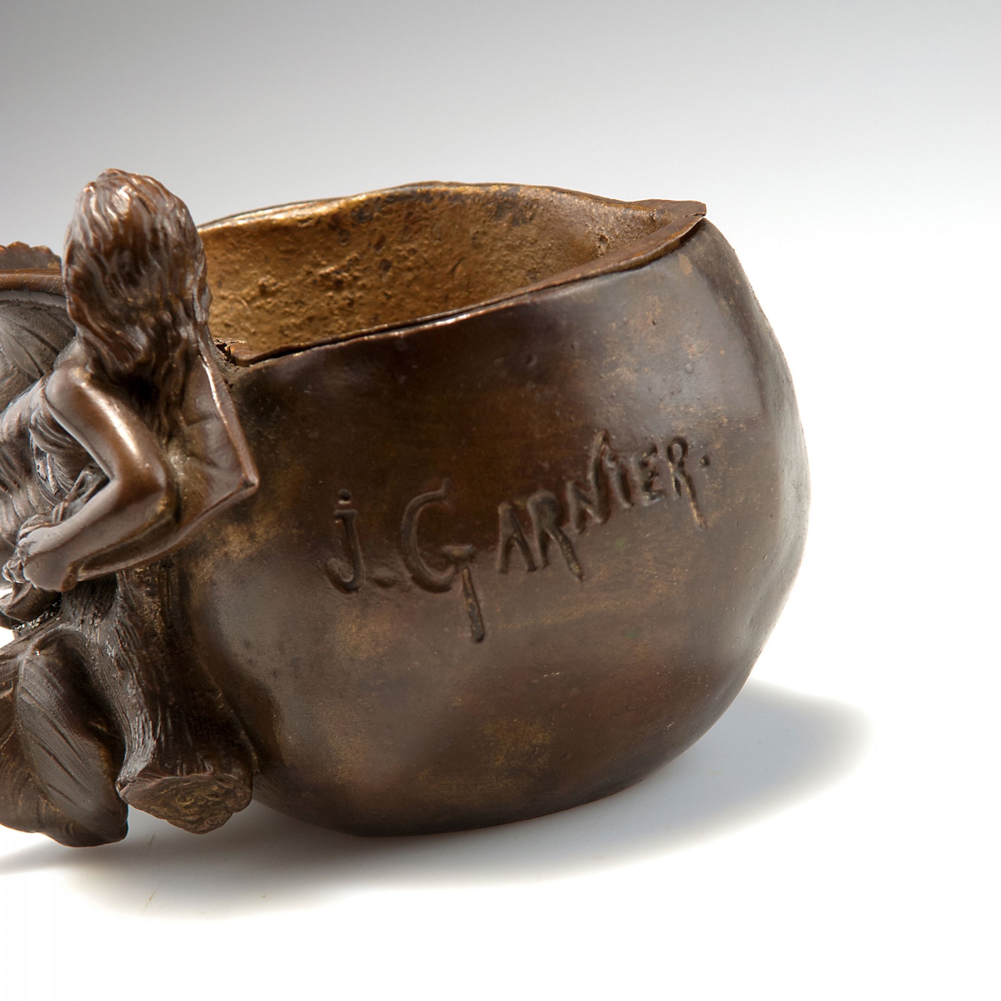 Jean Garnier. Flowerpot, c1890. H. 9.2 cm; 12.5 x 11.5 cm. Made probably in the 1920s. Cast metal, brown patina. Inside and inset gilt. Marked: J. GARNIER.