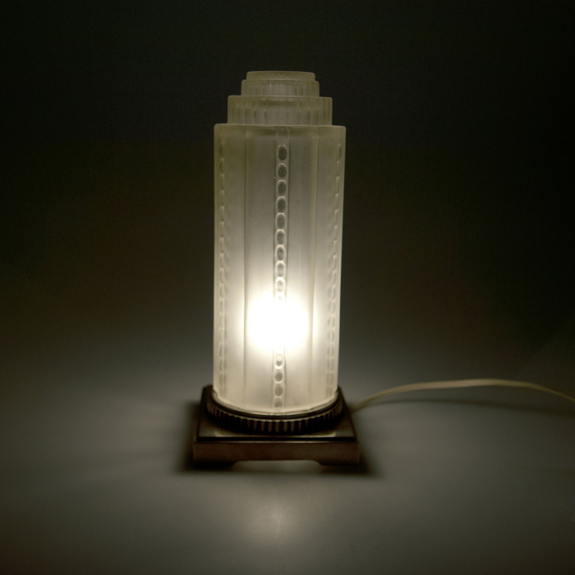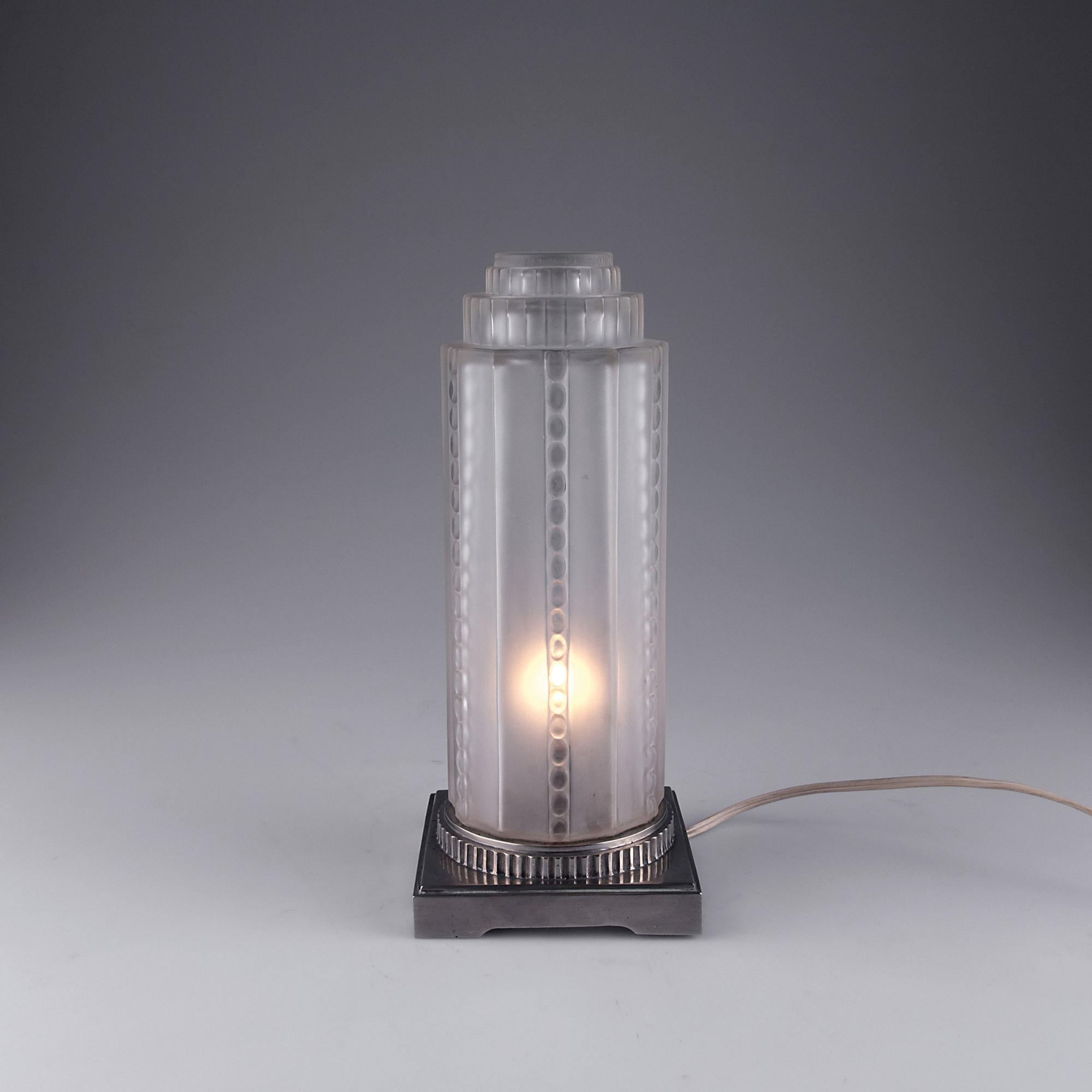 Genêt & Michon, Paris. Table light, c1925. H. 29.1 cm. Clear moulded glass, reliefed and satinated. Nickel-plated brass base. Shade marked: GENET & MICHON FRANCE.