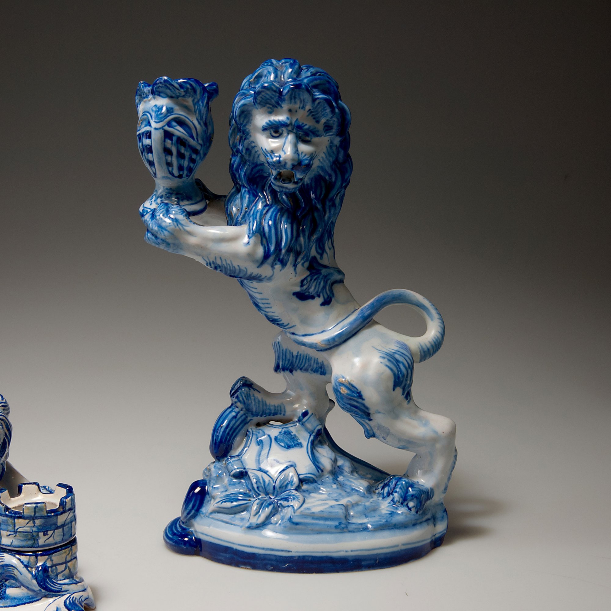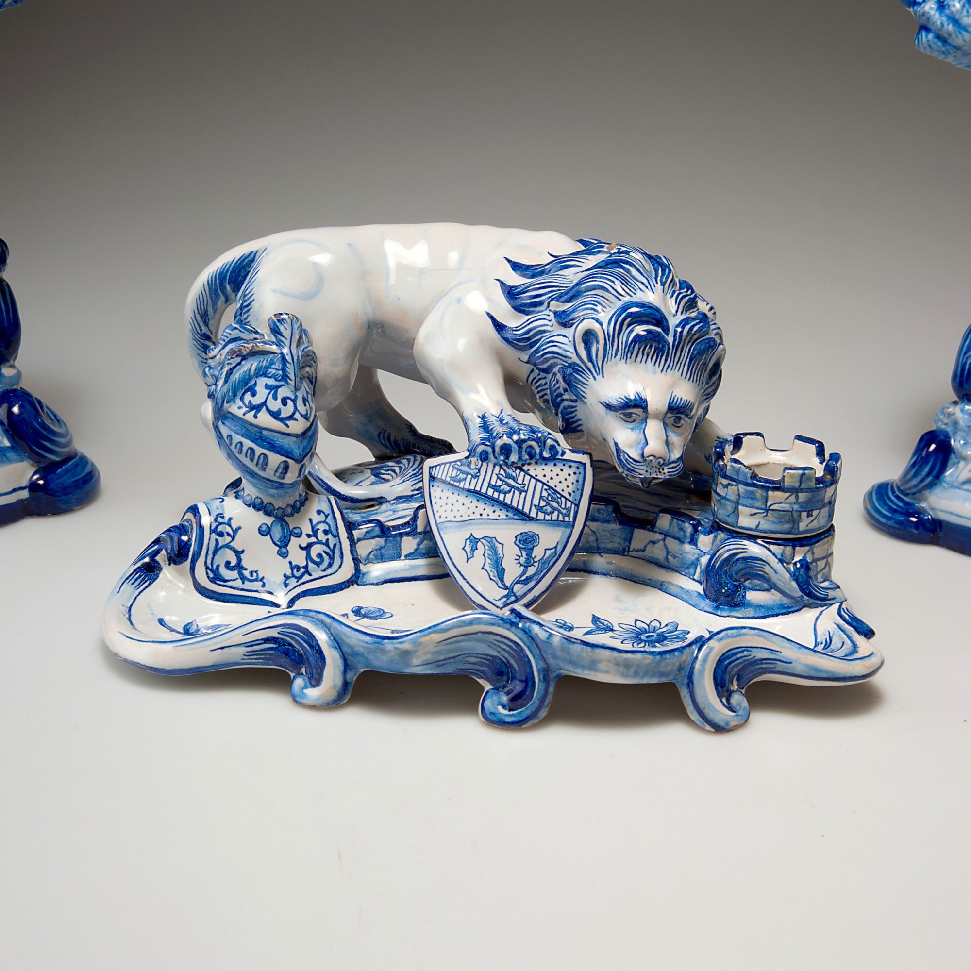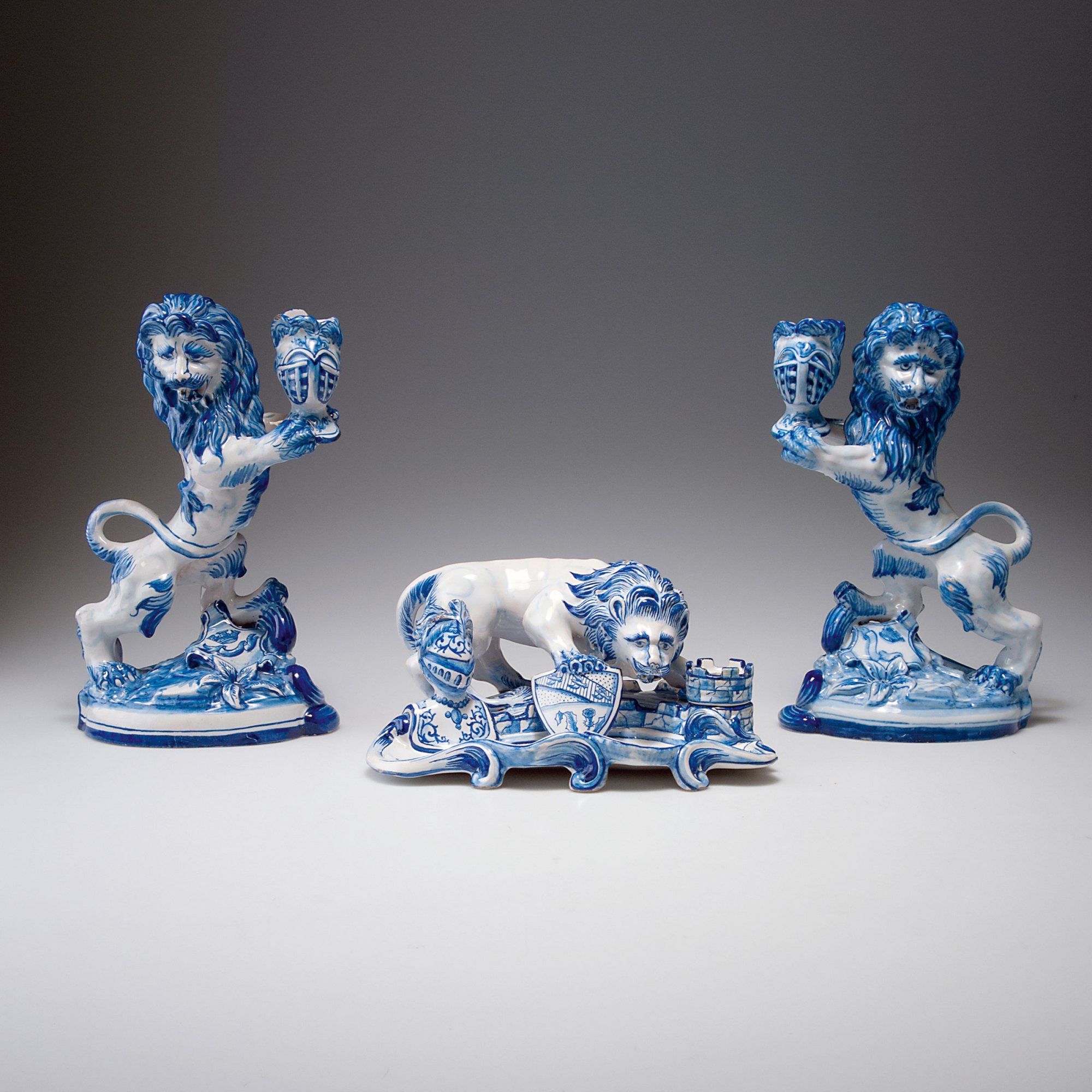 Emile Gallé, Nancy. Desk set, two 'Lions' candlesticks and an inkwell, c1870. Candlesticks, H. 27.5-28.2 cm; inkwell, H. 11.5 cm; 24.7 x 19.5 cm. Designed by Gengoult Prouvé (attributed). Made c1892. Faience, white, tin glaze, cobalt pattern. Inkwell inscribed: SC, K & G, 12; lions: St. Cl., cross of Lorraine, MG, St. Clément.