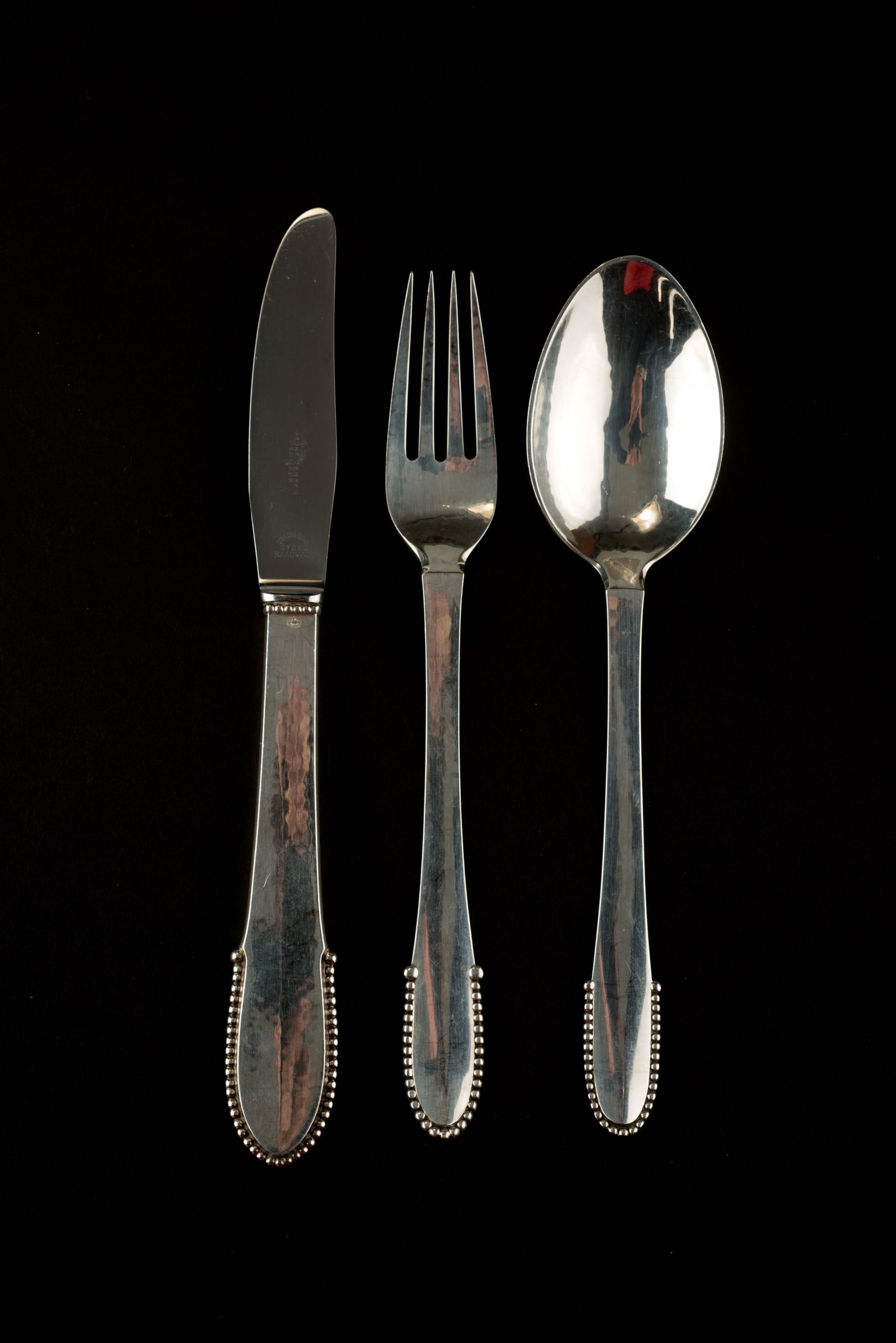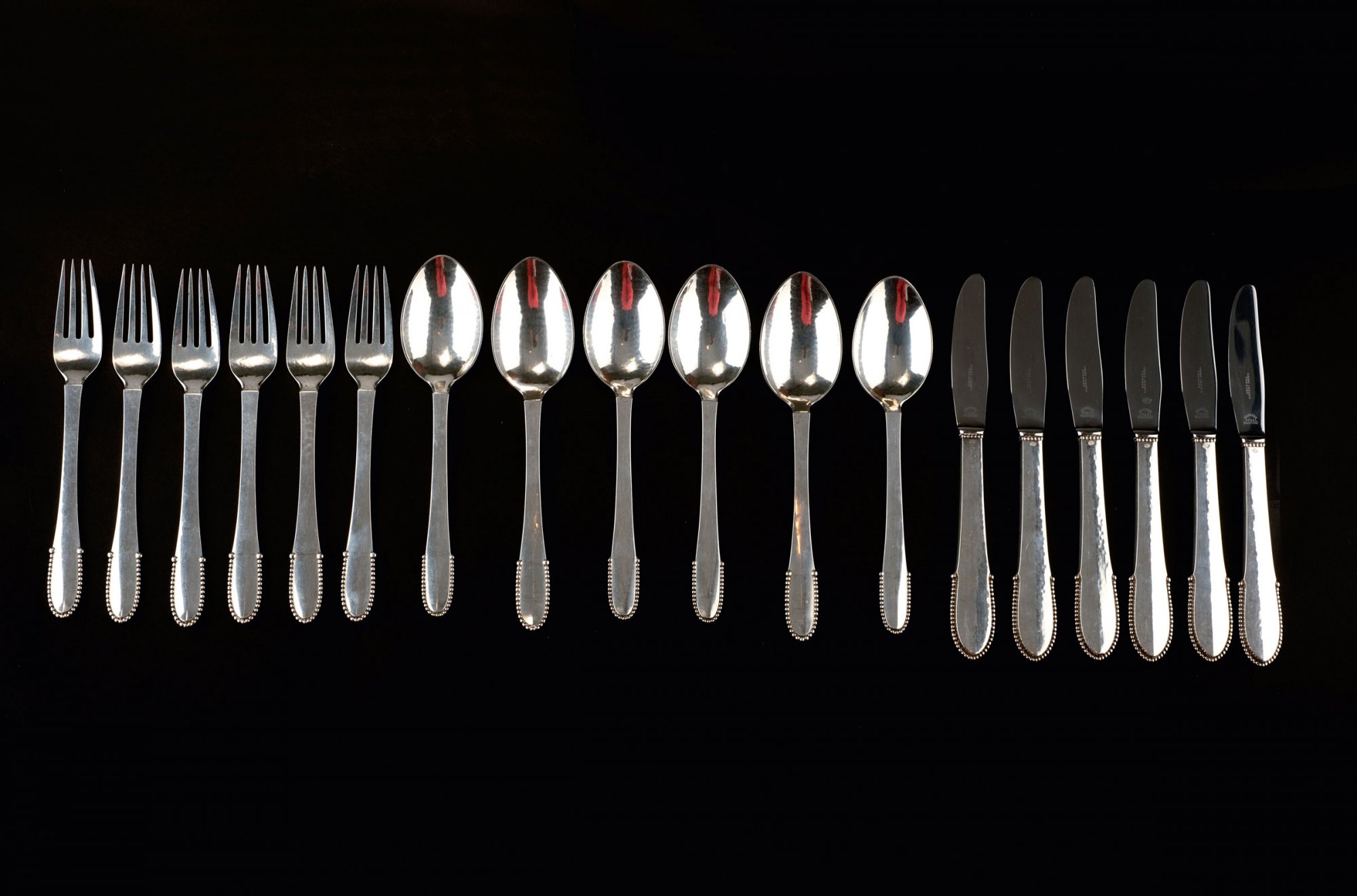 Georg Jensen, Copenhagen. 'Beaded' flatware, 1916. 18 pieces. 6 spoons, L. 18.5 cm; 6 forks, L. 18.1 cm; 6 knives, L. 20.3 cm. Designed by Georg Jensen. Made past 1945. Silver, stainless steel blades. Marked: GEORG JENSEN, STERLING DENMARK; GEORG JENSEN DENMARK, STAINLESS STEEL RAADVAD.