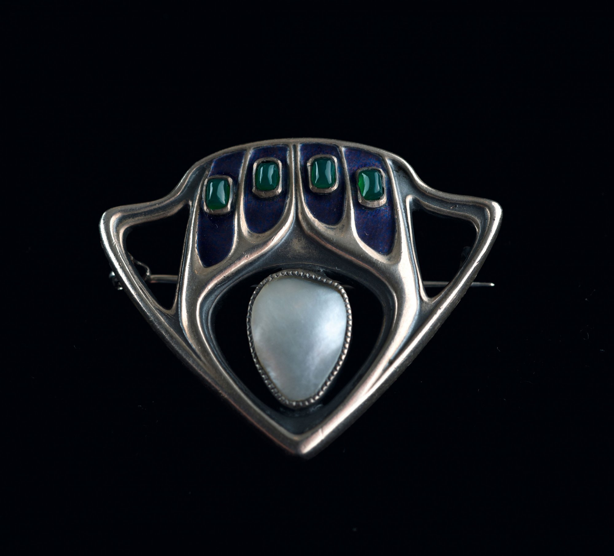 Theodor Fahrner, Pforzheim. Brooch, 1902. 2.9 x 2.9 cm. Designed by Georg Kleemann. Silver, matt purple enamel, three chrysoprases, pearl shell. Marked: Maker's mark, 935 DEPOSE.