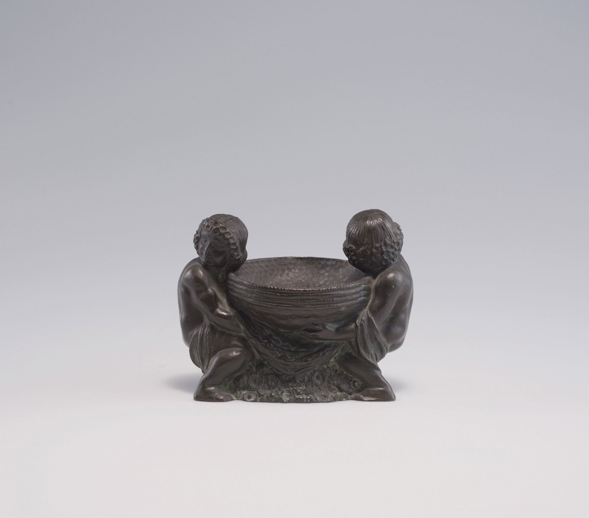 Gustav Gurschner. Putti bowl, c1910-15. H. 11 cm; 13.4 x 9 cm. Bronze, dark green patina. Marked: GURSCHNER, 515/152.