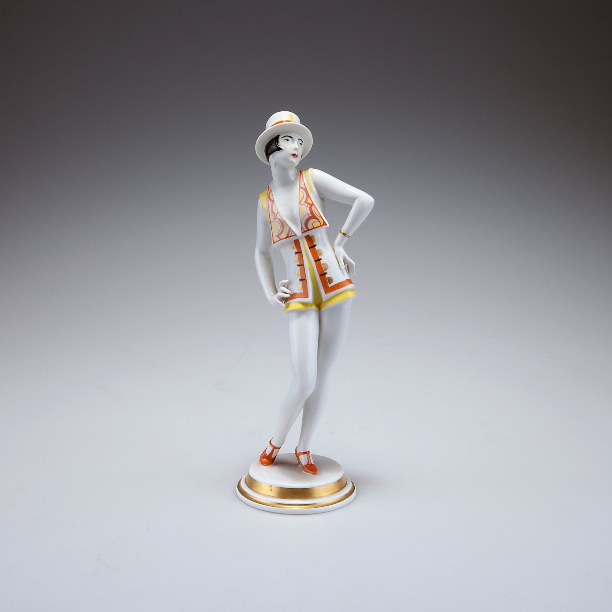 Rosenthal, Selb. 'Charleston', 1927. H. 22.7 cm. Designed by Gustav Oppel. Made in 1928. Porcelain, white, glazed, polychromatic overglaze with gold. Marked: GO, maker's mark, 3.
