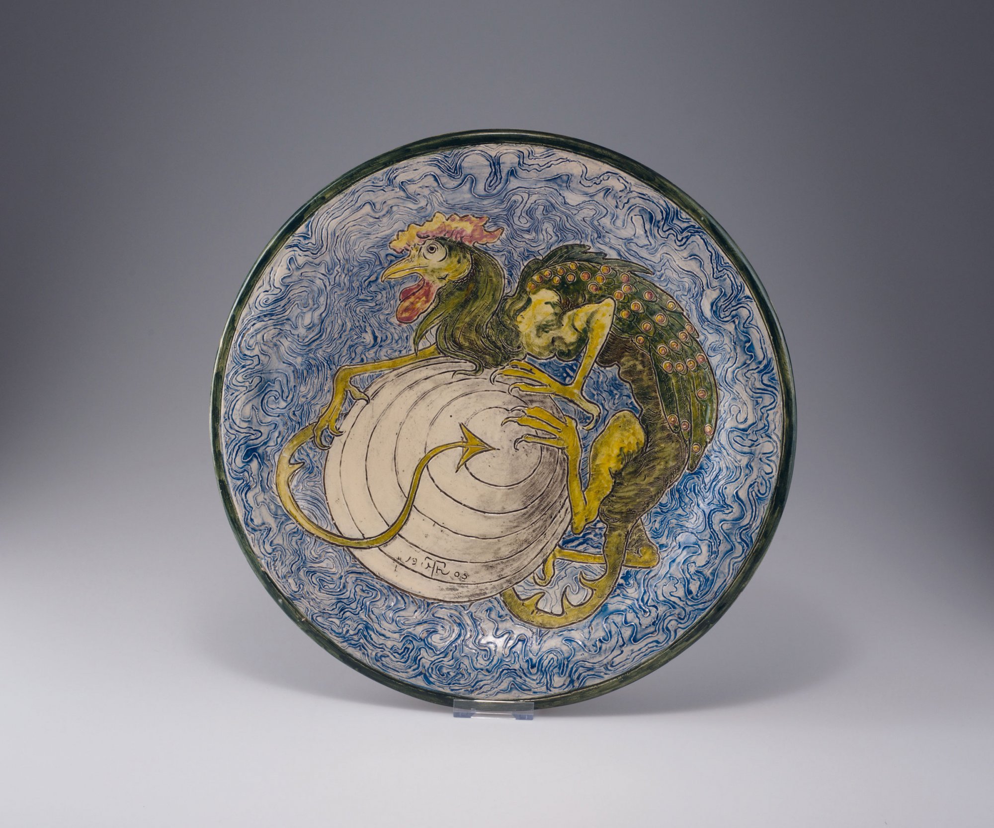 Majolikamanufaktur Karlsruhe. Decorative plate with chimera, 1905. D. 39.8 cm. Designed by Hans Thoma, 1905. Earthenware, polychromatic glaze. Reliefed pattern with chimera. Signed: Artist's signet, 1905. Marked: Maker's mark.