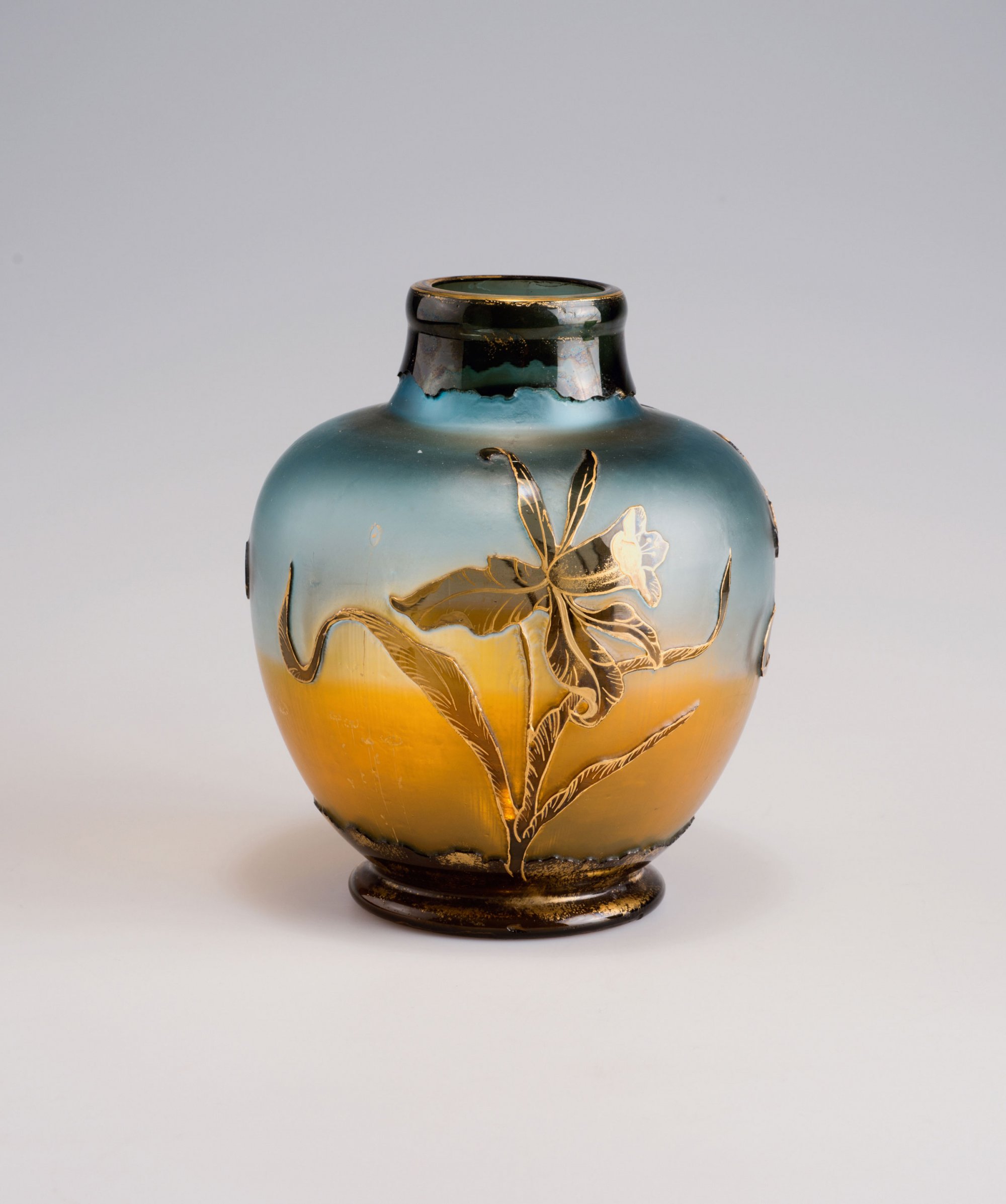 Harrach, Neuwelt. Vase with iris, c1900. H. 17 cm. Cased glass, clear, yellow and blue. Etched pattern with iris, gold contours.