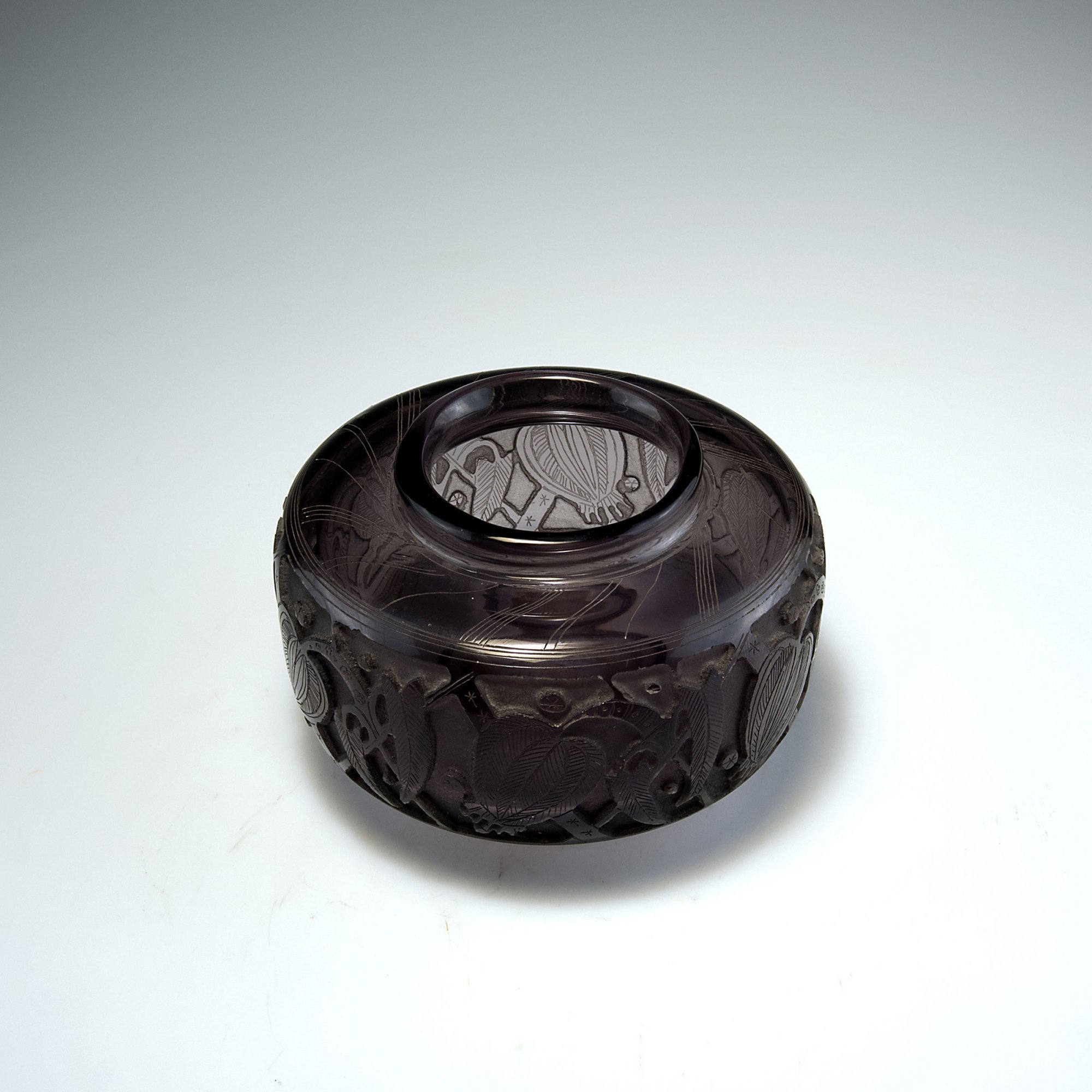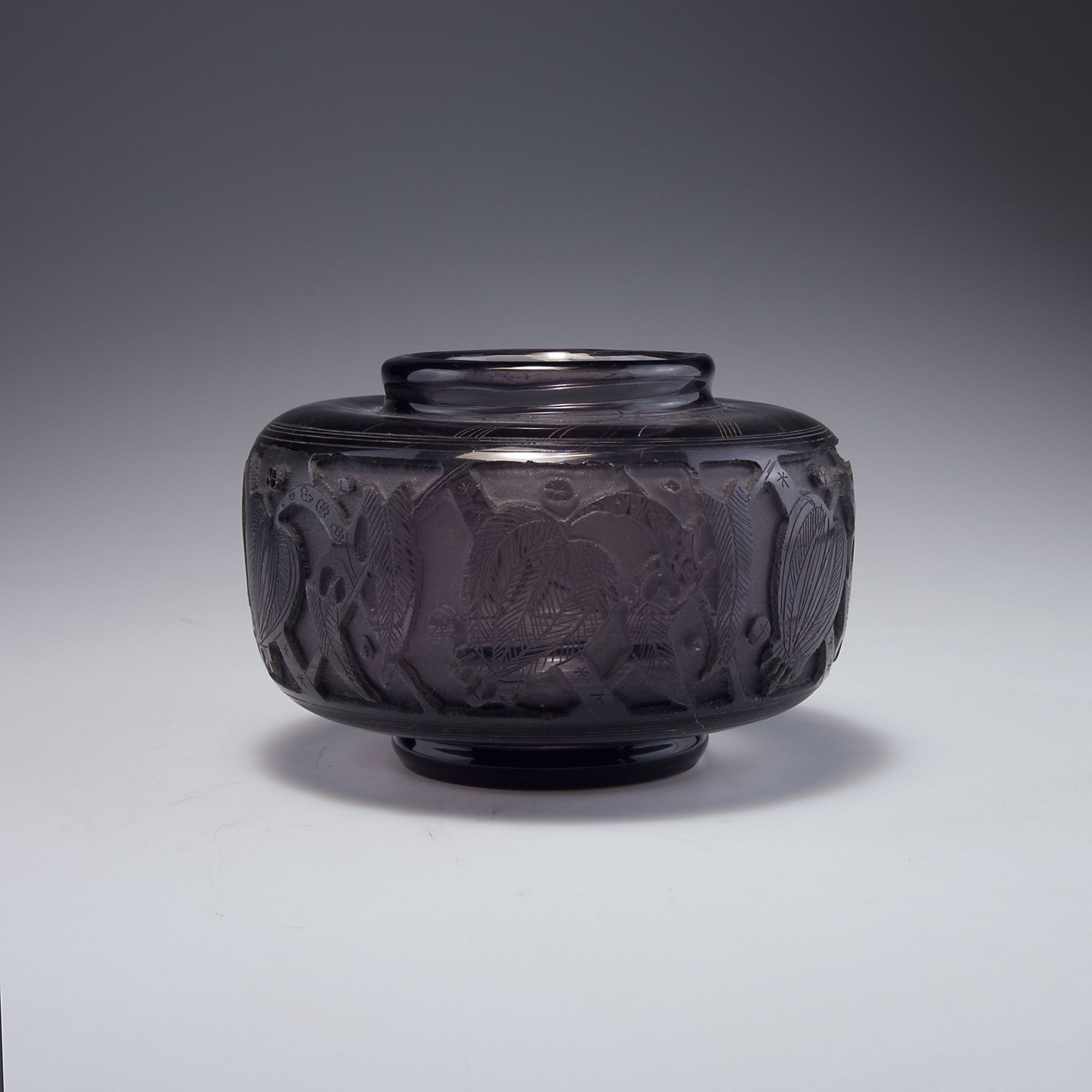 Ludwig Moser, Karlo Vyvary. Flowerpot, 1927. H. 12 cm. Designed by Heinrich Hussmann. Smoke coloured glass. Etched pattern. Leaves and buds, needle etching. Signed: Signet H. Hussmann, Moser MM.