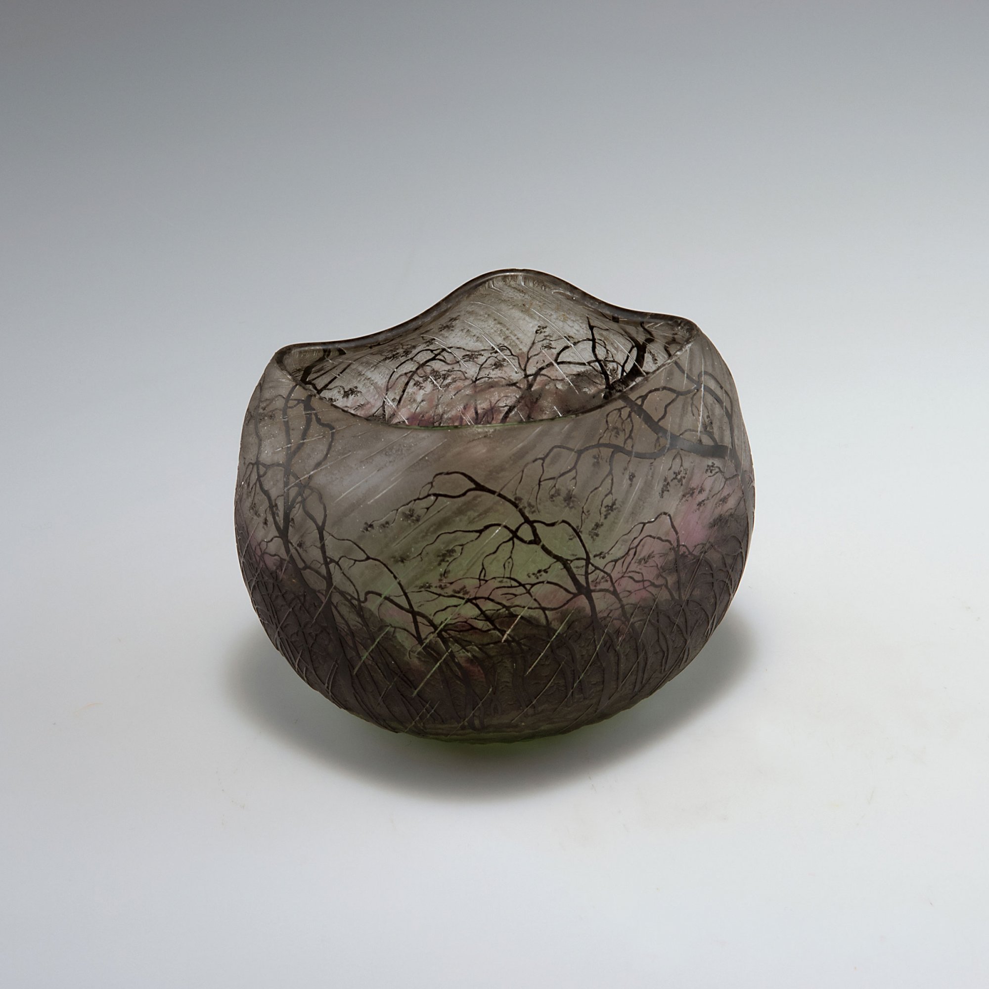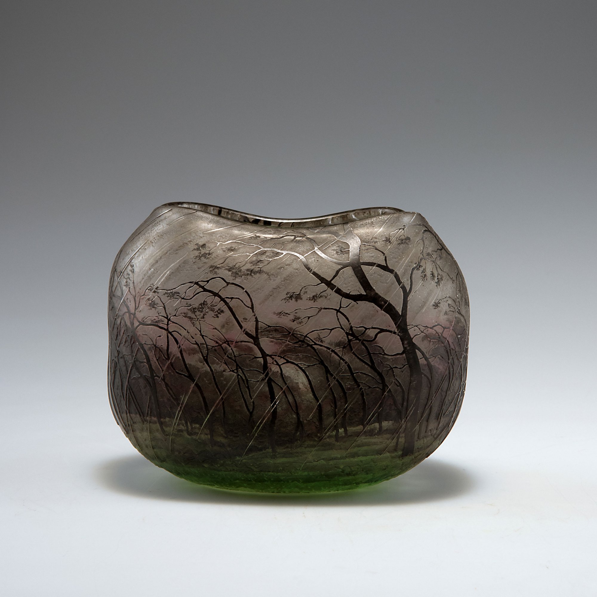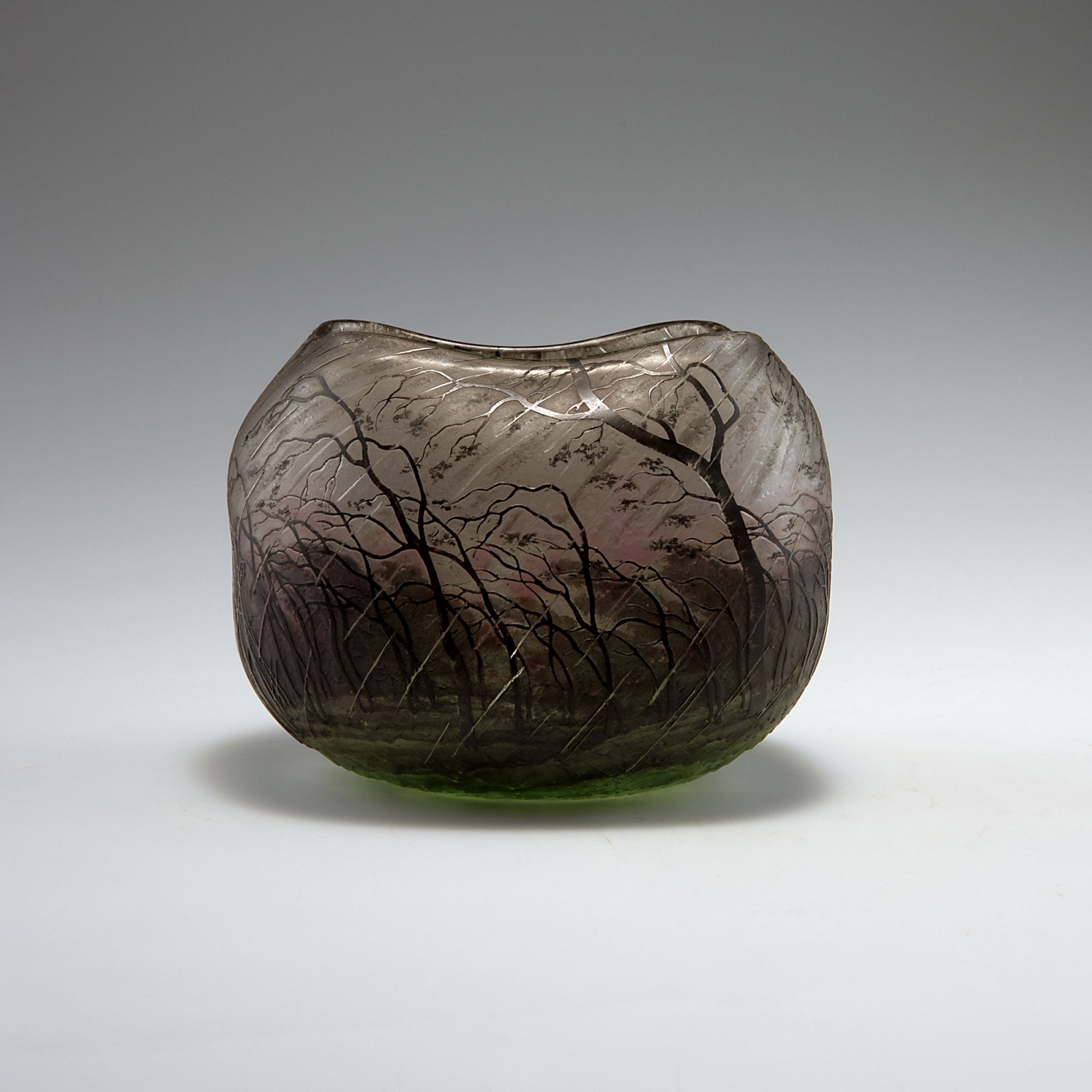 Daum Frères, Nancy. 'Pluviose' vase, c1900. H. 11.5 cm. Cased glass, milky white, pink and pale green powder inclusions. Etched pattern, Grisaille paint. Birch trees in the rain. Signed: DAUM NANCY, cross of Lorraine.