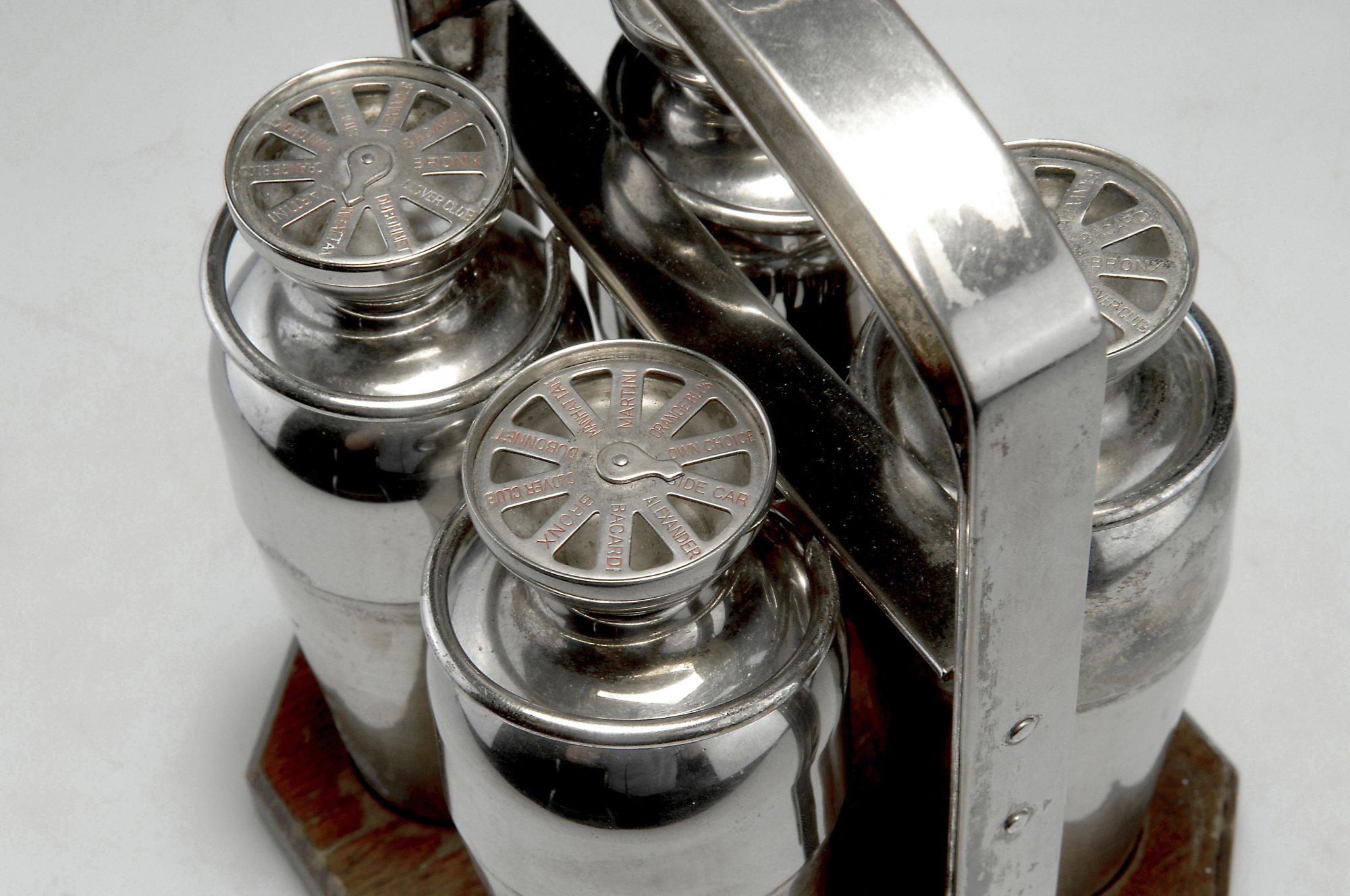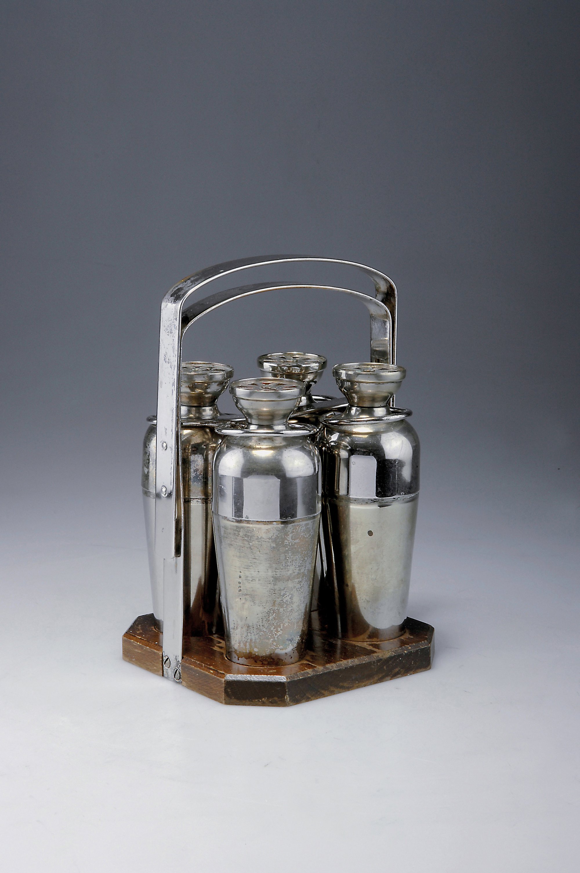 James Napier, Jewelry & Co., Meriden/Connecticut. Four cocktail shakers in retainer, 1930s. Shakers, H. 15.6 cm; retainer, H. 22 cm; 15 x 15 cm. Silver-plated metal, wood. Marked: APIER, US AND FOREIGN PATENTS PENDING.