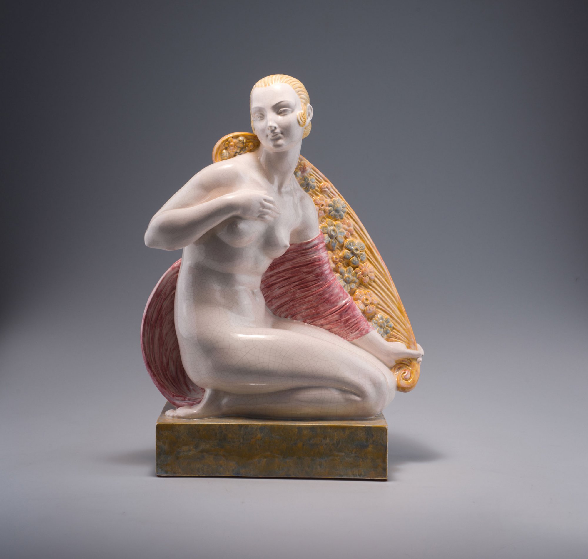 Joe Descomps. Nude, c1928. H. 51.1 cm; 37 x 18.5 cm. Made by R. Meynial. Faience, polychromatic glaze, grey crazing. Marked: JOE DESCOMPS. Bottom marked: Ed. R. MEYNIAL Made in FRANCE.