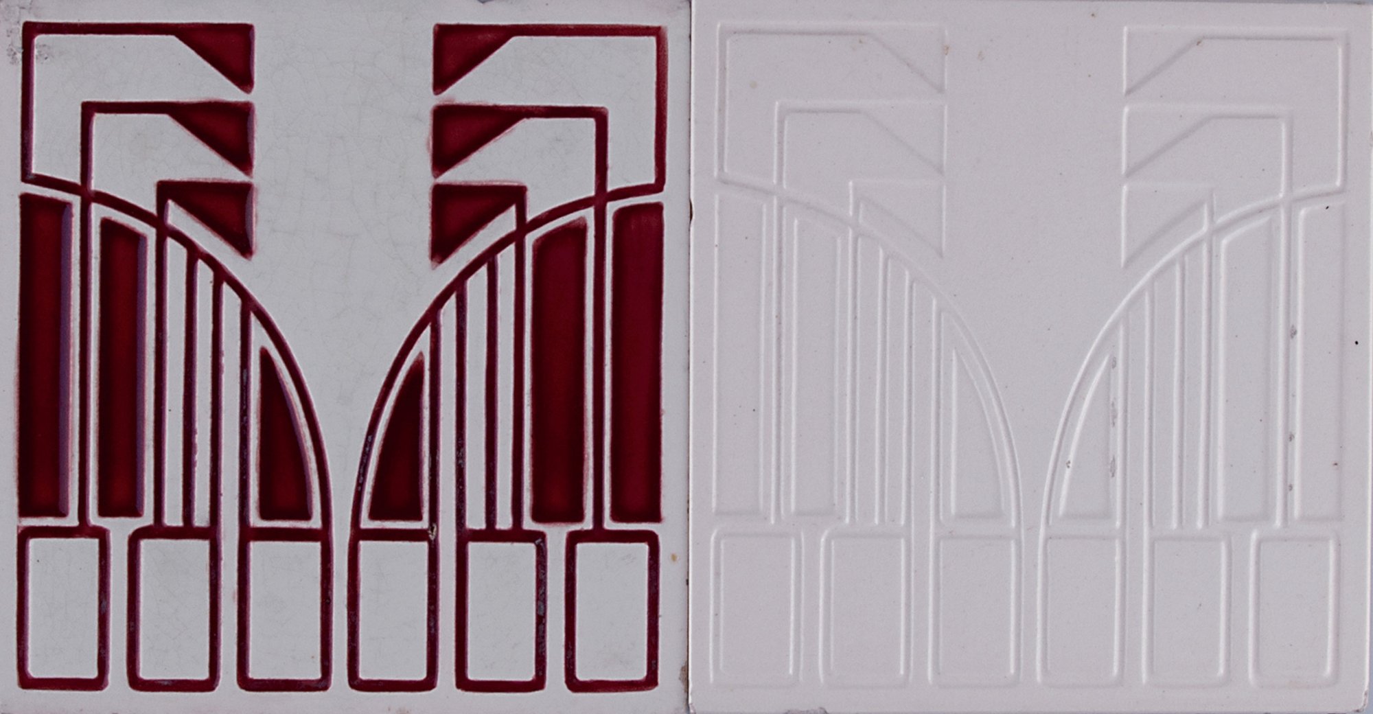 Villeroy & Boch, Mettlach. Pair of tiles, c1905. 14.6 x 14.7 cm. Designed by Joseph Maria Olbrich (attributed). Earthenware, glazed white and red, reliefed stylised pattern. Marked: VILLEROY & BOCH MOSAIKFABRIK IN METTLACH, DM.
