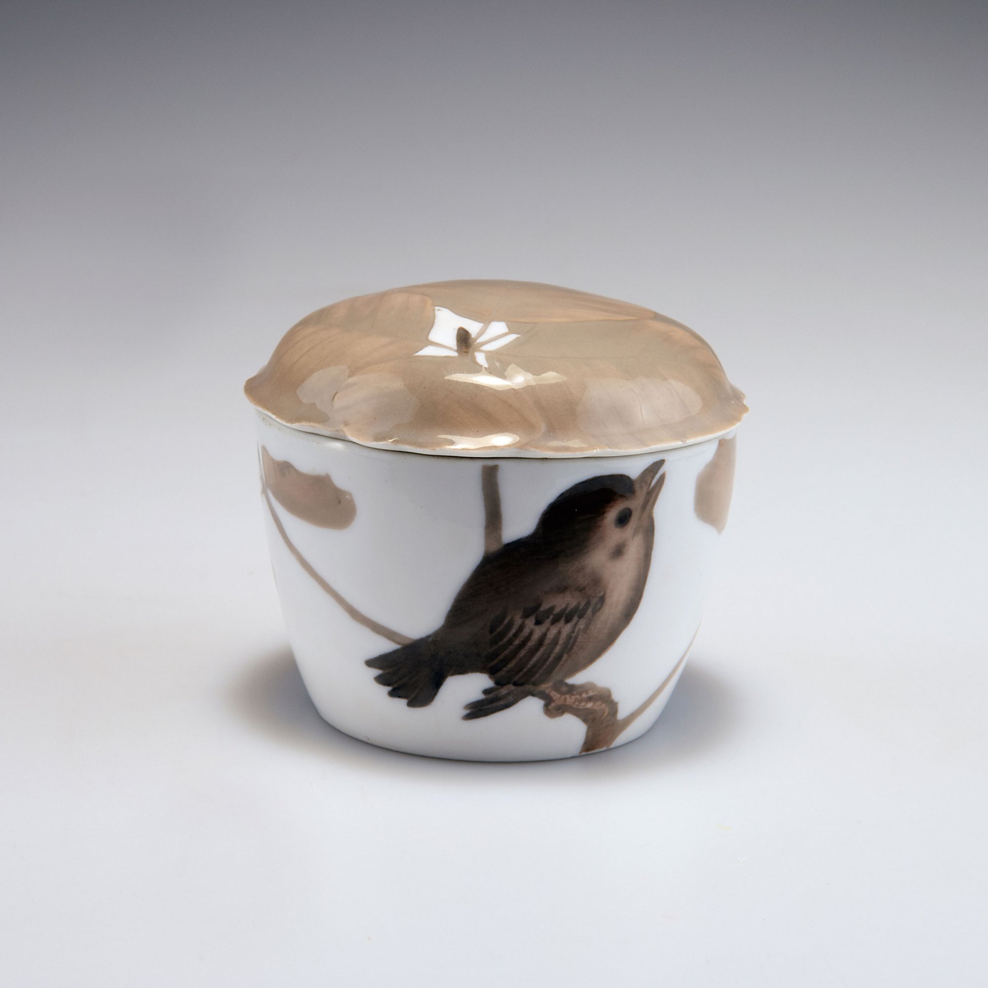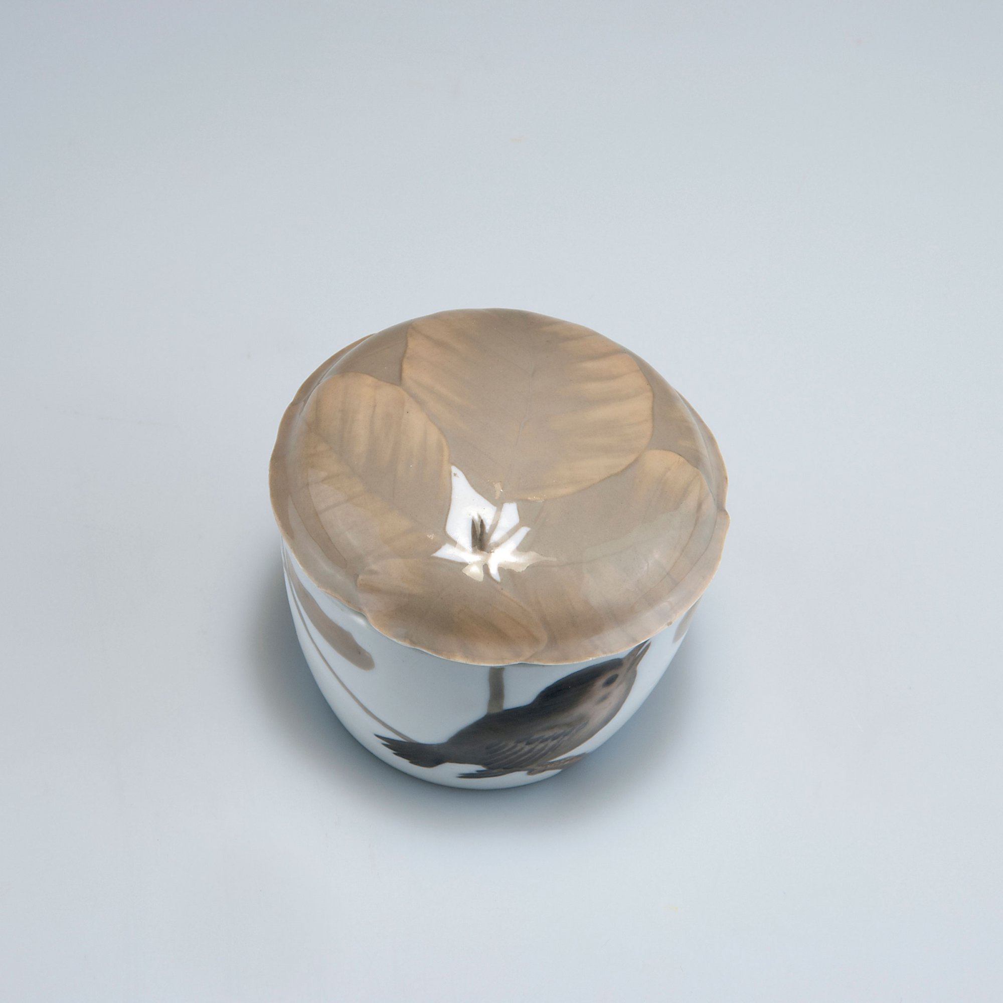 Royal Copenhagen. Box and cover with sparrow, c1900. H. 7 cm; D. 8.5 cm. Made up to 1922. Porcelain, white, glazed, underglaze in brown. Marked: ROYAL COPENHAGEN 310 , waves 100.