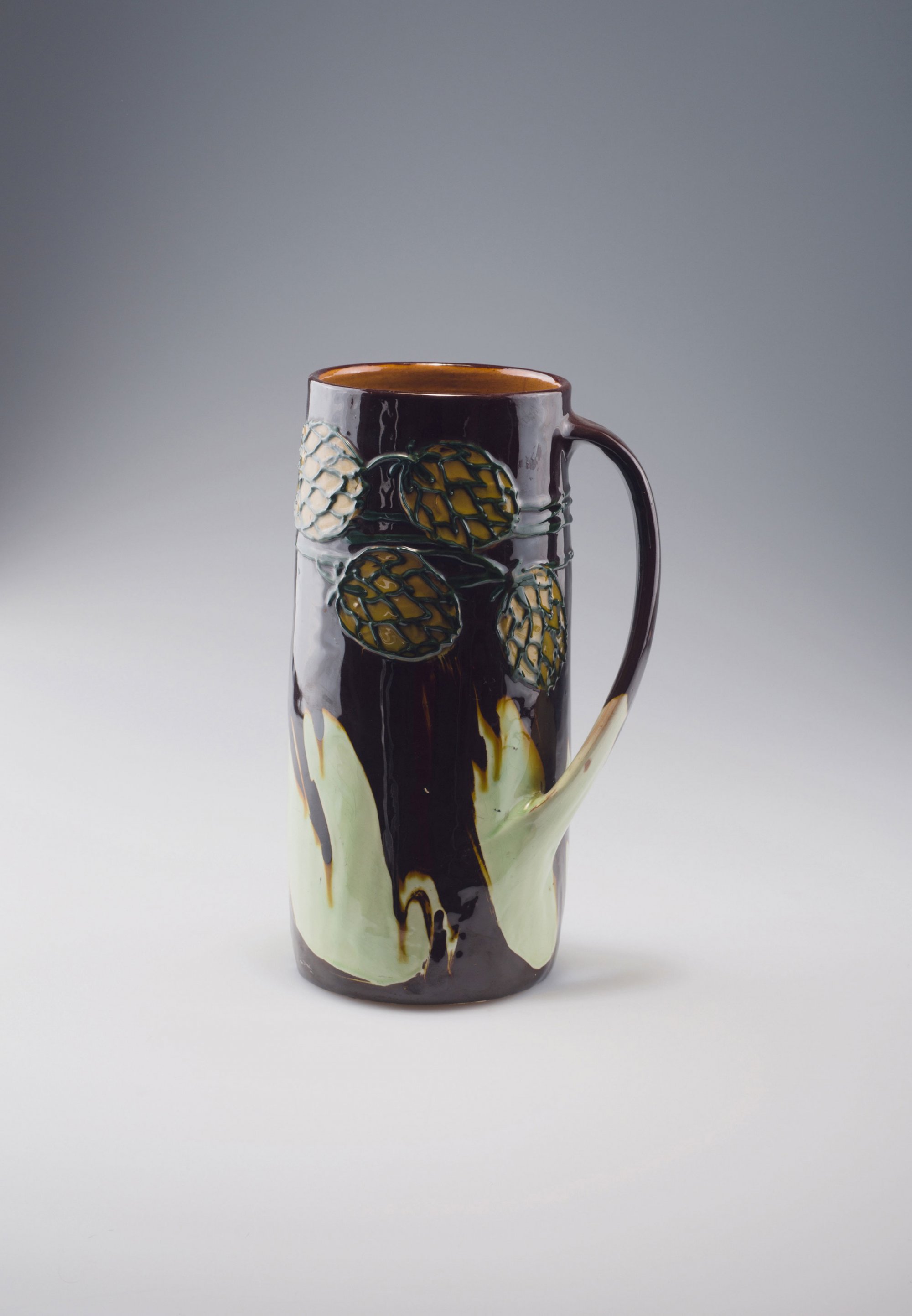 Max Laeuger, Kandern. Vase 'Hop', c1897. H. 25.6 cm. Majolica, glazed brown on white, slip glaze, green and yellow. Marked: 135, MUSTER GESETZL. GESCHTZT, MLK GESETZL. GESCHZT, 7 P.