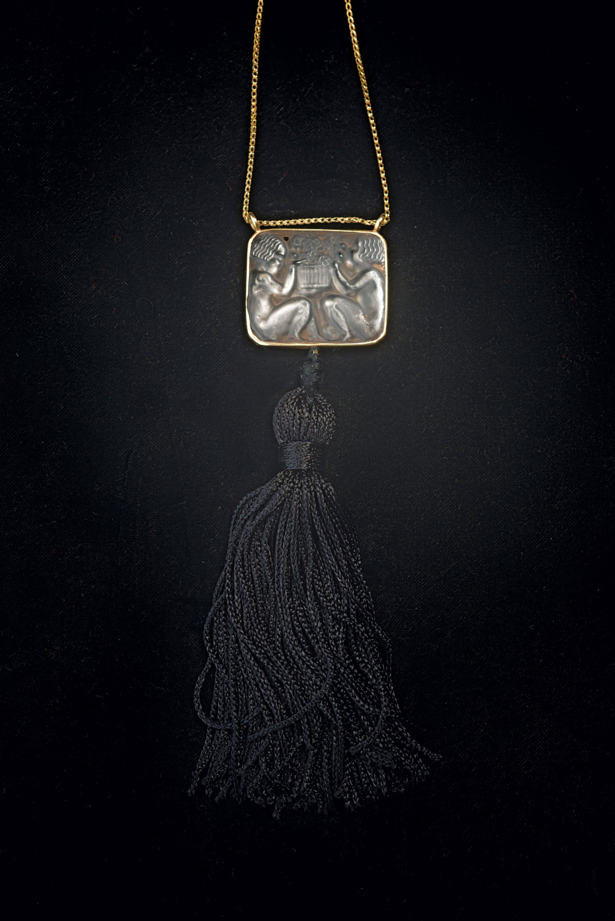 René Lalique, Wingen-sur-Moder. 'Putti' pendant, 1920s. 2.7 x 3 cm. Clear glass, moulded, part matted. Signed: R. Lalique (engraved). Mounting and chain of yellow gold (added). Black tassel.