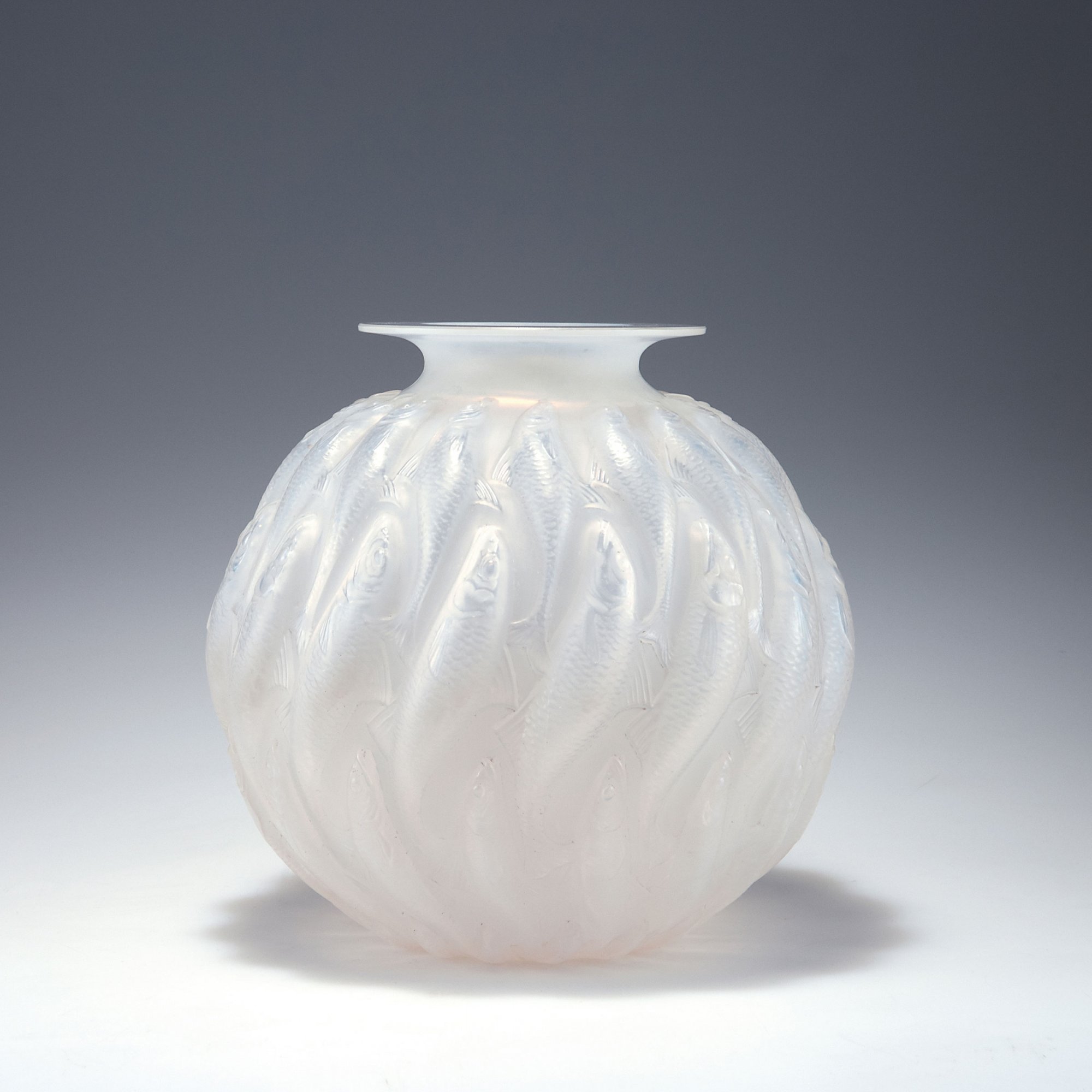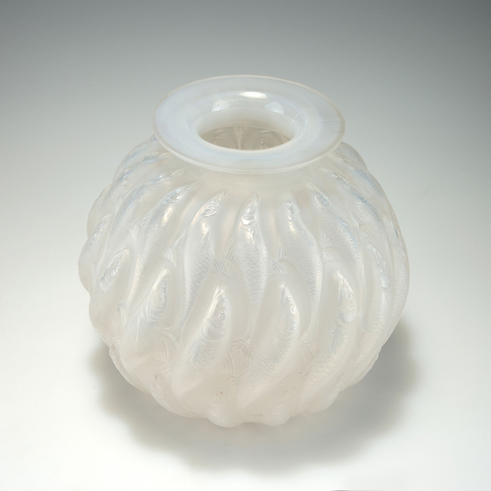 René Lalique, Wingen-sur-Moder. 'Marisa' vase, 1927. H. 22.9 cm. Moulded opalescent glass, reliefed fish, matted, part polished. Marked: R. Lalique France.