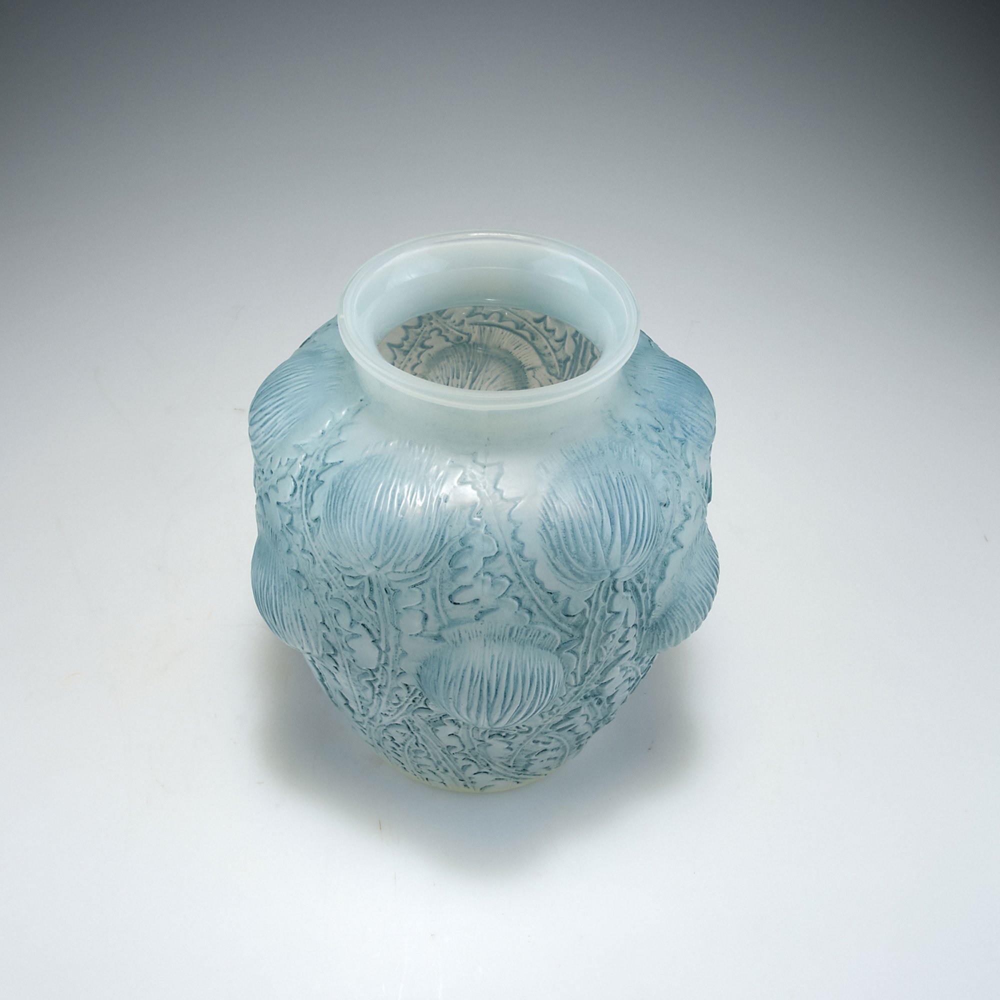 René Lalique, Wingen-sur-Moder. 'Domrémy' vase, 1926. H. 21.5 cm. Moulded glass, opalescent and clear, matted, blue patina with thistles. Marked: R. Lalique France (engraved).