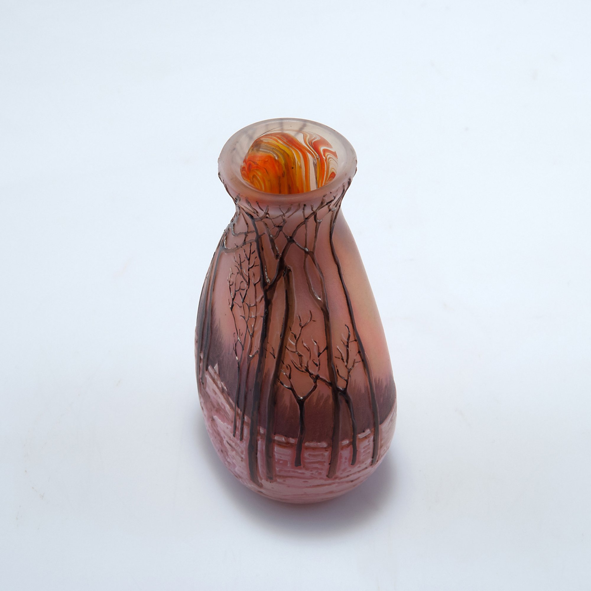 Legras & Cie., Saint-Denis. Vase with winter landscape, c1915. H. 10.5 cm. Cased glass, clear, powder inclusions, orange and red. Etched pattern, enamelled. Signed: Legras.