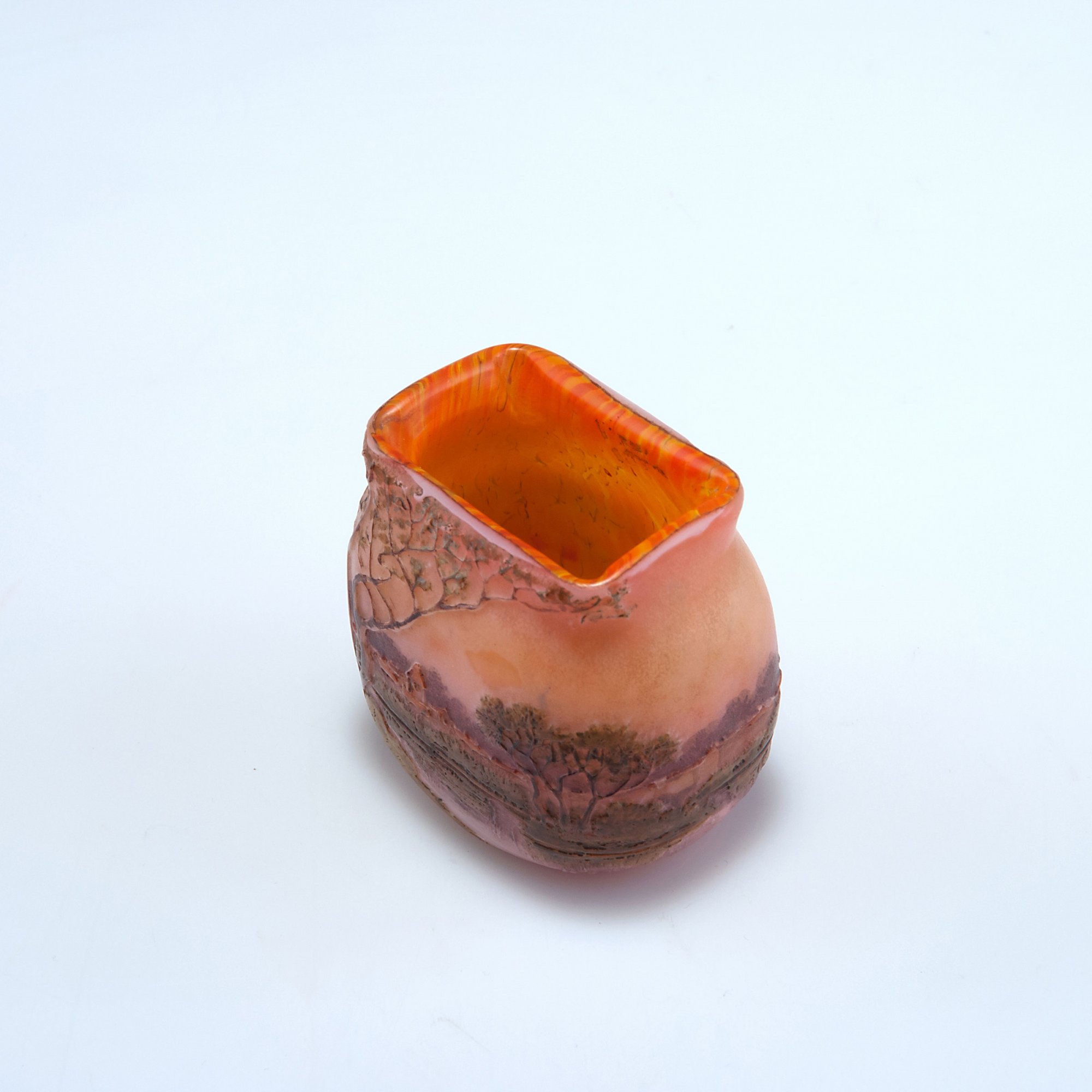 Legras & Cie., Saint-Denis. Vase with Spring landscape, c1915. H. 5.9 cm. Cased glass, clear, orange powder inclusions, etched pattern, enamelled. Signed: Legras.