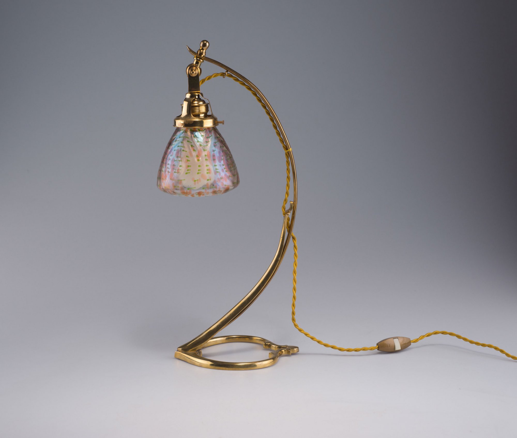 Loetz Wwe., Klostermühle. Table light, c1905. H. 44.5 cm. Clear glass, optically blown, green and orange dots. Matt mother of pearl lustre. Brass base.