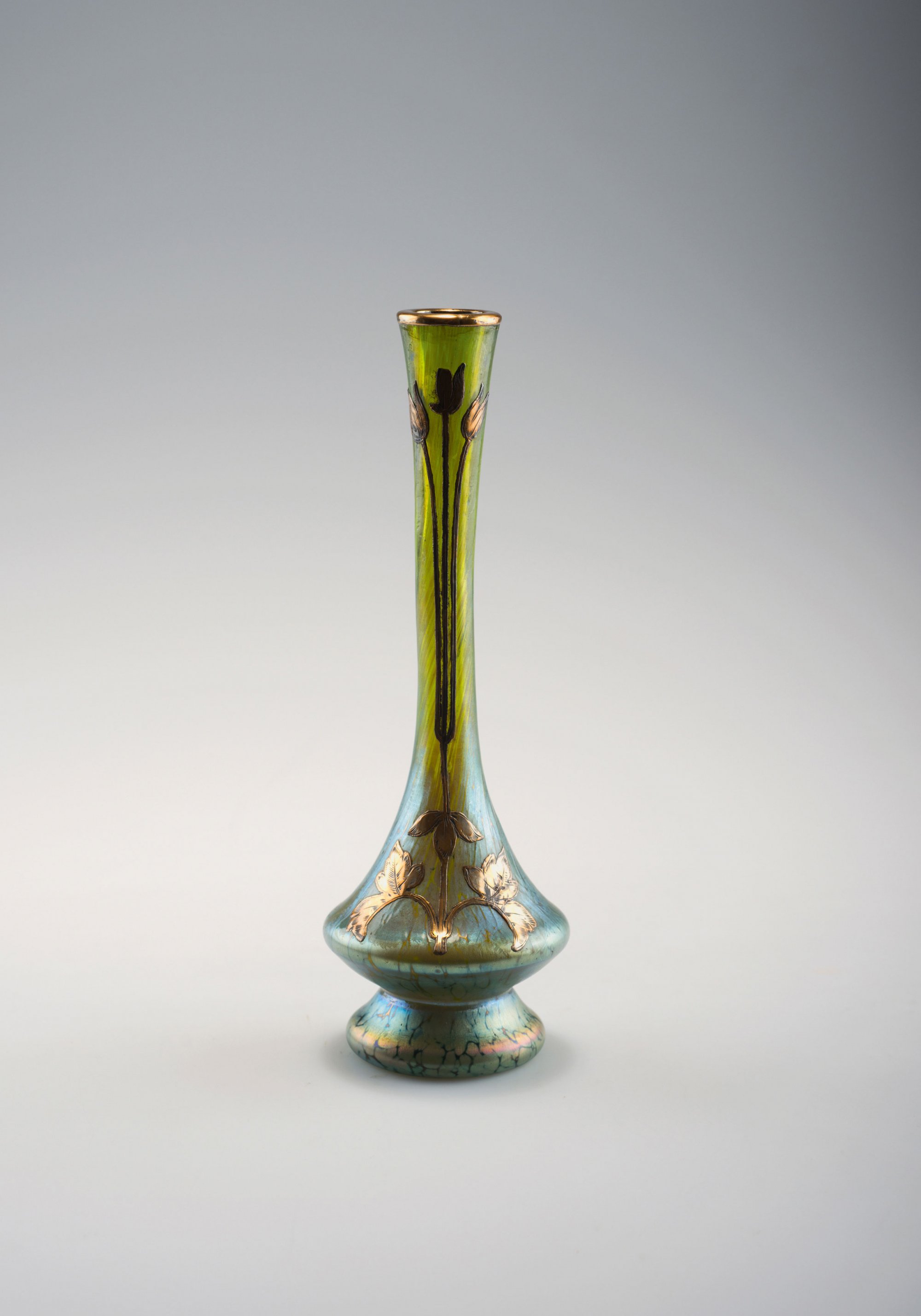 Loetz Wwe., Klostermühle. 'Papillon' vase with silver overlay, c1900. H. 20 cm. Green glass, fused crushed glass, silver yellow, creta Papillon, mother of pearl lustre, engraved silver overlay.