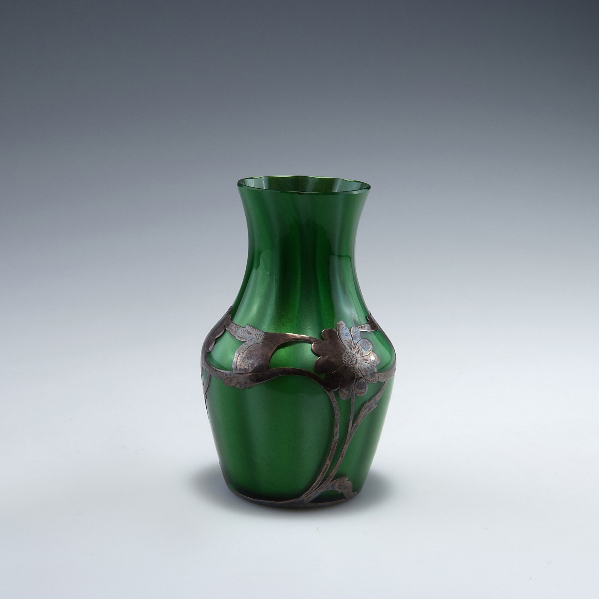 Loetz Wwe., Klostermühle. 'Melusin' vase, c1905. H. 11.5 cm. Cased glass, clear, green threads between layers, optically blown. Engraved silver overlay.