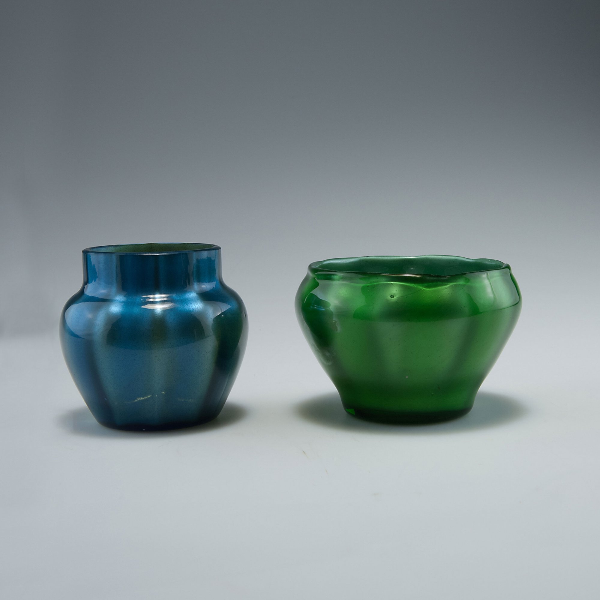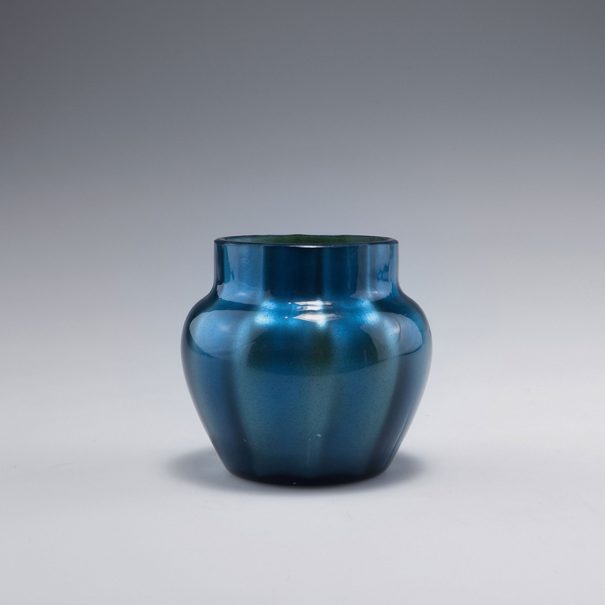 Loetz Wwe., Klostermühle. 'Melusin' vase, c1905. H. 7.8 cm. Cased glass, clear, blue threads between layers, optically blown.