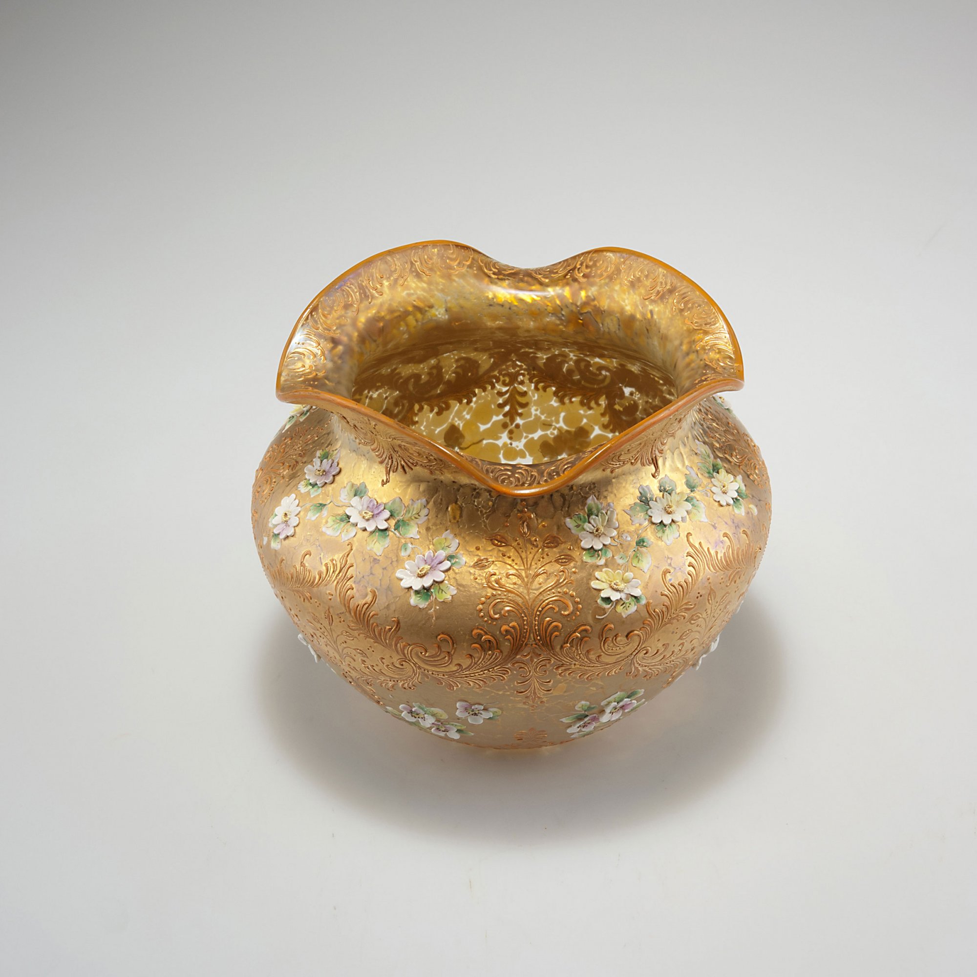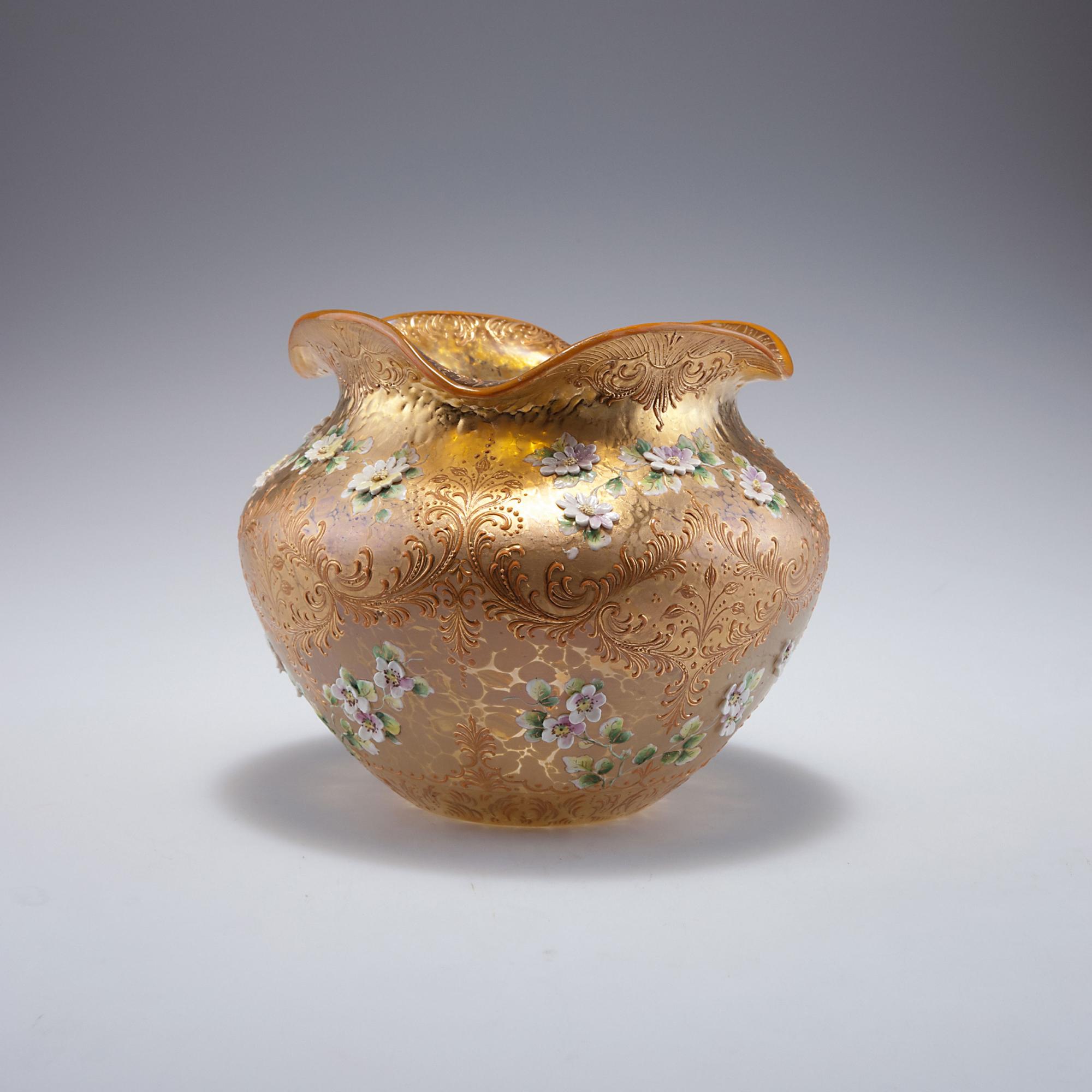 Loetz Wwe., Klostermühle. 'Papillon' vase, enamel and relief gold, c1898. H. 16.5 cm. Clear glass, silver yellow crushed glass, strong mother of pearl lustre. Relief gold, applied enamelled flowers.