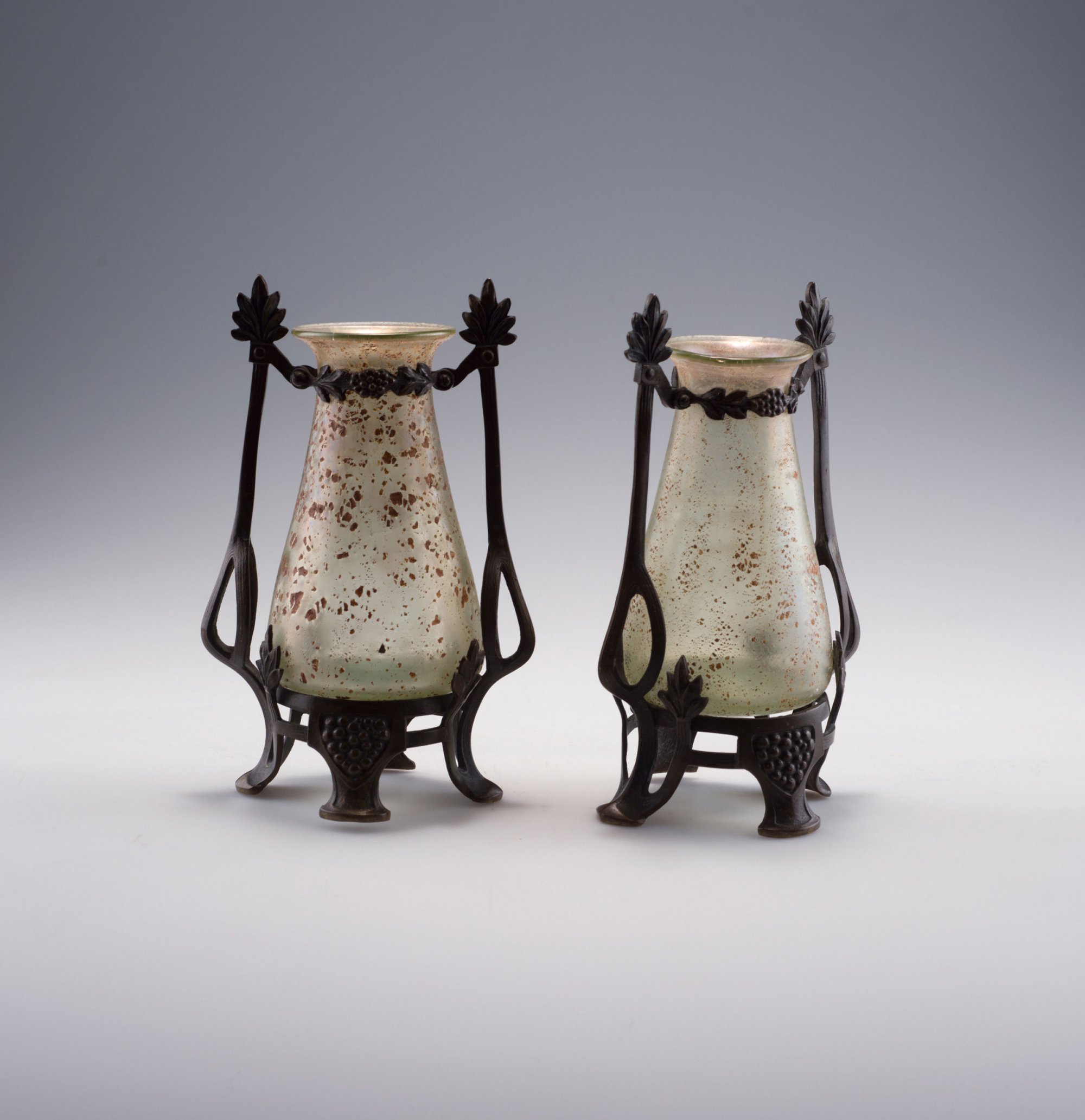 Loetz Wwe., Klostermühle. Pair of 'Cephalonia m. Patinadekor' vases, bronze mounting, 1904. H. 18.2 cm. Pale green glass, fused brownished metal oxides, pale mother of pearl lustre. Bronze mounting with patina.