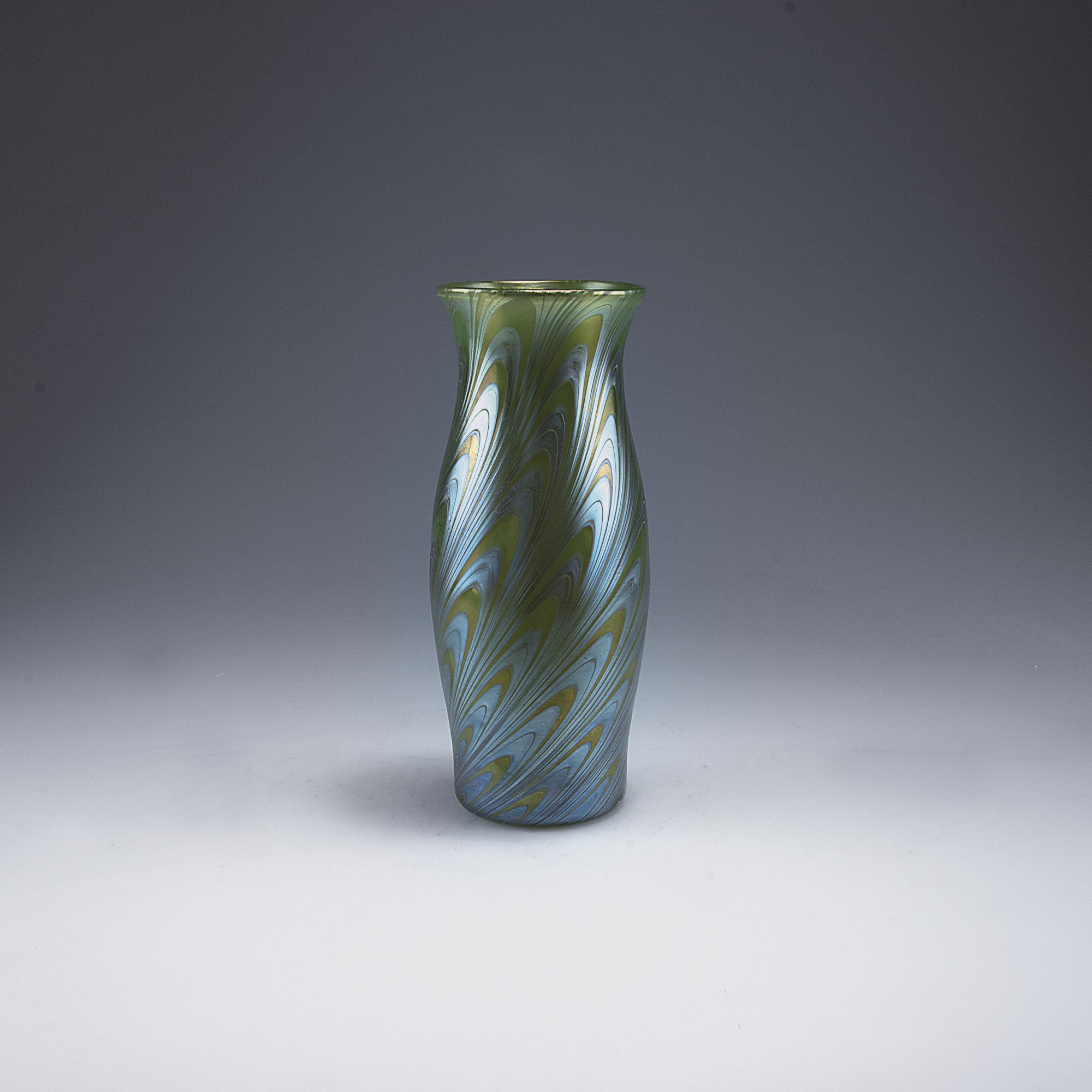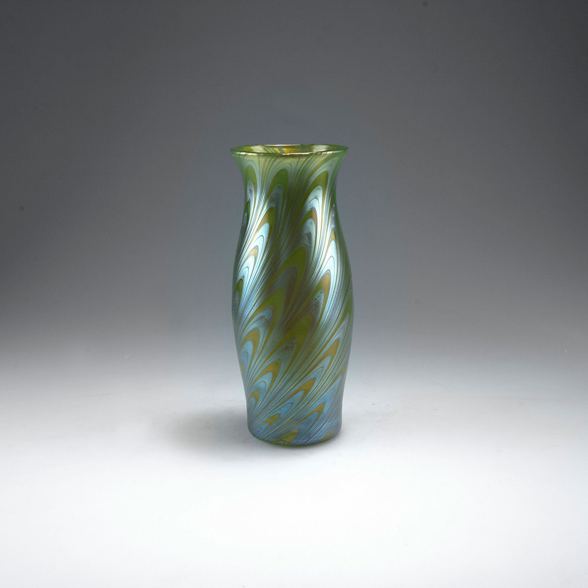 Loetz Wwe., Klostermühle. 'Phänomen' vase, 1899. H. 25.2 cm. Cased glass, clear, green opalescent, combed silver yellow threads, Phänomen Gre 7624, matt mother of pearl lustre. Signed: Loetz Austria.