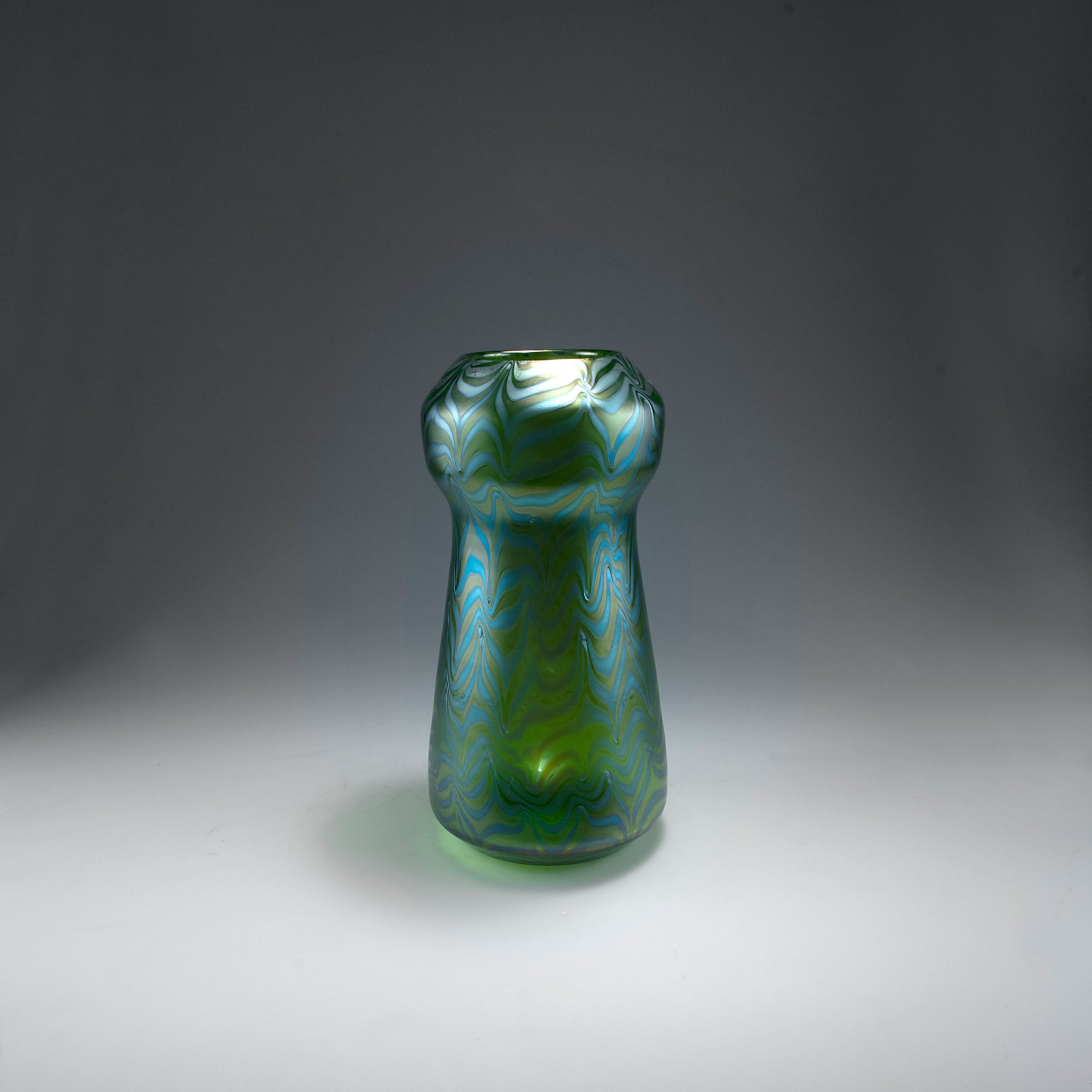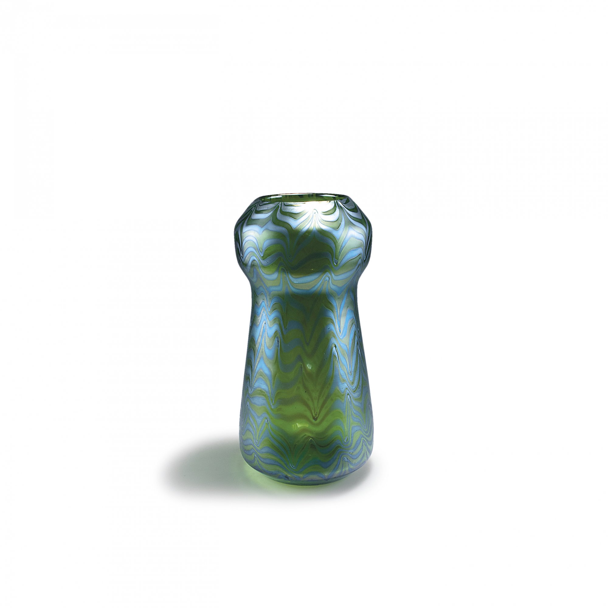 Loetz Wwe., Klostermühle. 'Phänomen' vase, 1900. H. 32.7 cm. Cased glass, clear and green, combed pattern, turquoise threads, Phänomen Gre 85/3780, matt mother of pearl lustre.