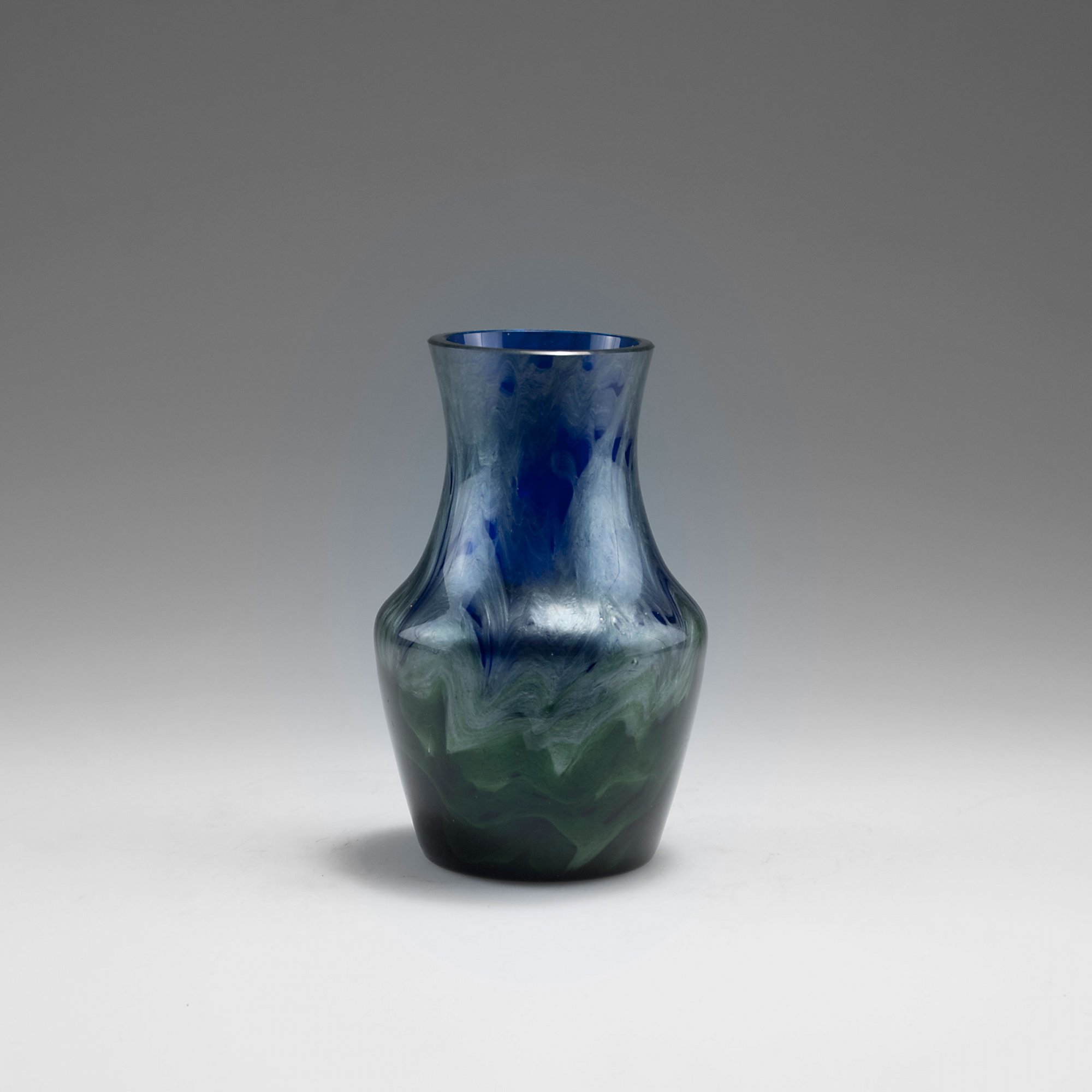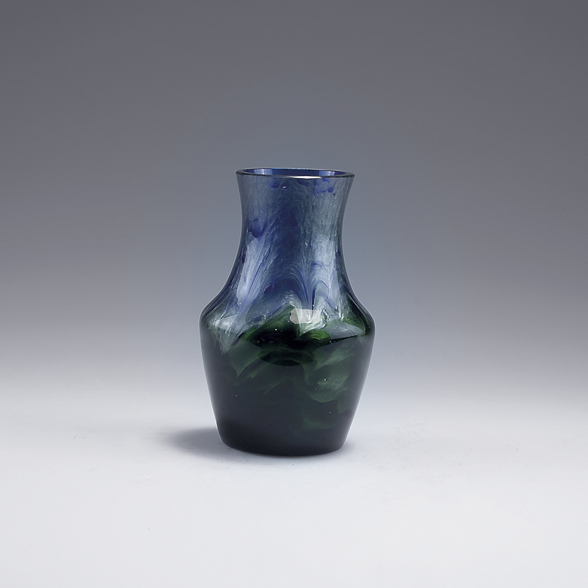 Loetz Wwe., Klostermühle. 'Titania' vase, 1906. H. 11.5 cm. Cased glass, cobalt blue and clear, green silver threads, Titania Gre 2534.