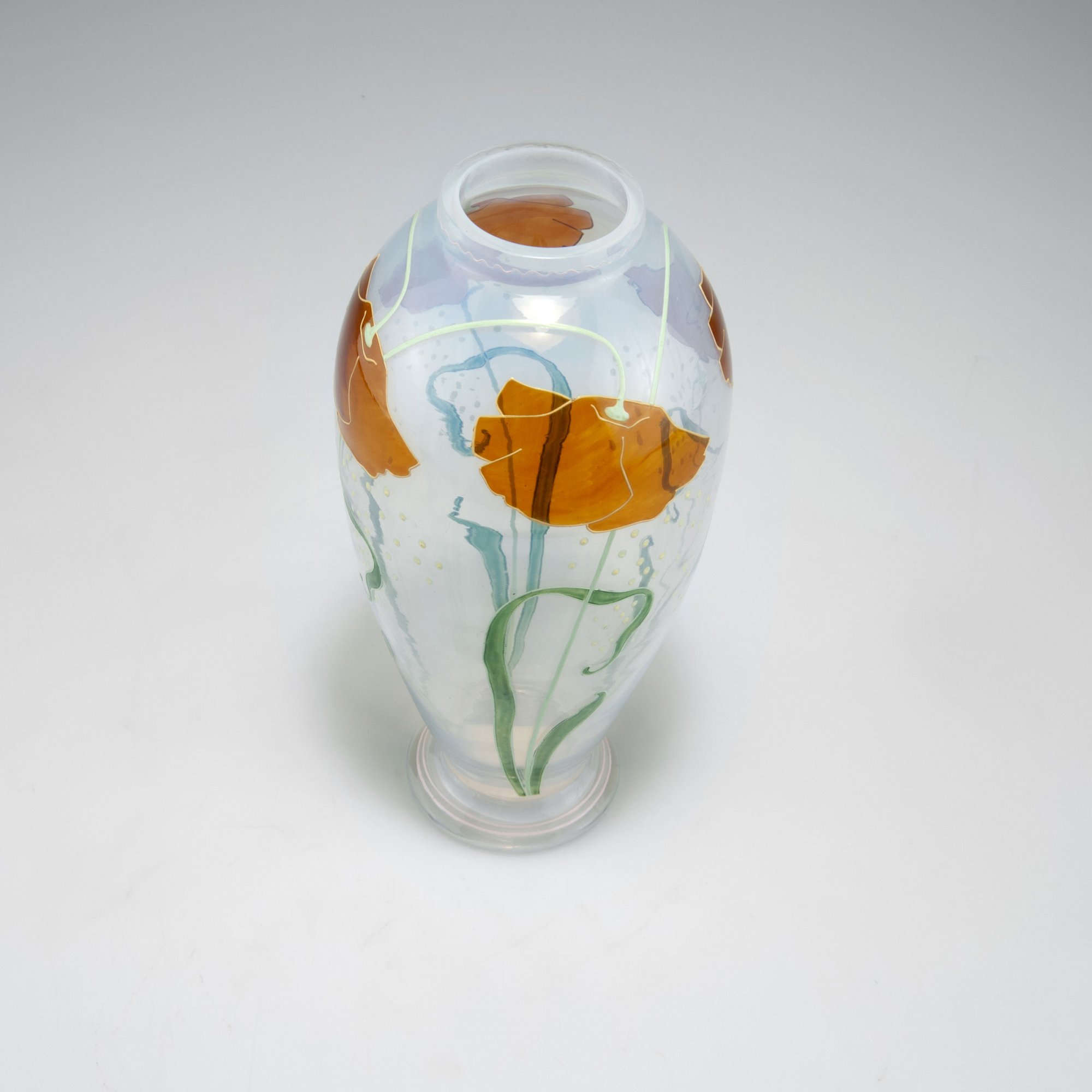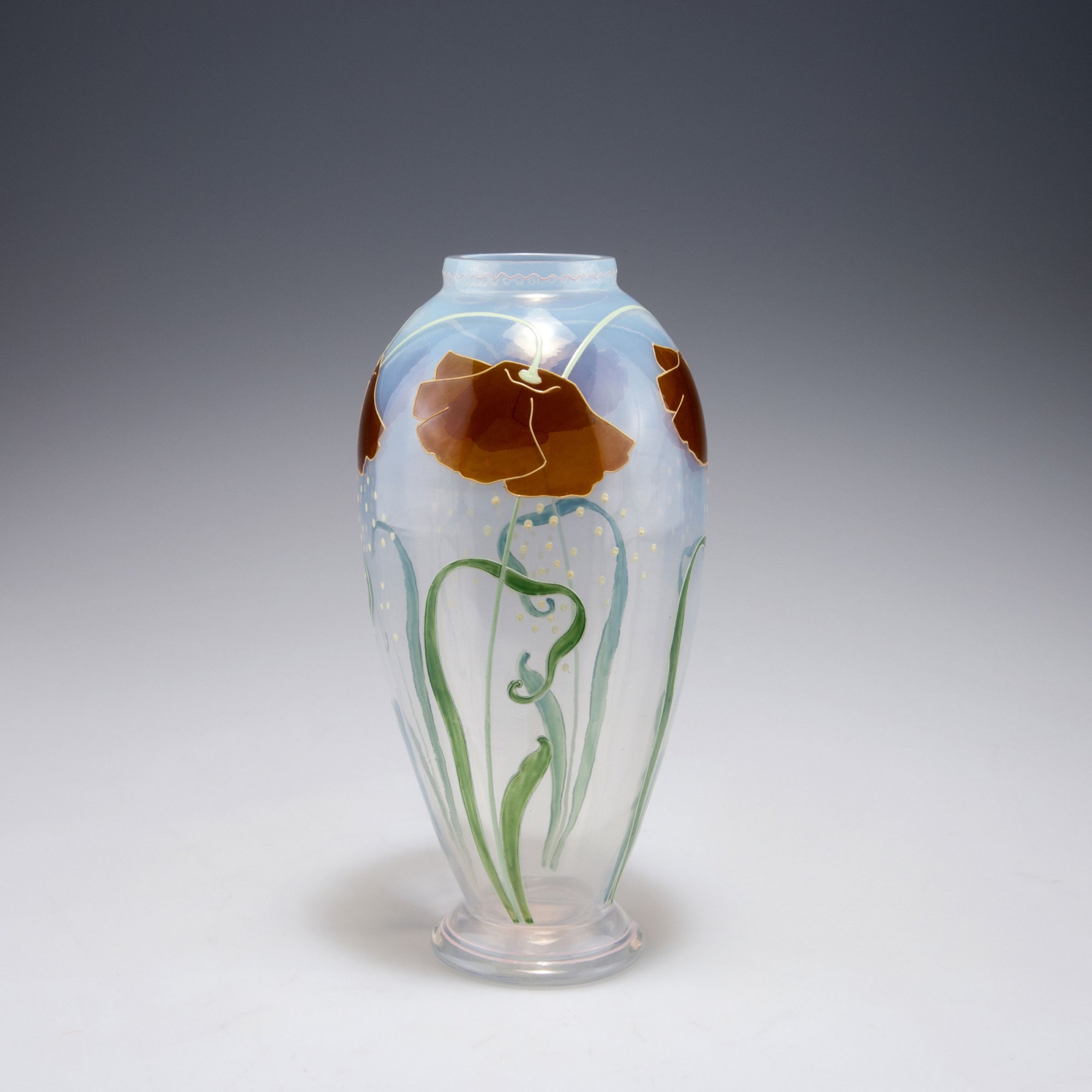 Fritz Heckert, Petersdorf. 'Poppy' vase, 1903. H. 21.6 cm. Designed by Ludwig Sütterlin (attributed). Glass, clear, slightly opal, iridescent, poppy pattern, dark red, pale and dark green and yellow enamel, pink waves.