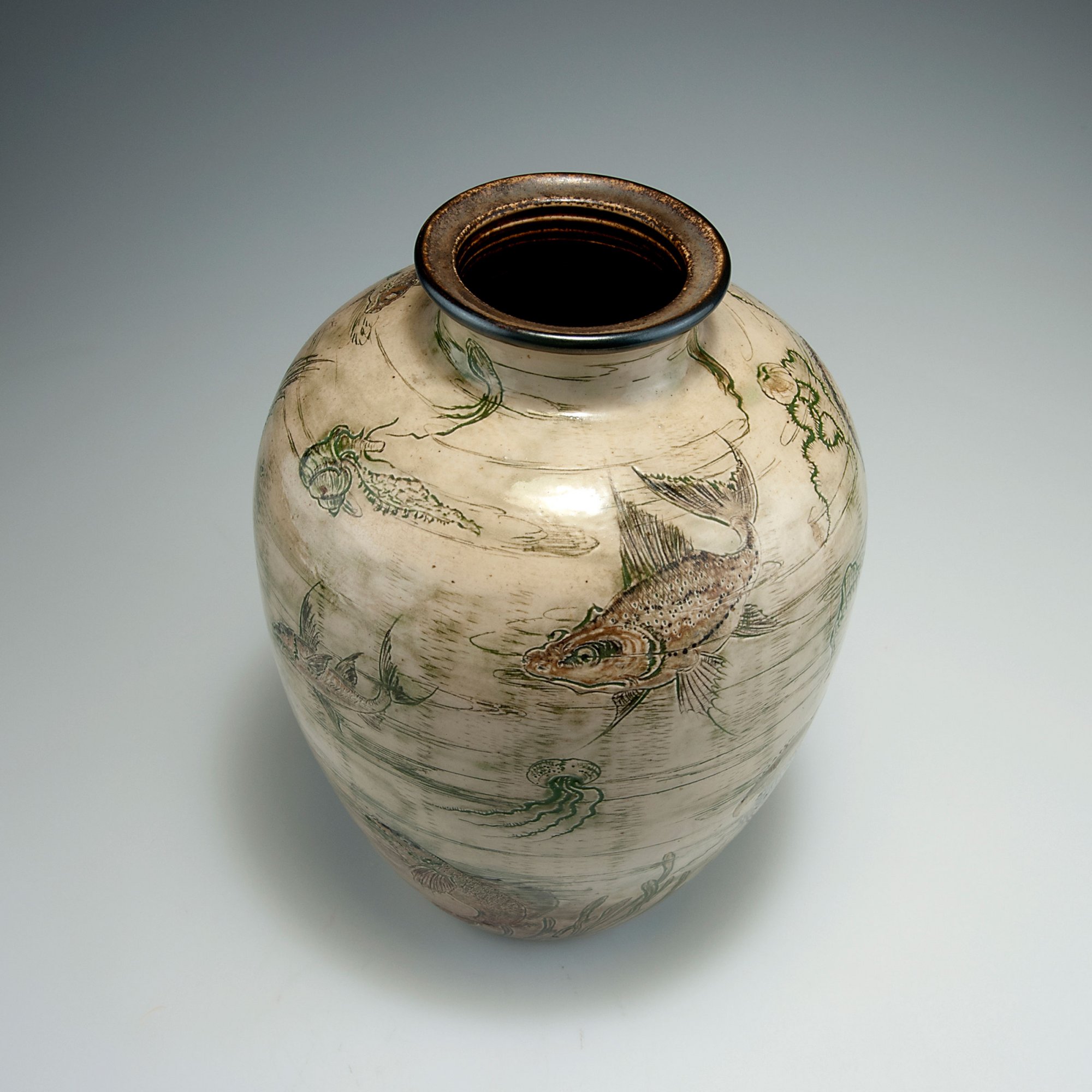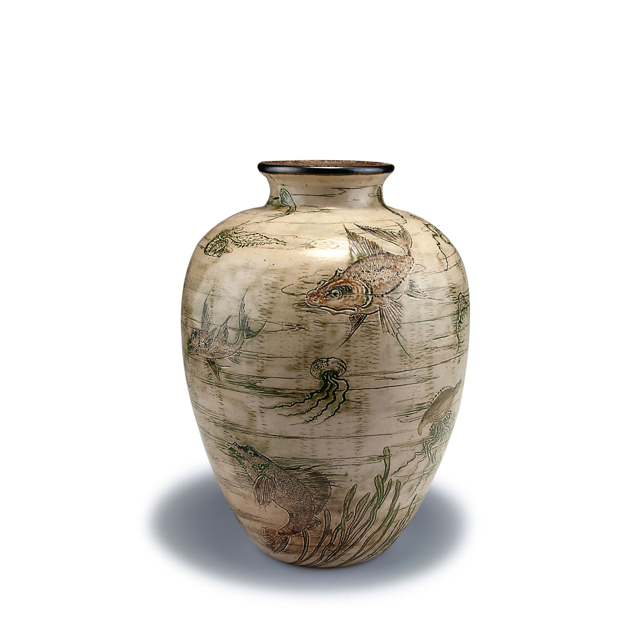 R. W. Martin Brothers, London-Southall. Vase, 1906. H. 26.1 cm. Incised stoneware, glazed beige, green and brown. Underwater scene. Marked: I - 1906 Martin Bros London T Southall.