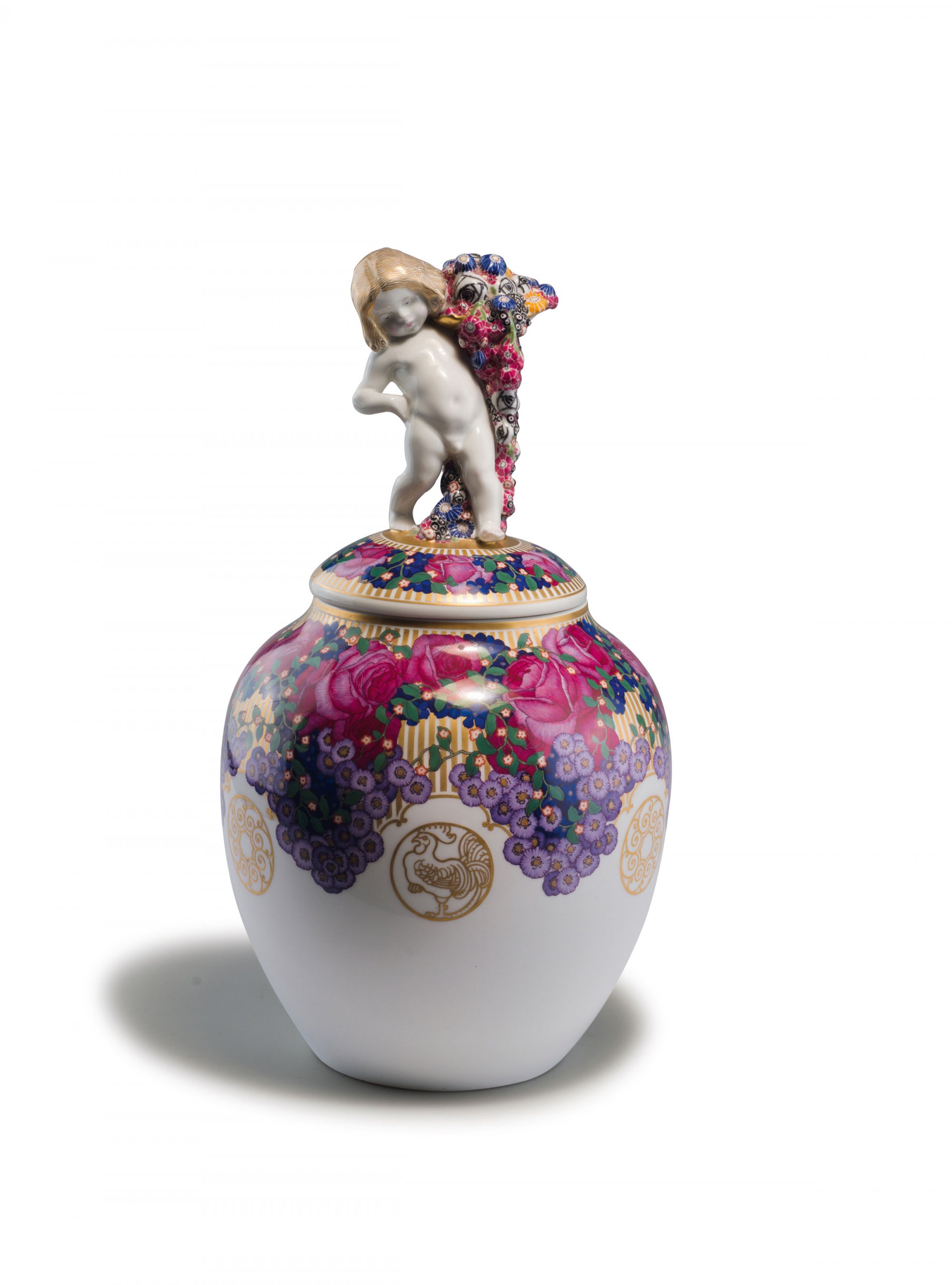 KPM Berlin. Covered vase, 1911. H. 42.5 cm; D. 24 cm. Cover designed by Martin Fritzsche, 1911. Made in 1912. Porcelain, white, glazed, polychromatic overglaze with gold by Adolf Flad. Cover marked: 146/141, 63, 28; vessel marked: Maker's mark, painter shop, jubilee mark 1763-1913, date mark M, W, 146/141, 28, N.