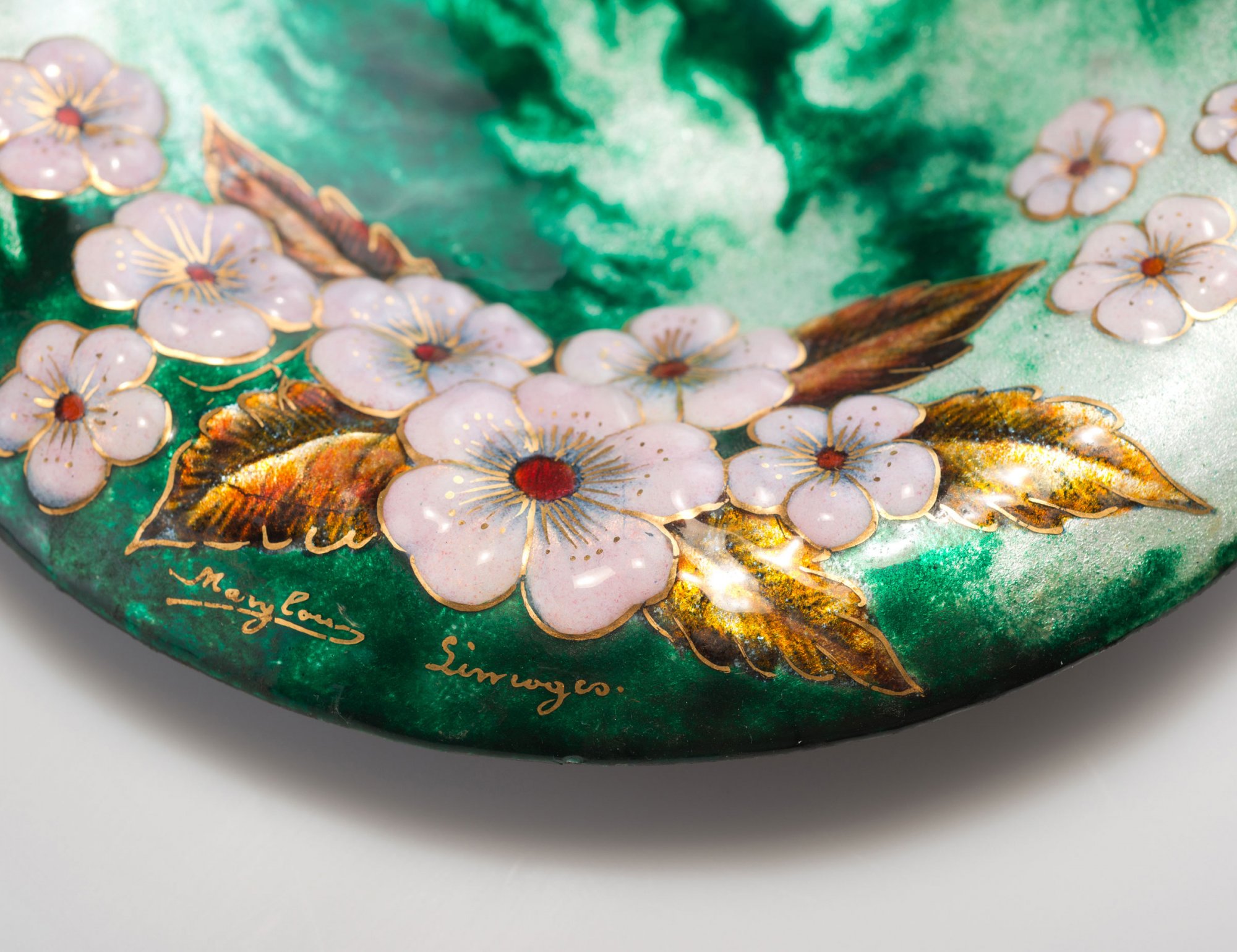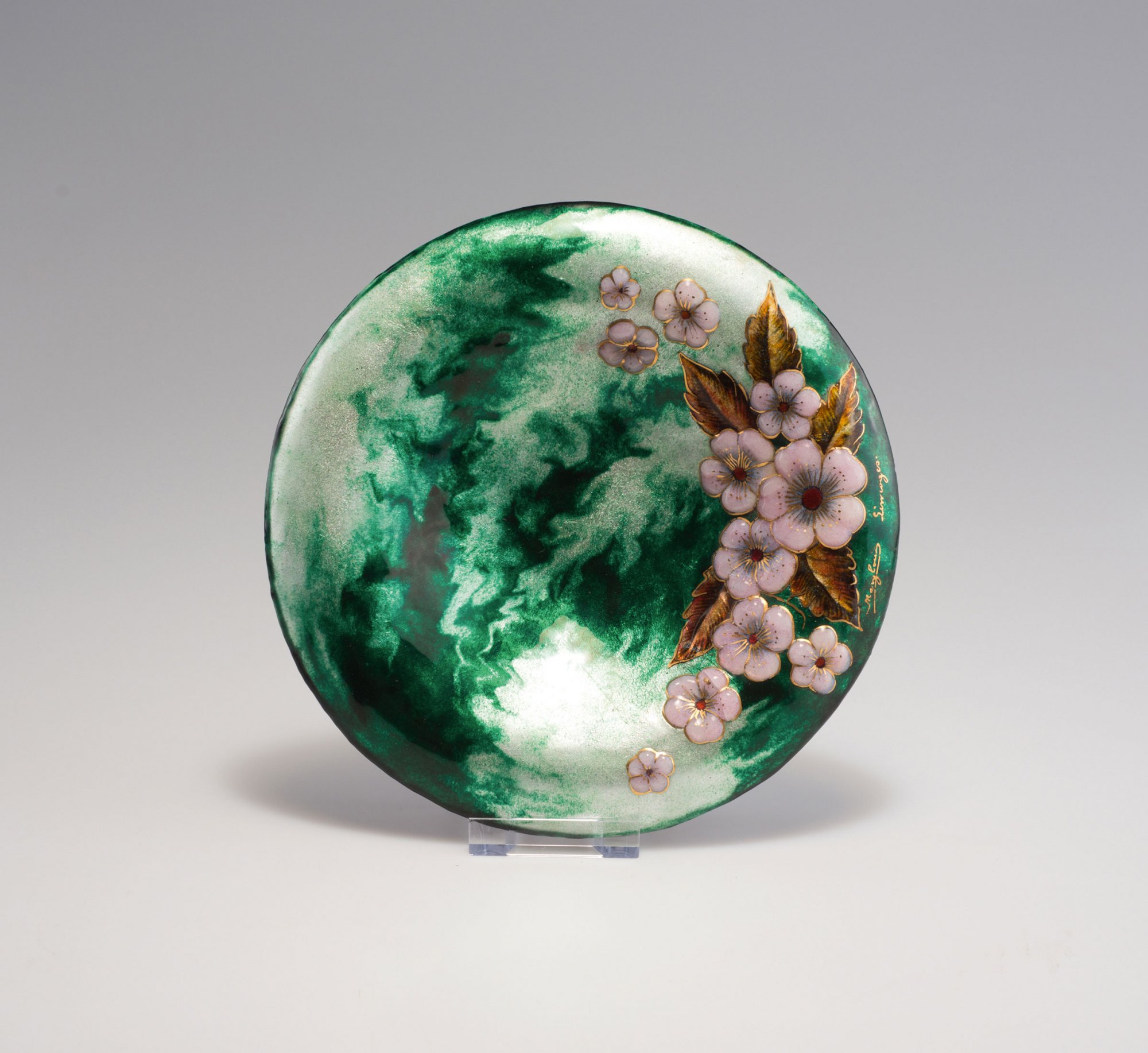 Marylou, Limoges. 'Fleurs de pommier' bowl, c1940. D. 20.6 cm. Sheet copper, applied metal foil, polychromatic enamel. Apple twigs. Signed: Marylou Limoges.