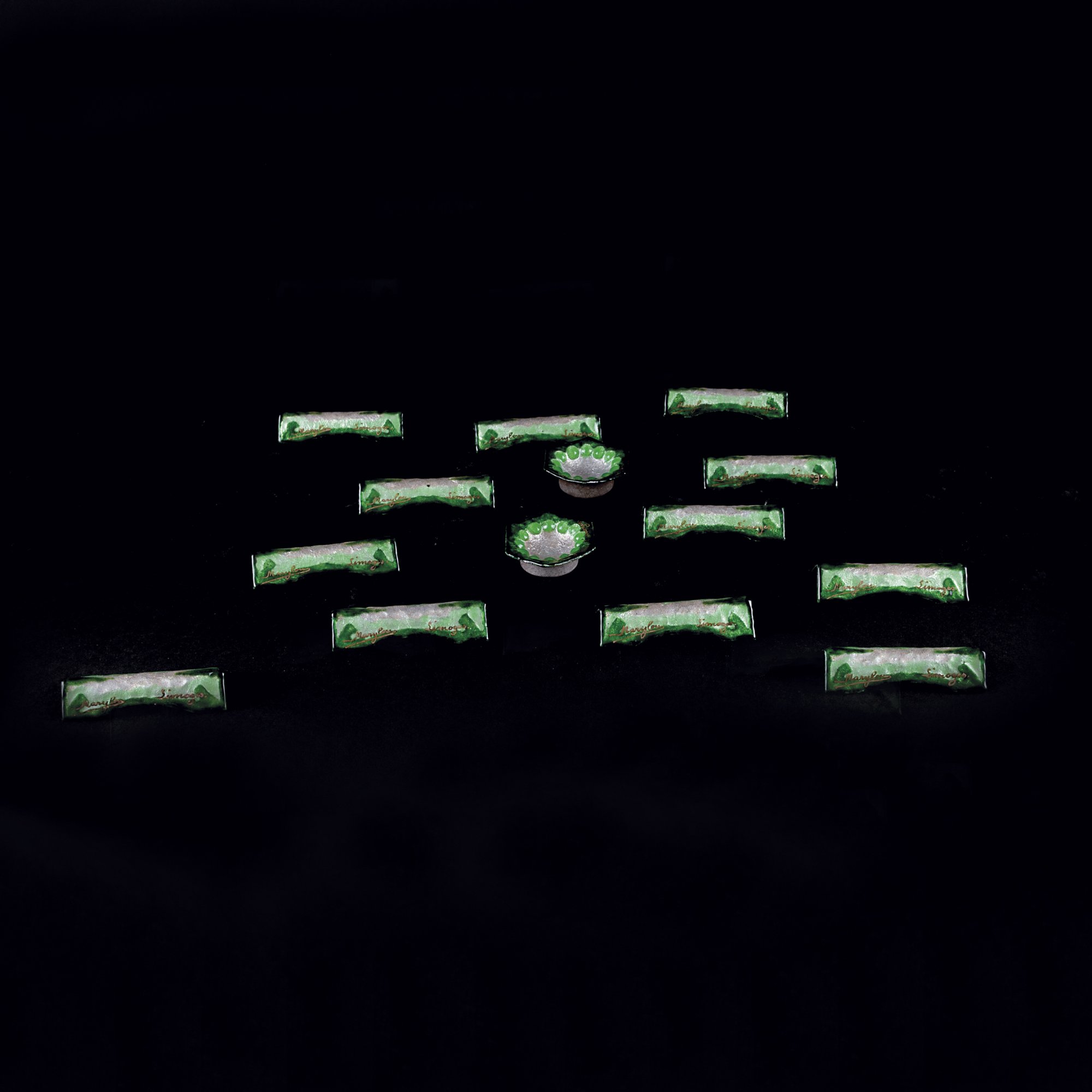 Marylou, Limoges. Twelve knife rests and two salt cellars, c1940. L. 8.2 cm; D. 5.5 cm. Copper sheet, applied metal foil, green, clear and purple enamel. Marked: Marylou Limoges.